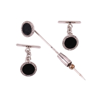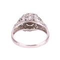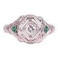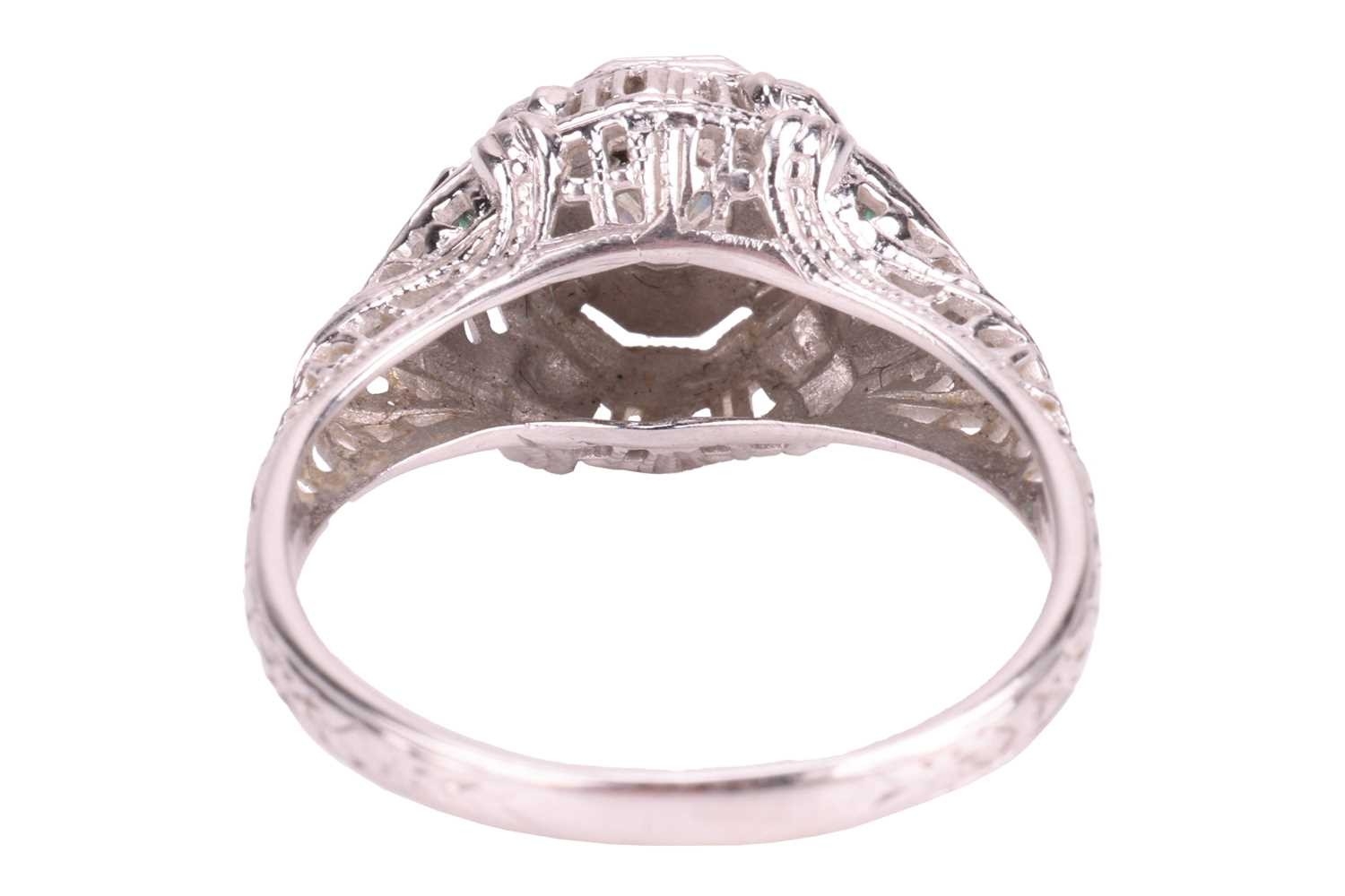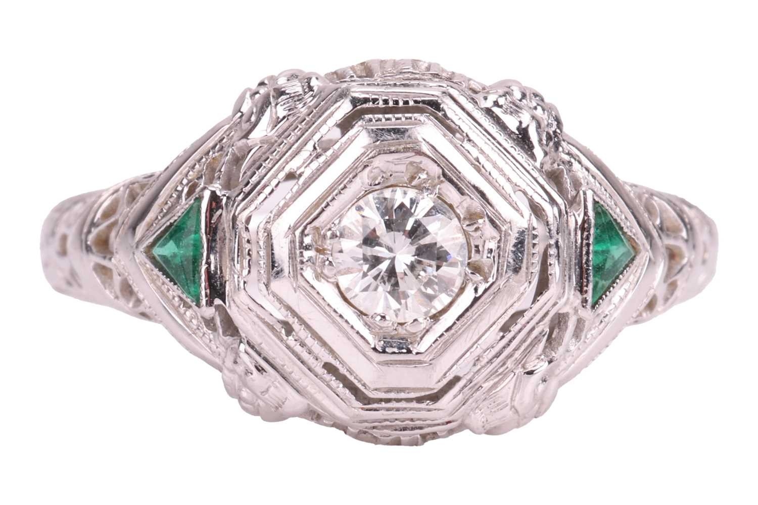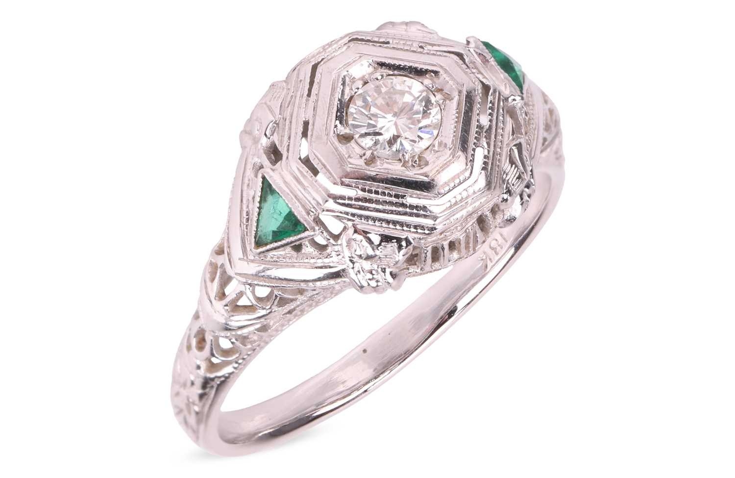 An Art Deco-style ring, centrally-set with a round brilliant-cut diamond in a geometric setting with millegrain detailing, flanked by two triangular-cut green pastes, to pierced tapering shoulders with foliate detailing, in white metal marked ‘18K’, size M1/2; 2.9 grams.