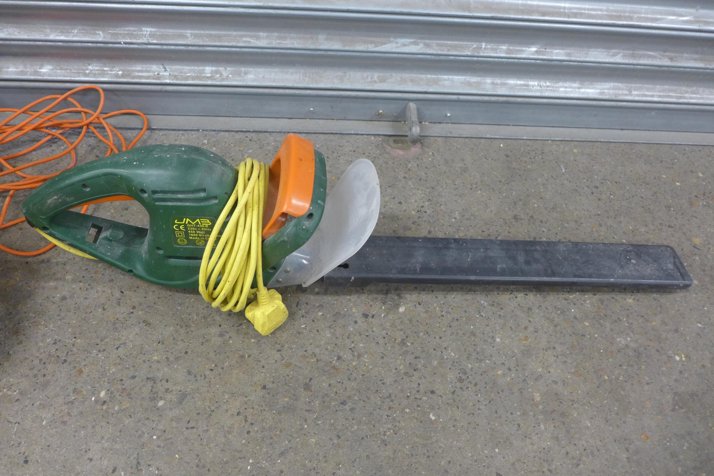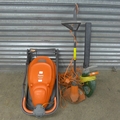 Three electric garden tools - a Flymo Easi Glide 330VX, a VMB GHT-450-B, 240V hedge trimmer and a Flymo MET 260-4, 240V strimmer