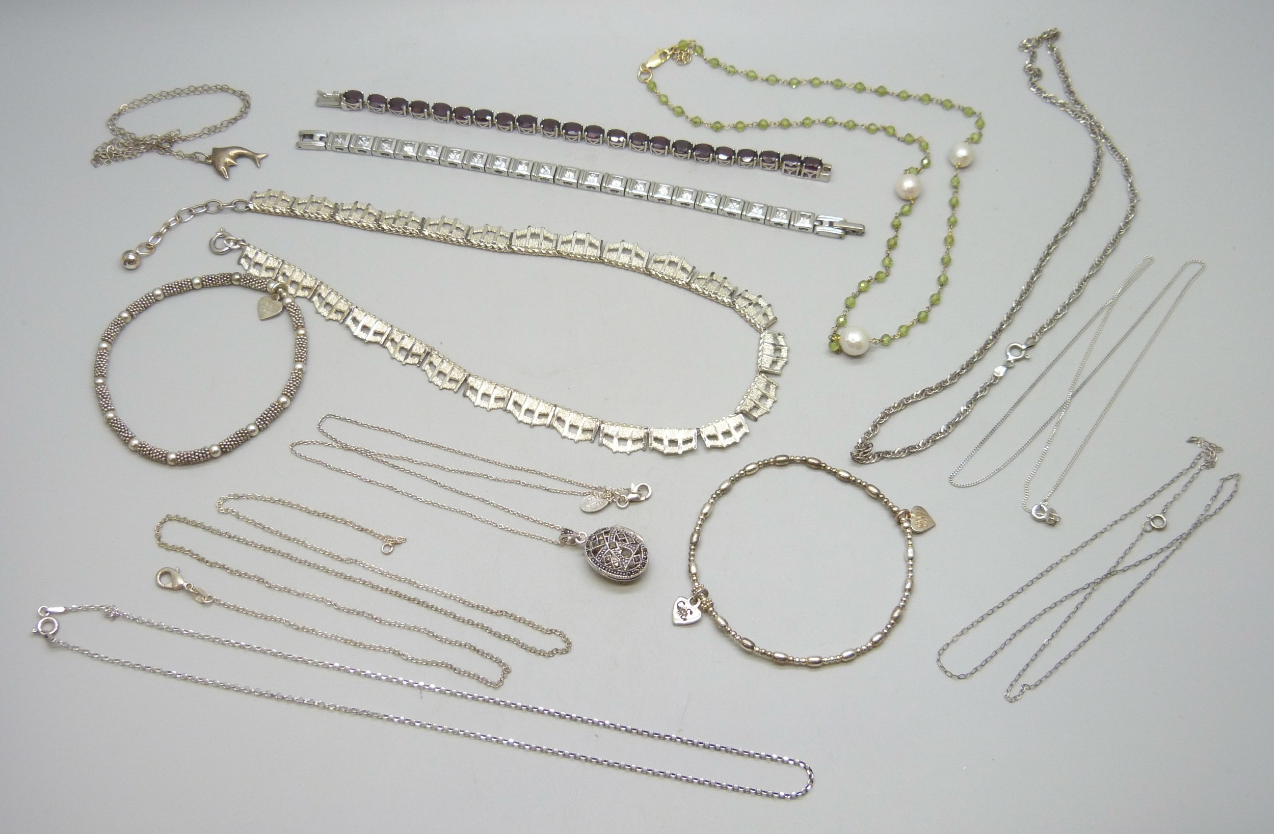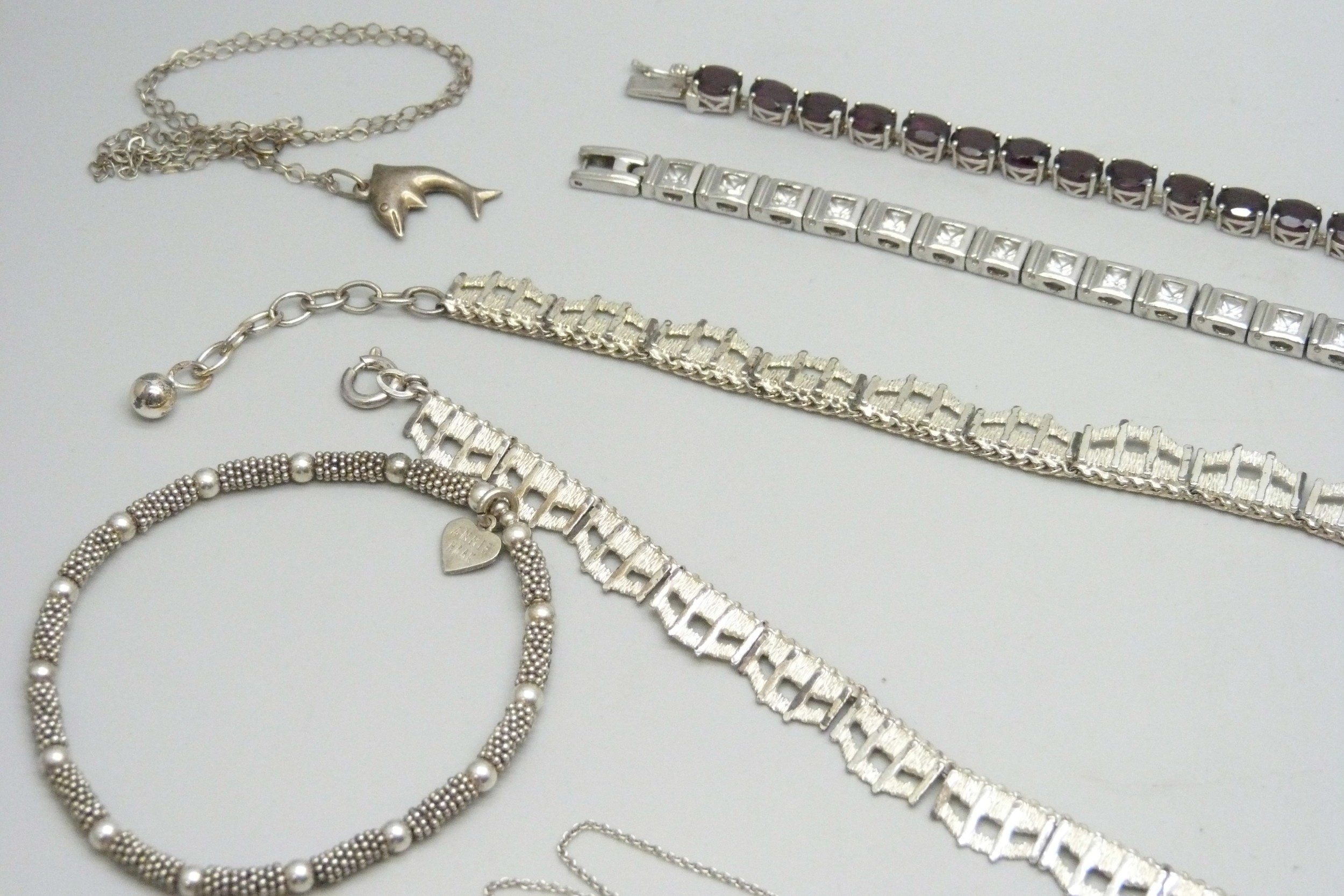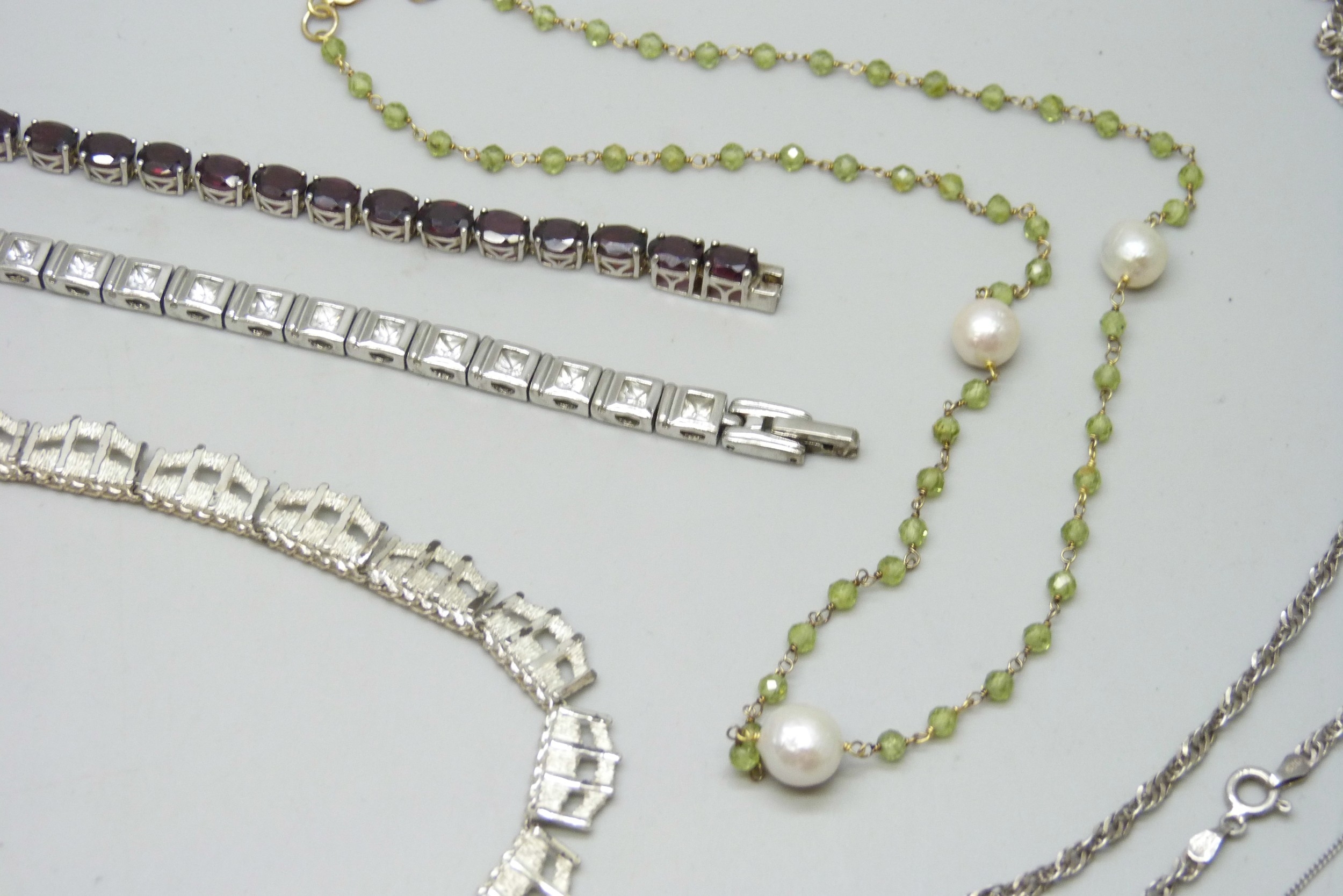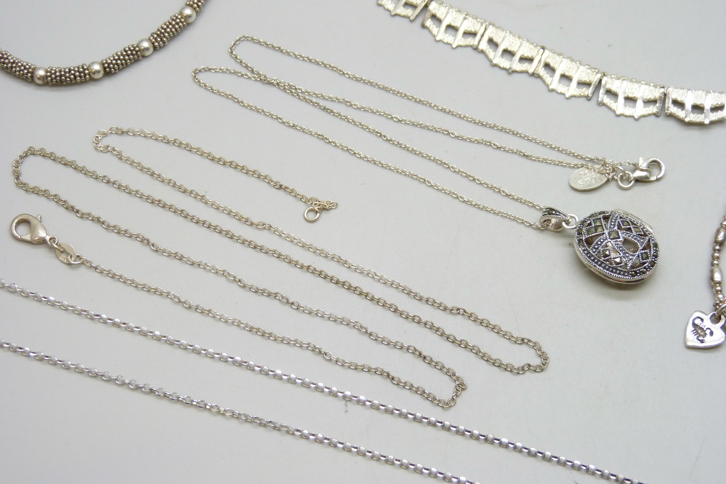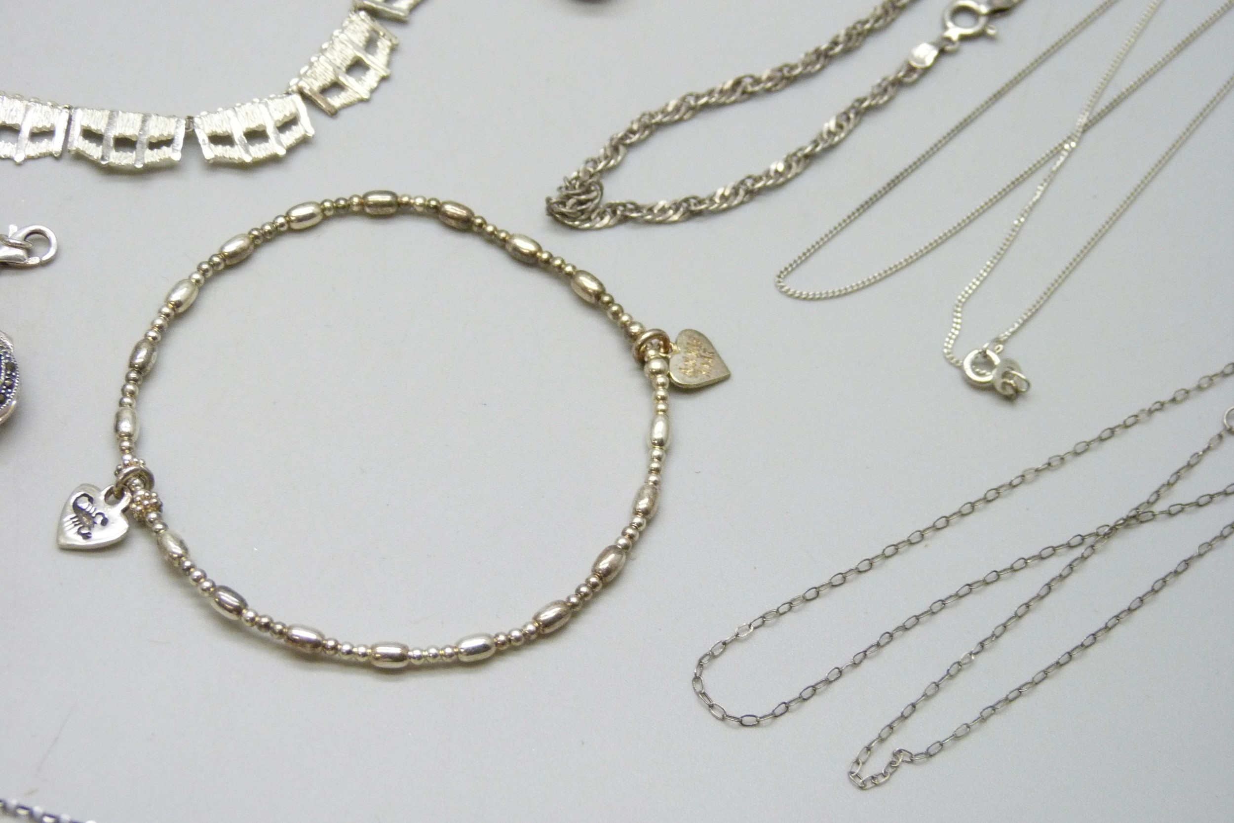 A collection of silver jewellery including a Brutalist style necklace, 90g total