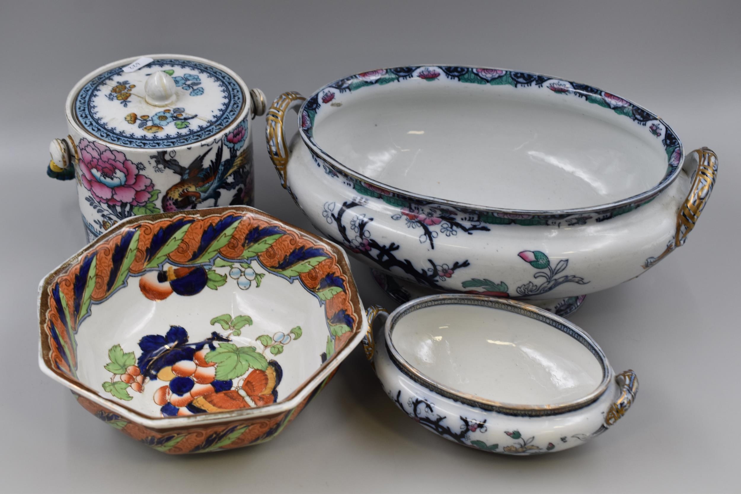 Losel ware biscuit barrel 5" x 5" (lid has a crack), Losol ware Armado bowl 8" diameter, 2 Late Myers turrines largest 12" long