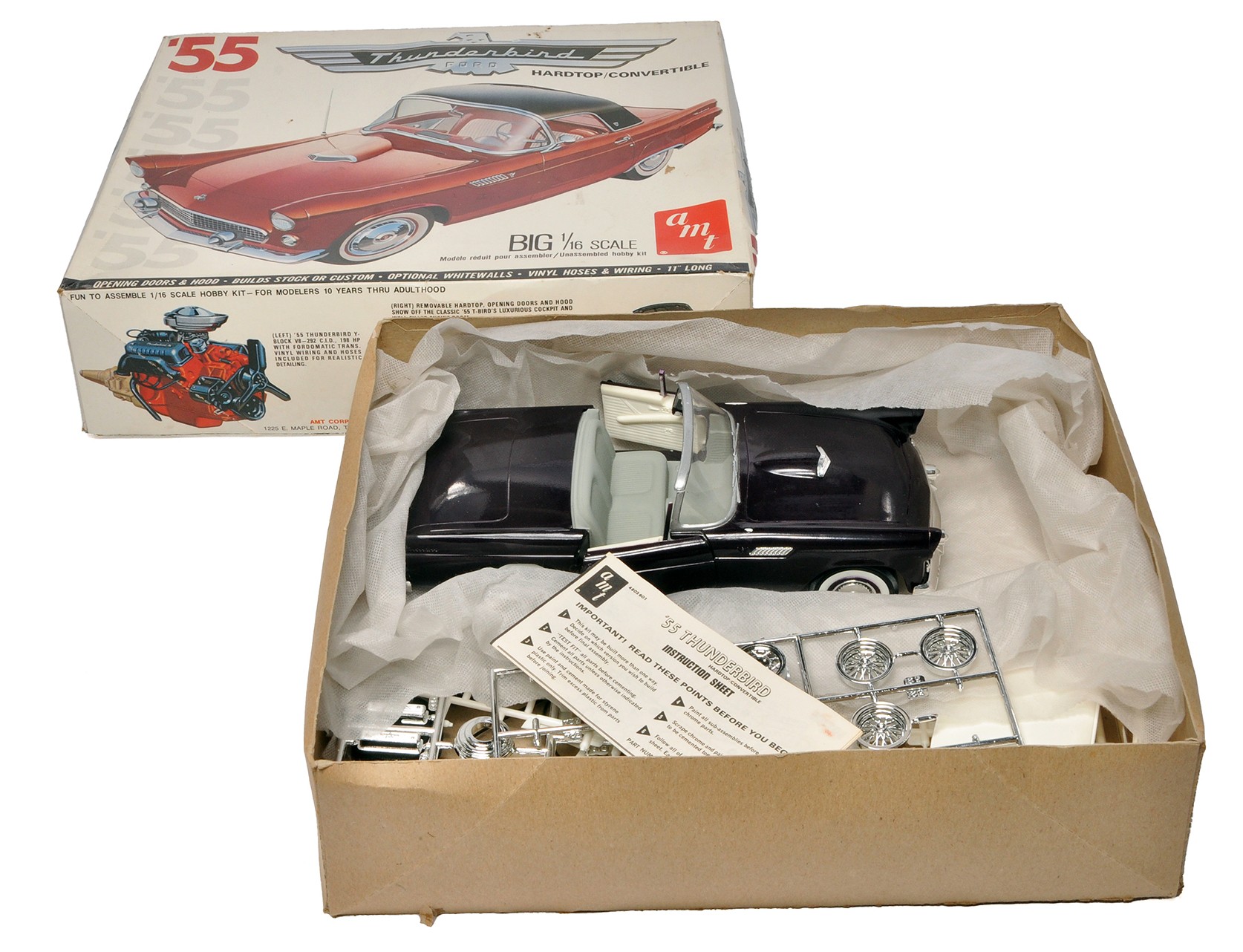 AMT 1/16 plastic model vehicle kit comprising 1955 Ford Thunderbird. Predominantly built with remaining kit contents still in box.