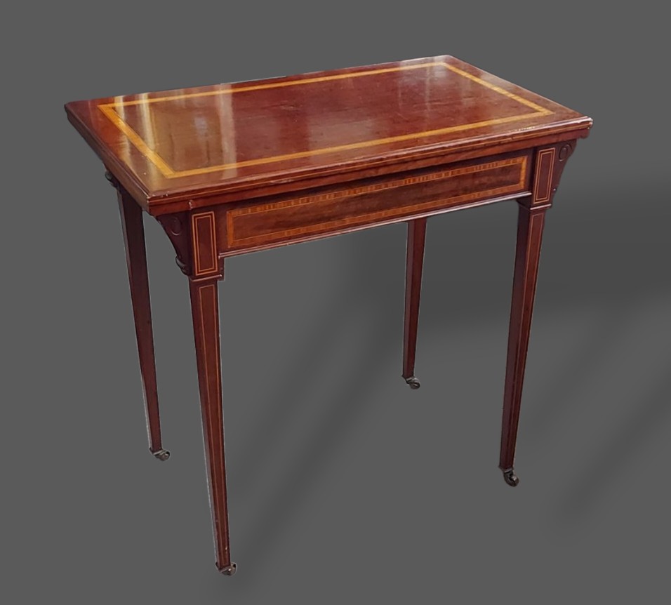An Edwardian mahogany satinwood inlaid card table, the hinged top enclosing a baize lined interior raised upon square tapering legs with brass caps and casters