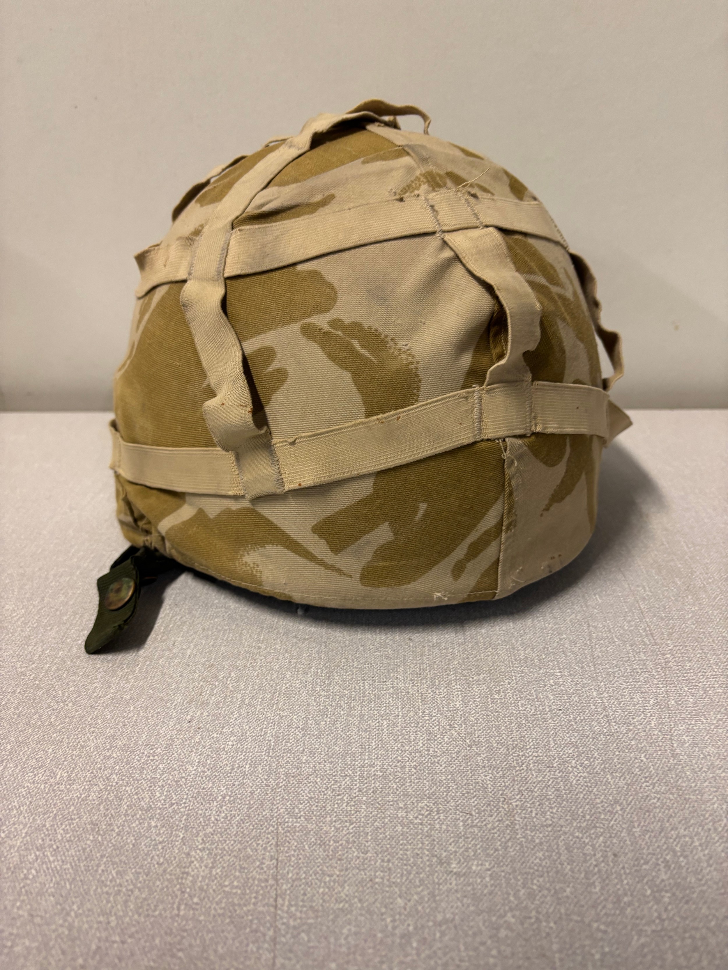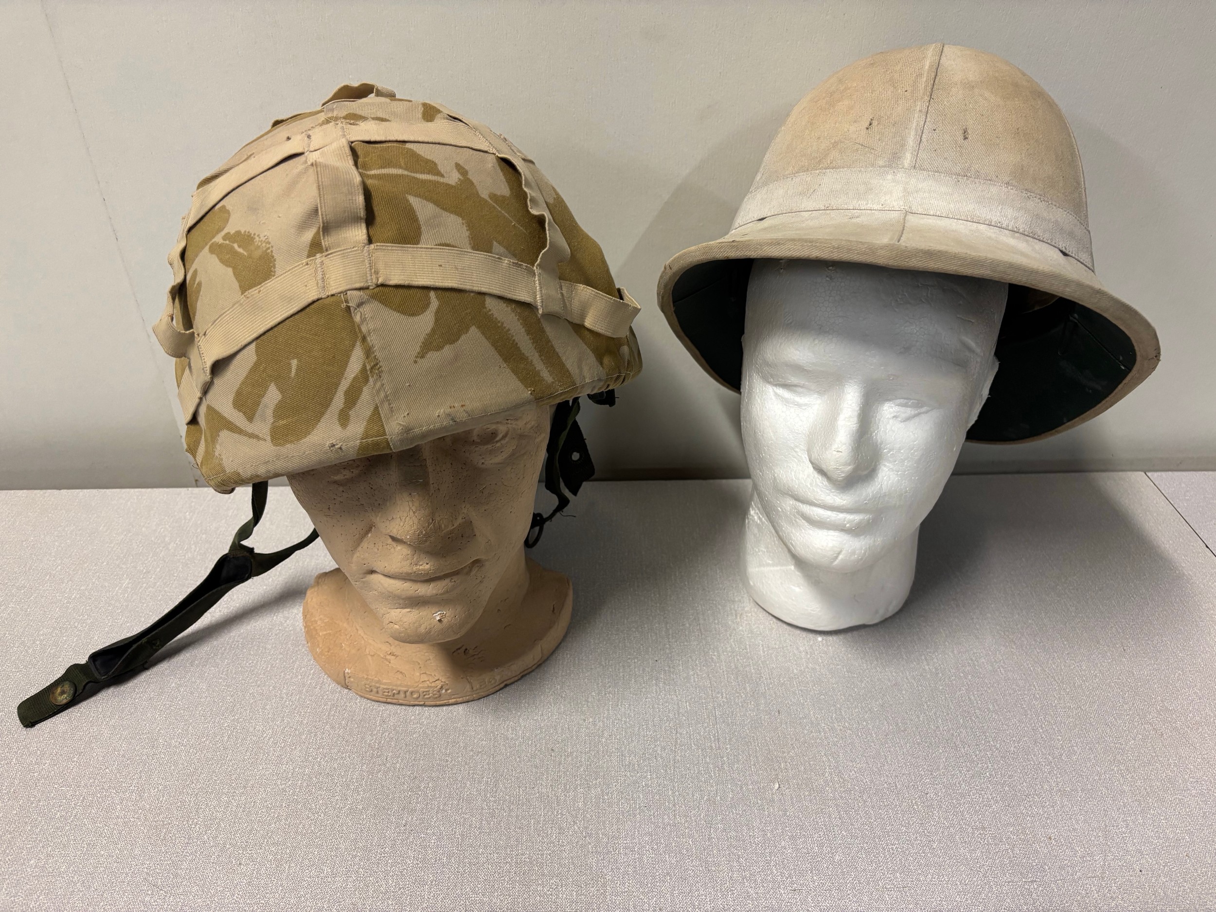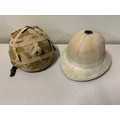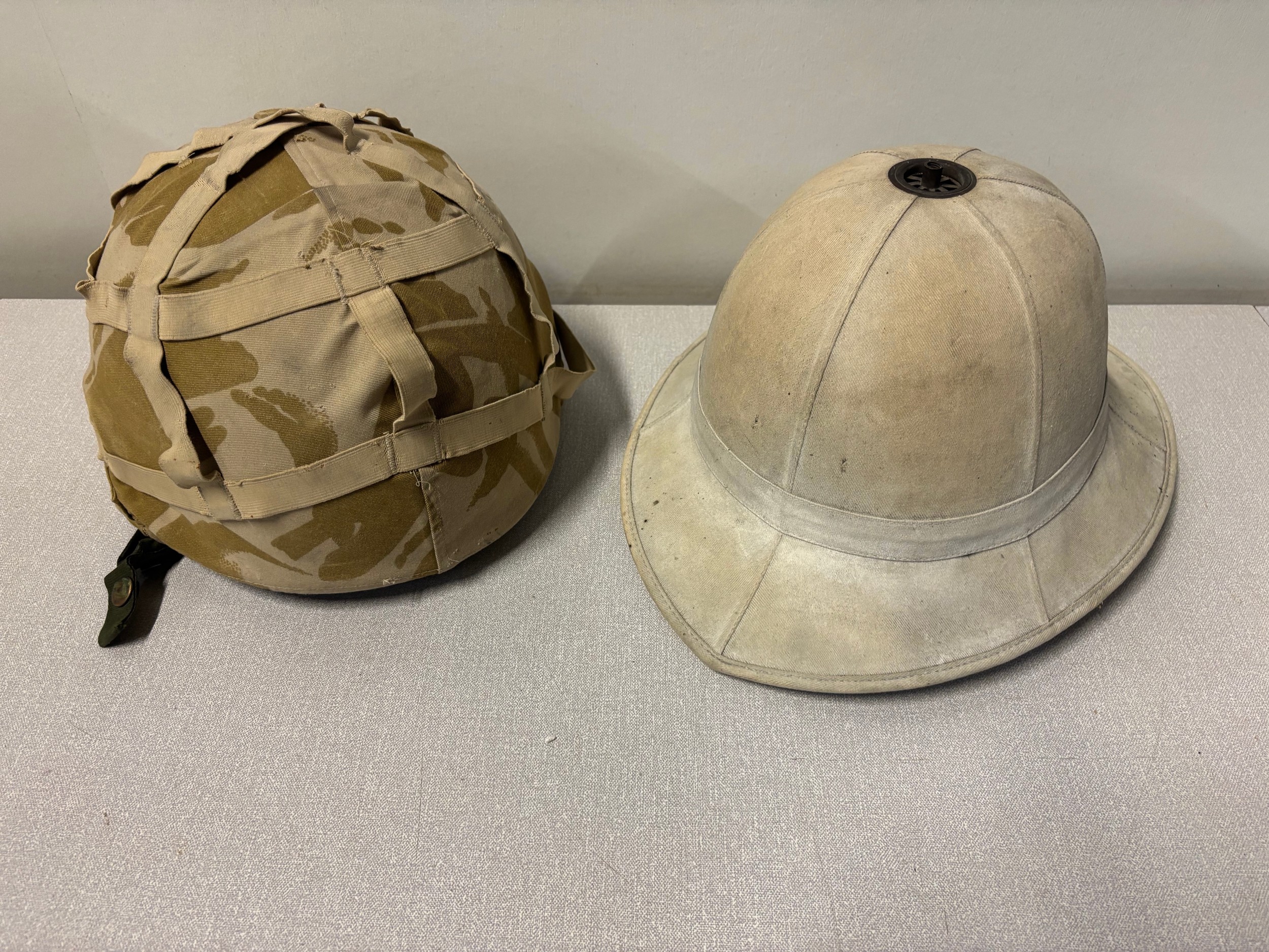 British army desert DPM helmet along with a pith helmet.