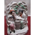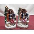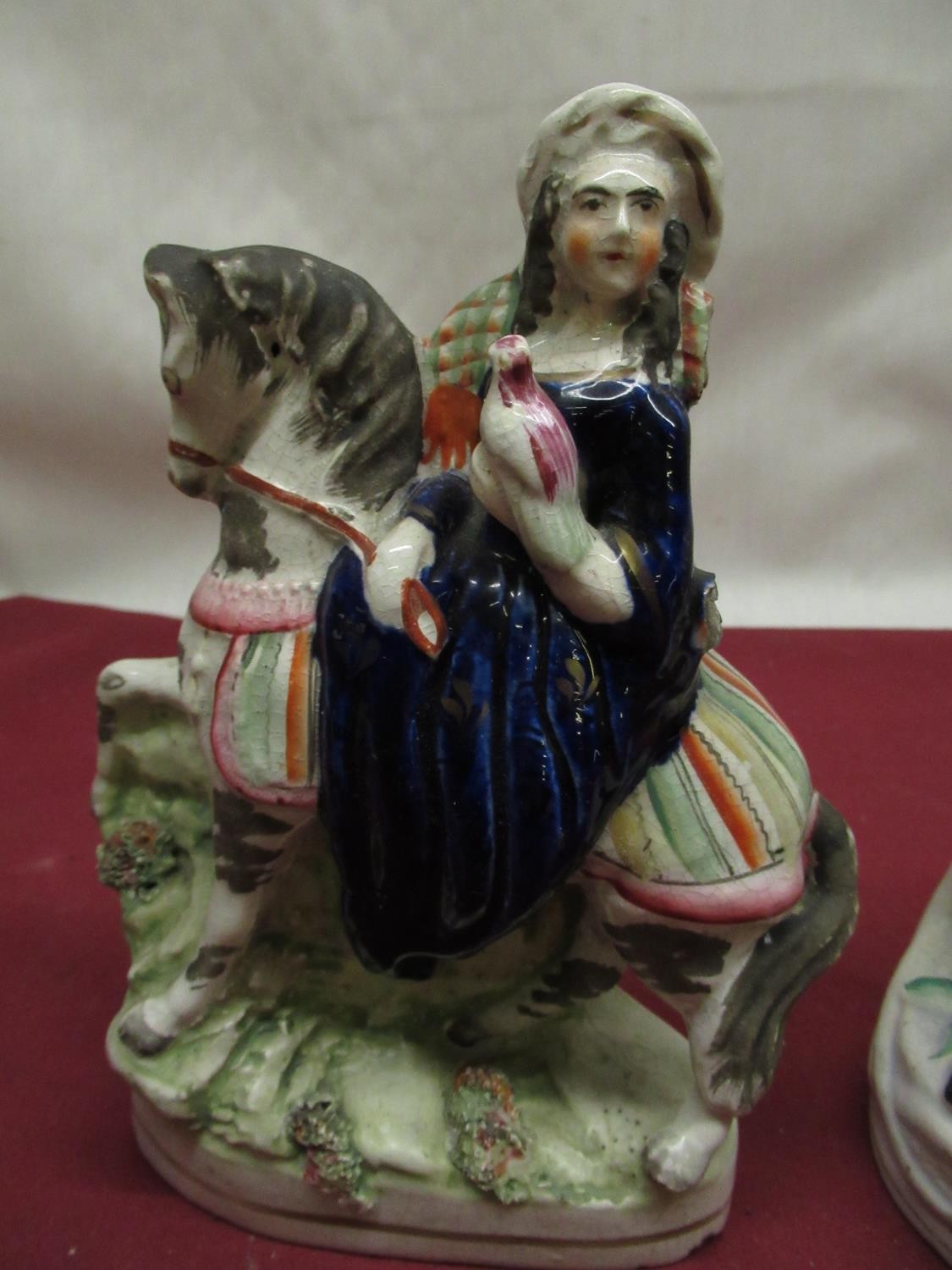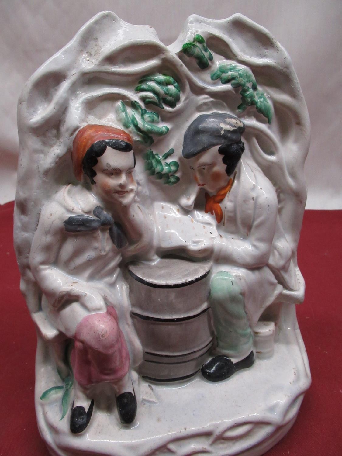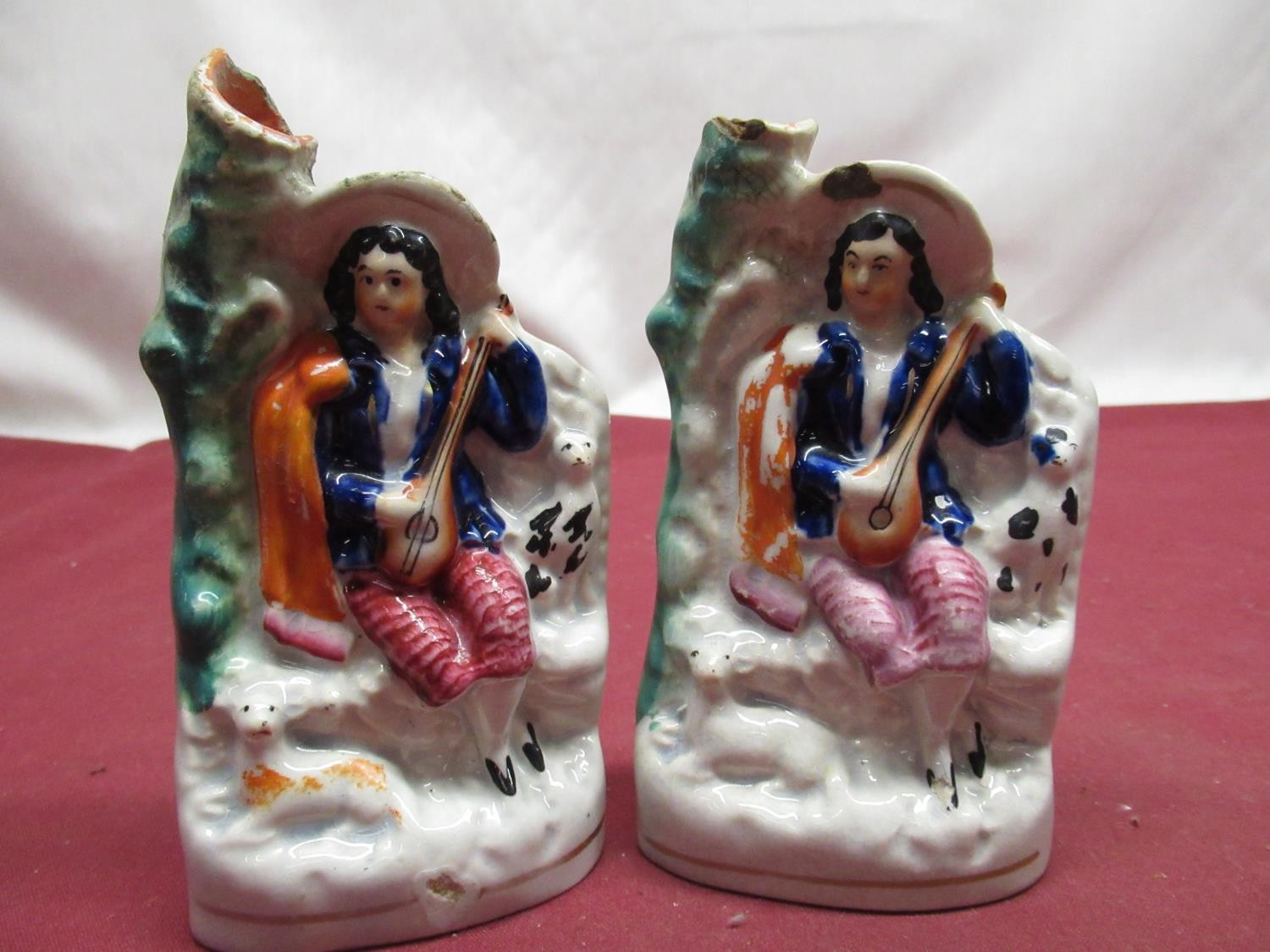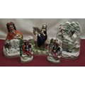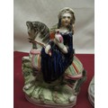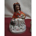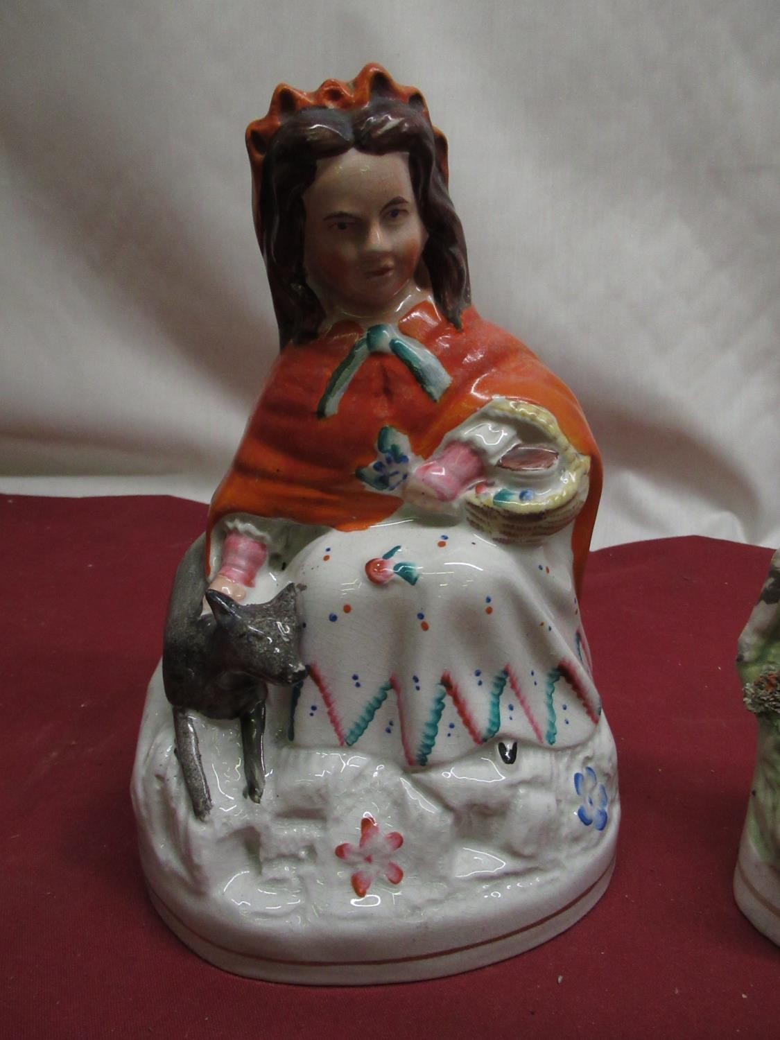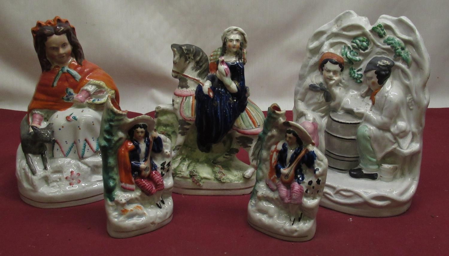 C19th Staffordshire figure of Little Red Riding Hood H21.5cm, pair of C19th Staffordshire spill vases H15cm, two other Staffordshire pottery groups (5)