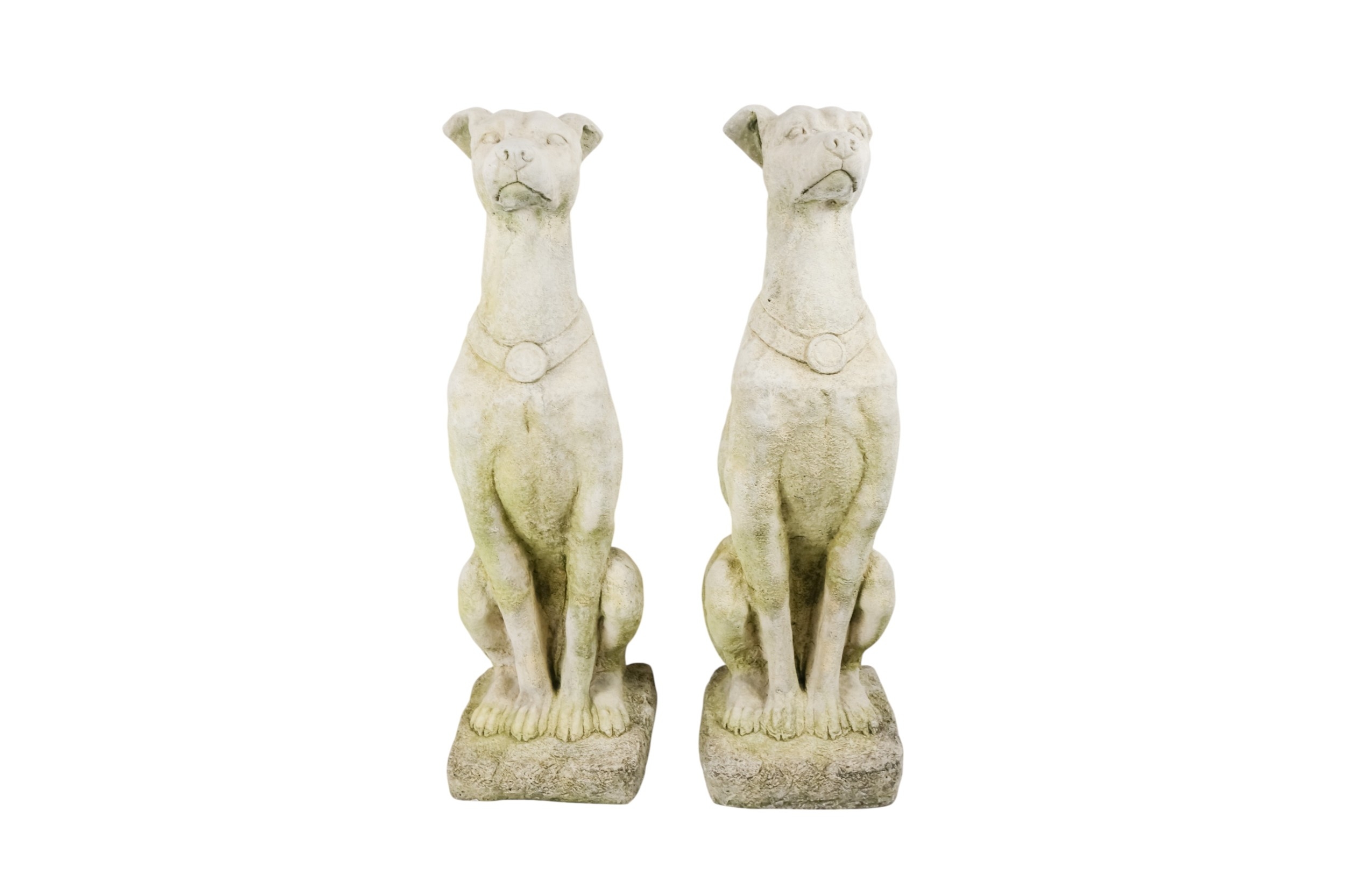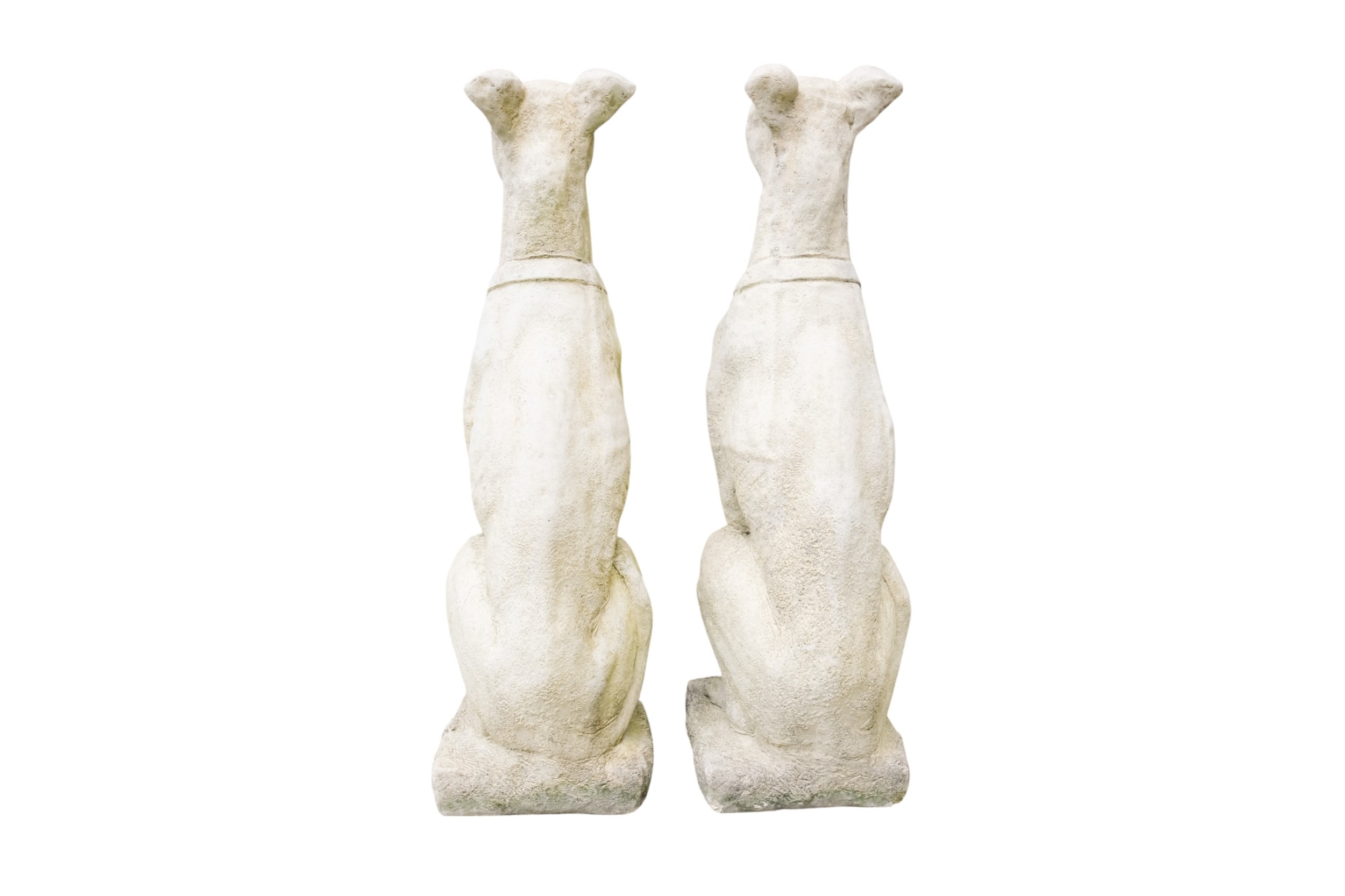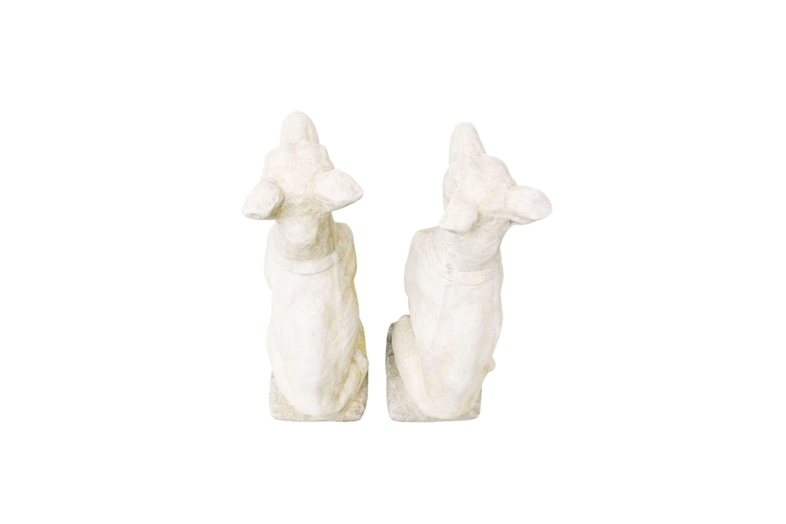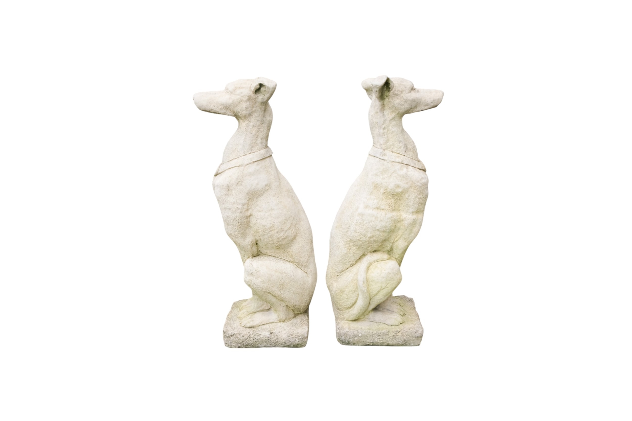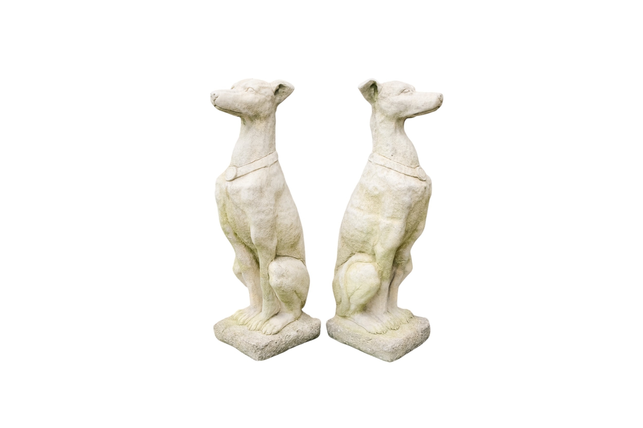 A pair of large reconstituted stone gate capitals - modelled as greyhounds, 76cm high. (2)