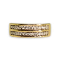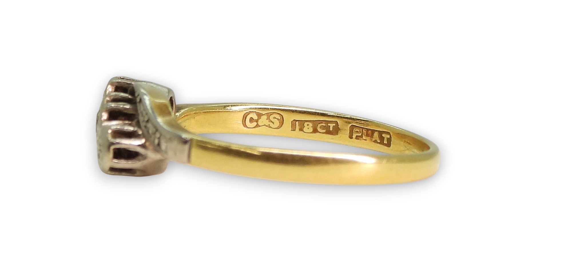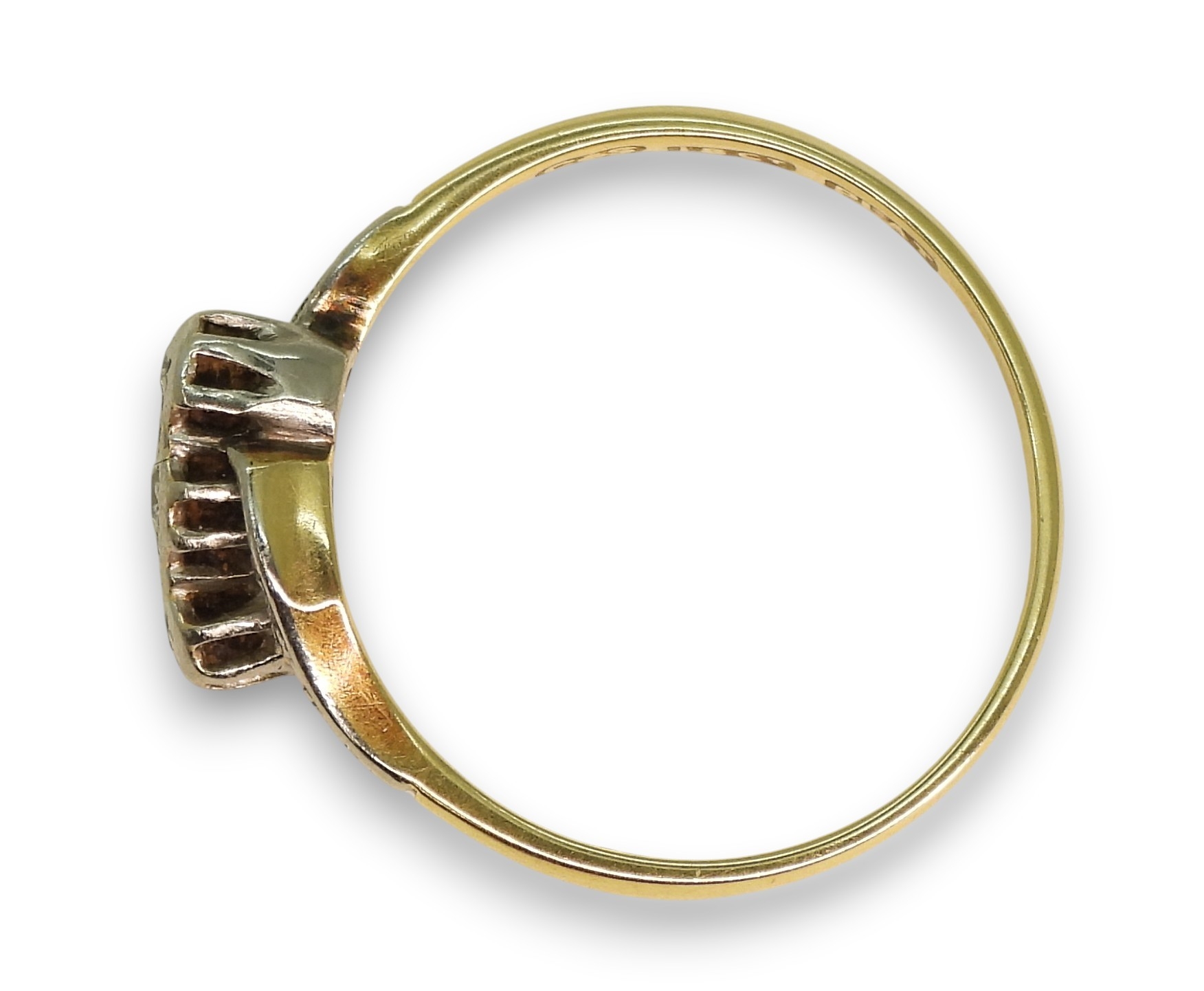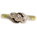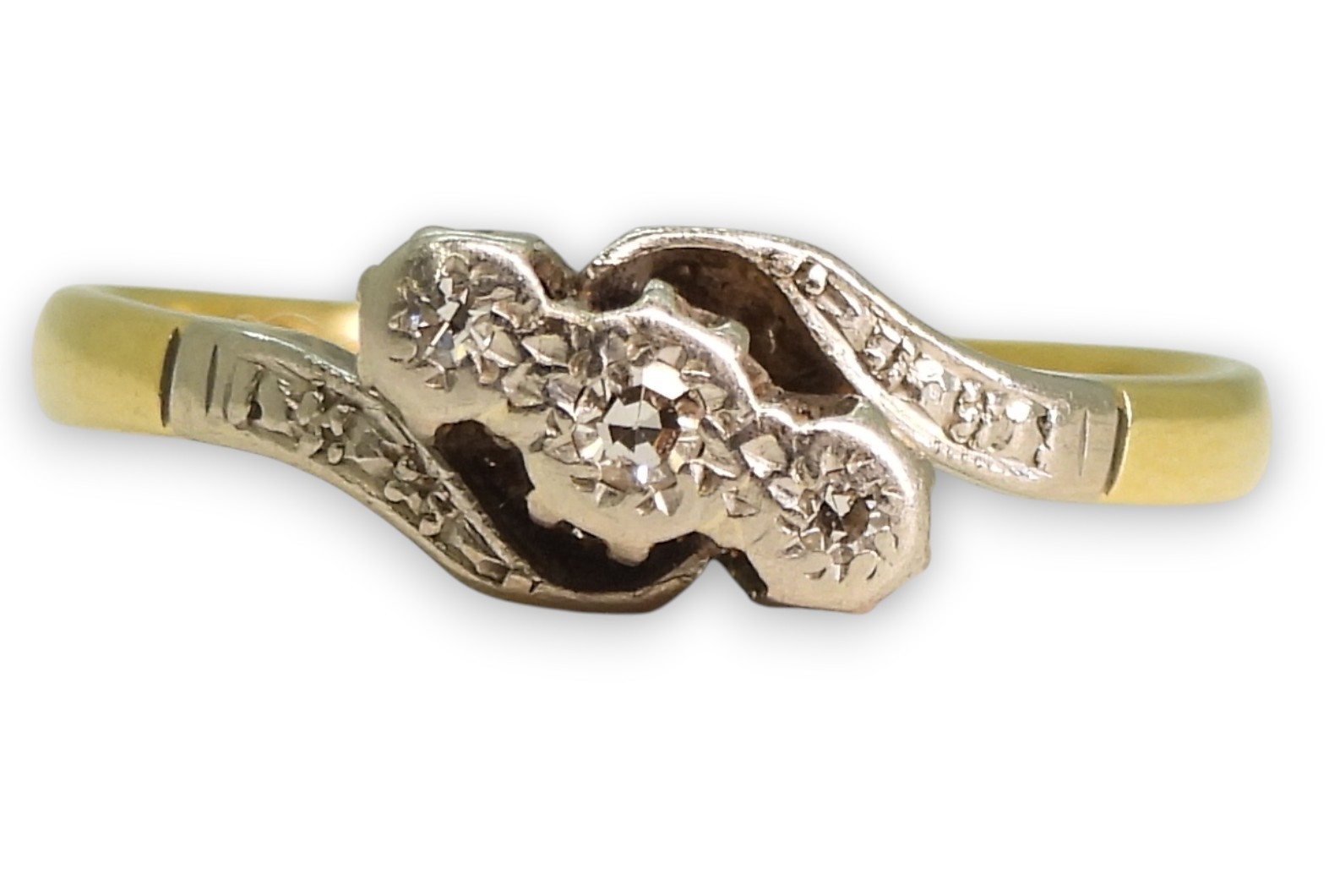 An 18ct gold vintage illusion set three stone diamond ring on a twist, size M1/2, 2.1gms