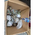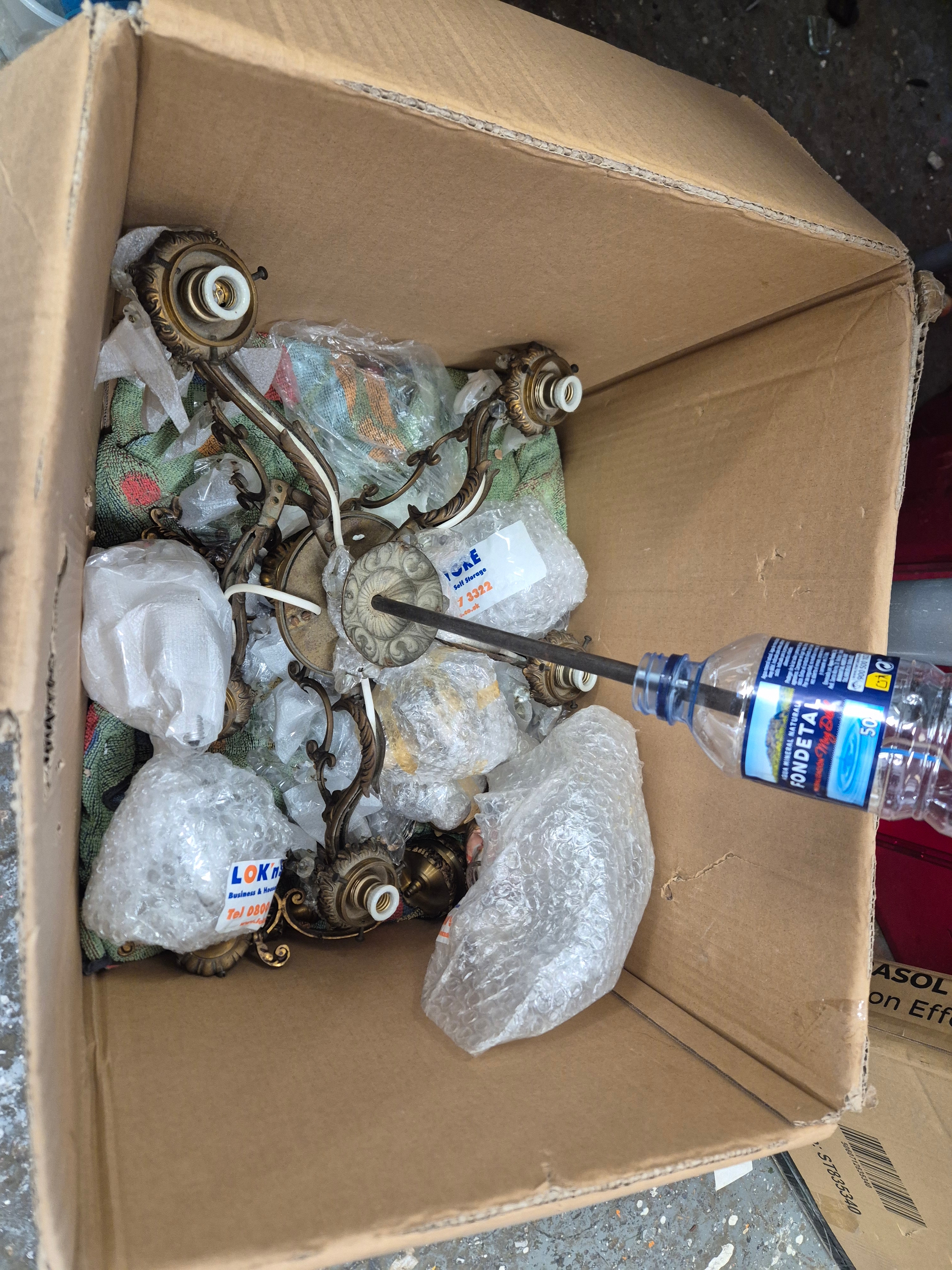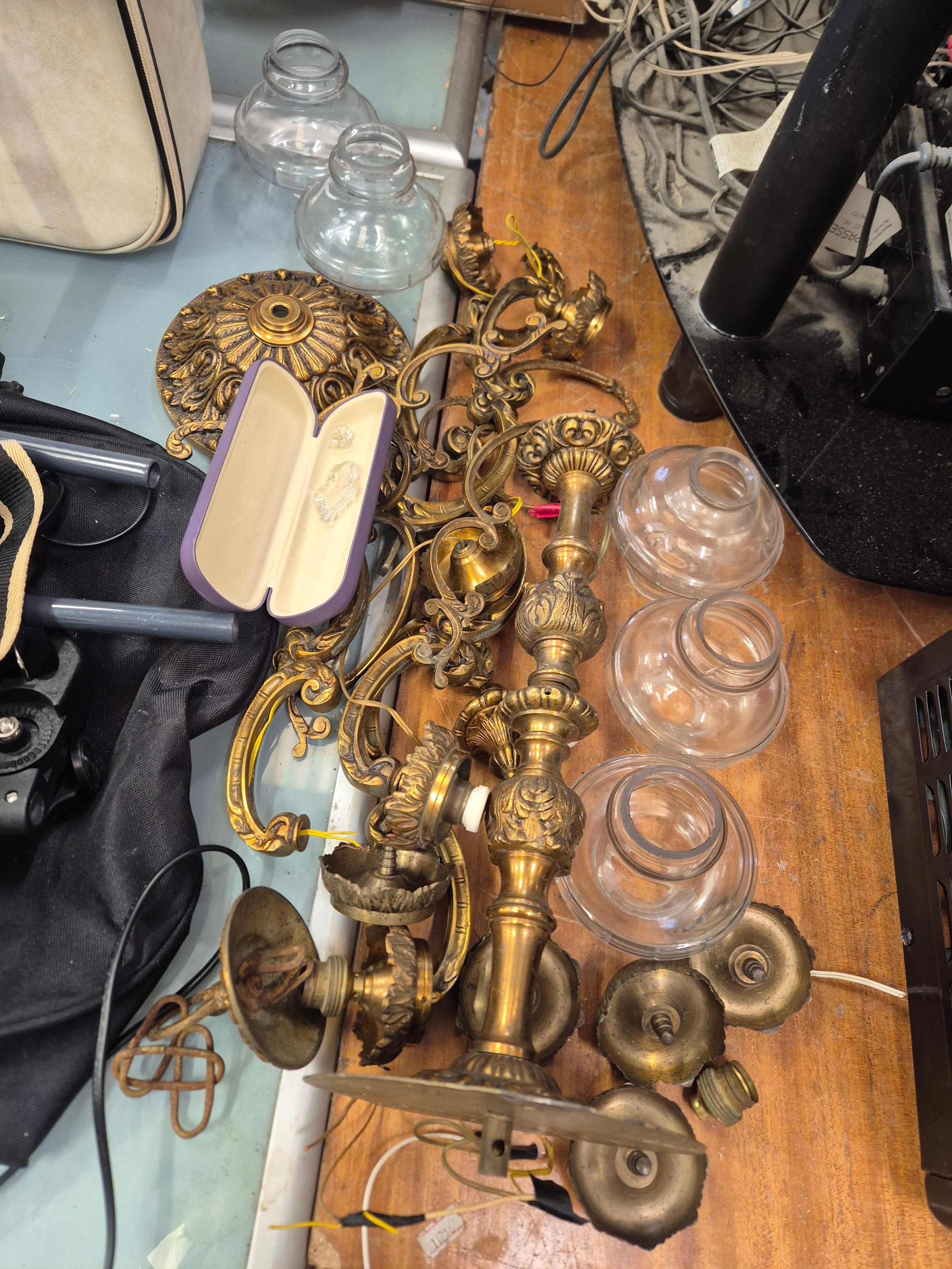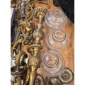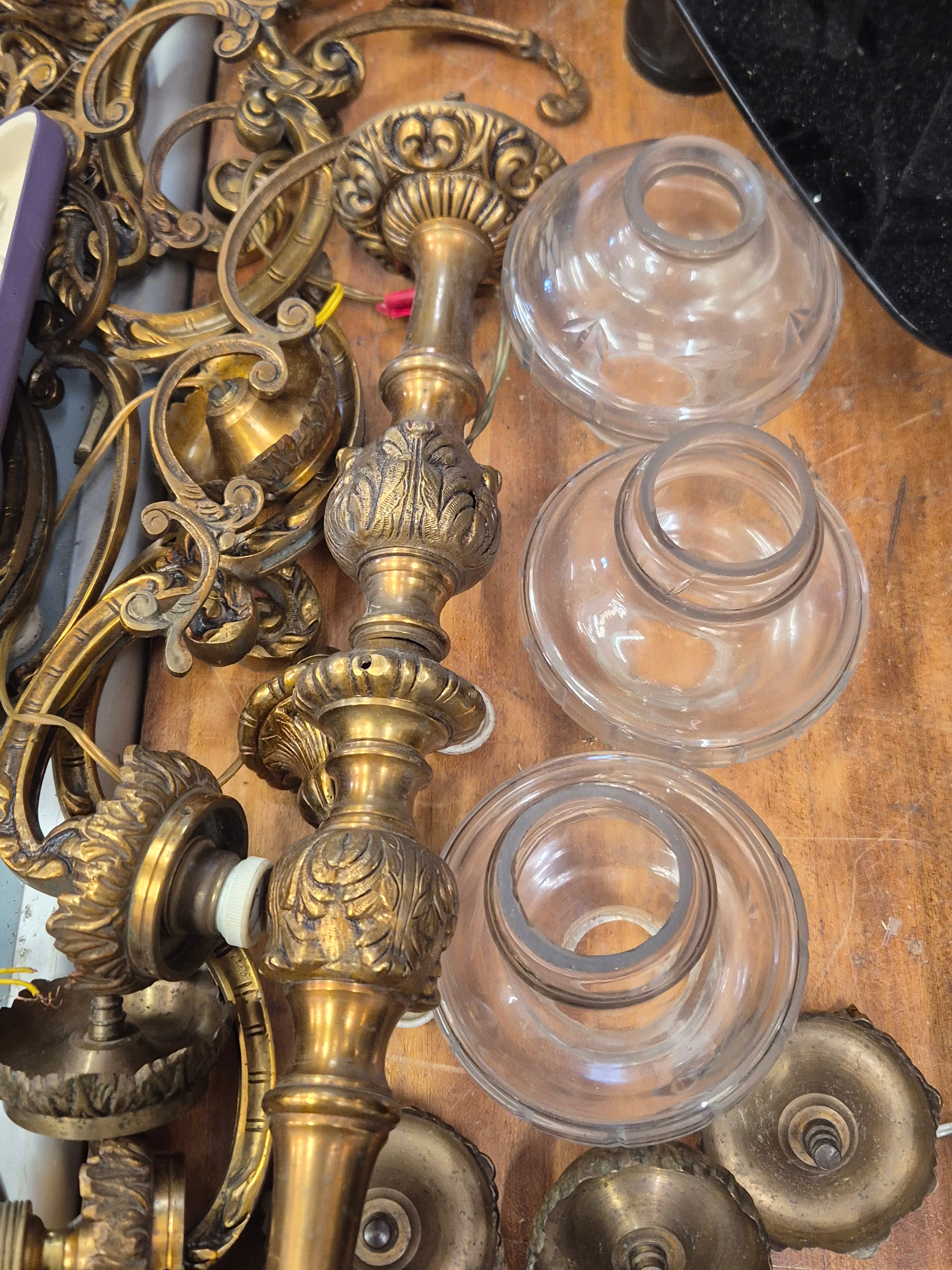 2 ornate brass chandeliers for spares or repair with glass shades