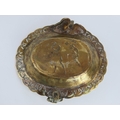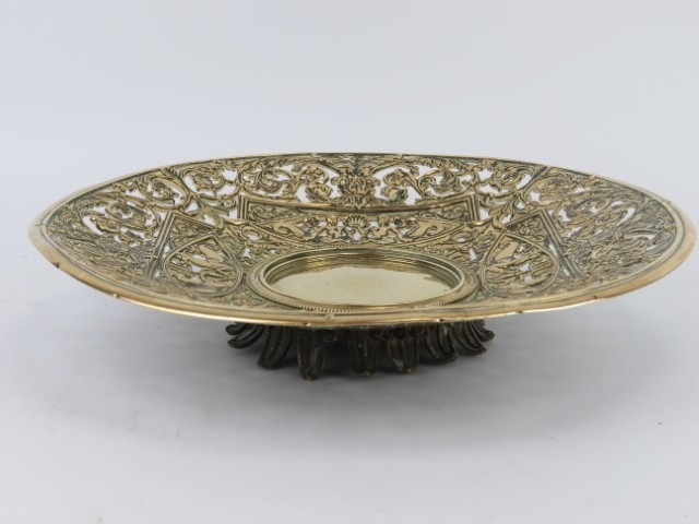 An ornate brass openwork decorated bowl, a French brass basket with grapevine handle and a brass ink blotter, 19th century. (3 items) Bowl: 29.4 cm diameter.