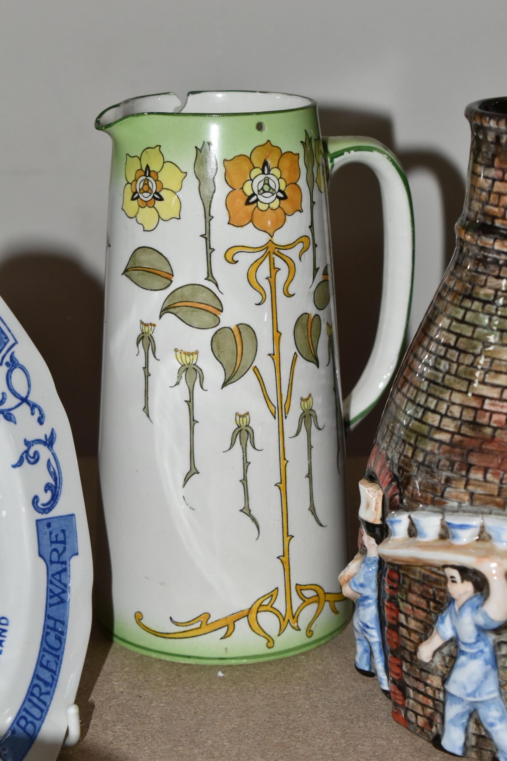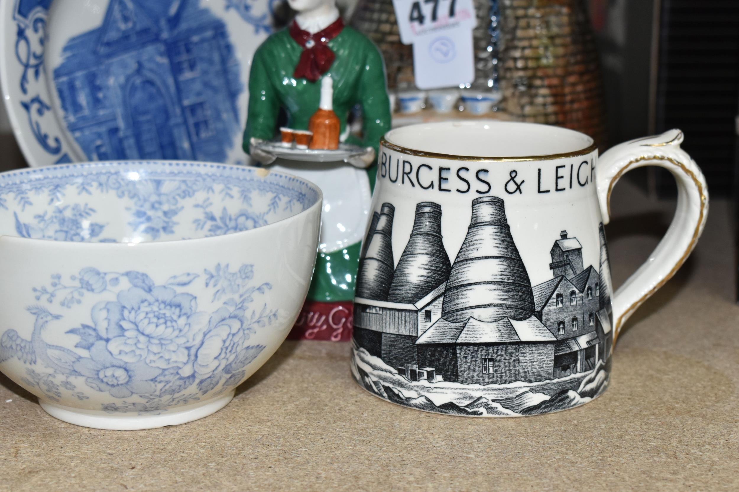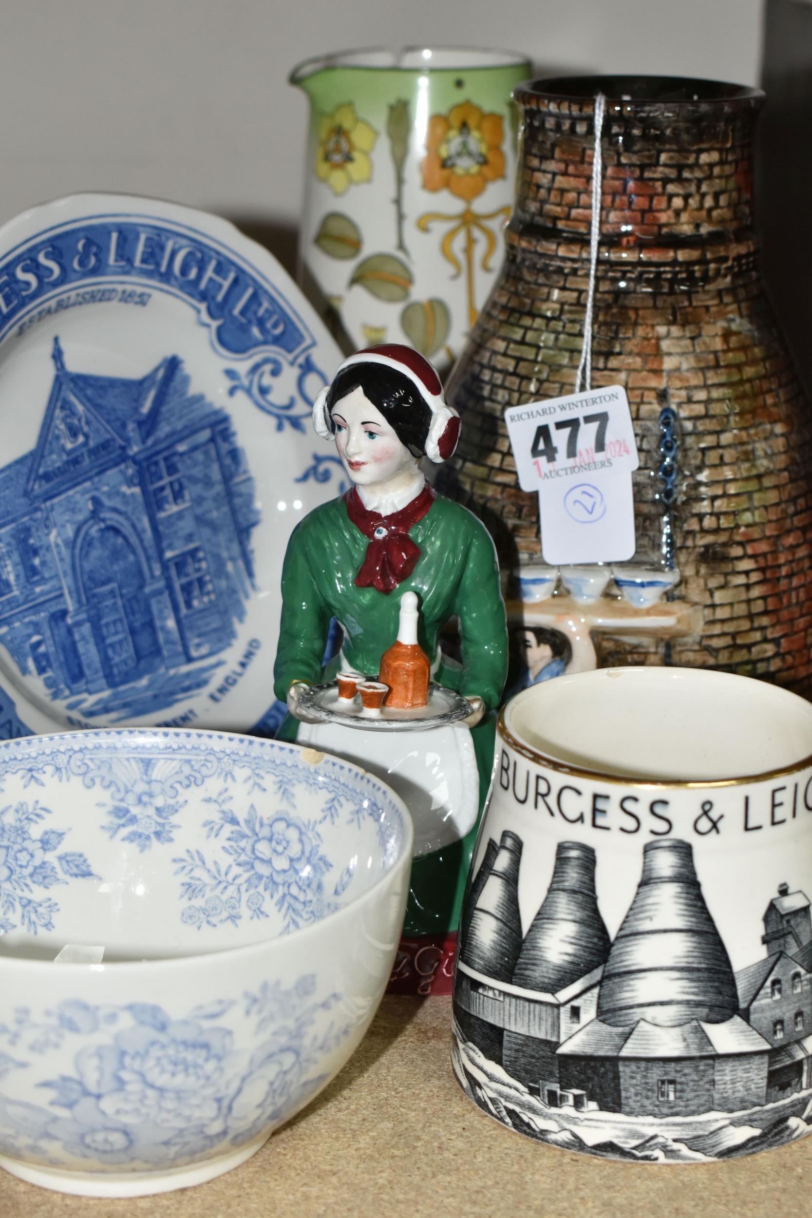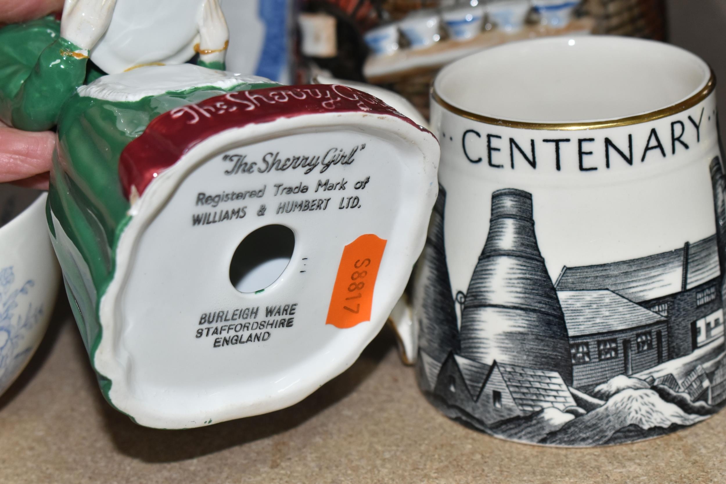 A GROUP OF BURGESS & LEIGH BURLEIGH WARE, comprising a vase in the form of a bottle kiln, 'The Sherry Girl' figure (repaired across wrists and plate), a blue and white 'Burgess & Leigh Ltd' advertising bowl, a Burgess & Leigh 1851-1951 Centenary mug, a Tudor pattern water jug (missing lid) and an Asiatic Pheasant sugar bowl (with several chips) (6) (Condition Report: generally ok, obvious specific damage as stated in description)