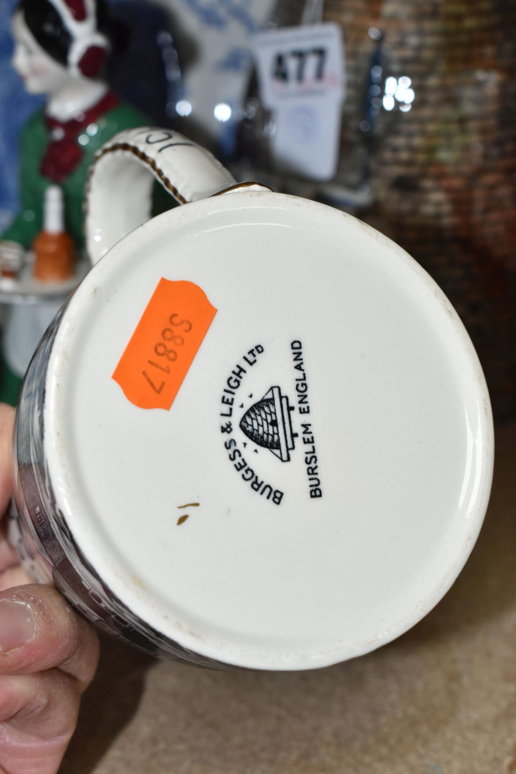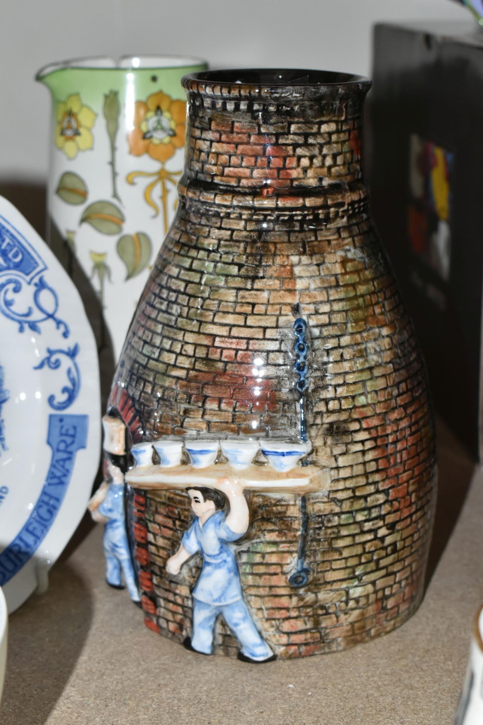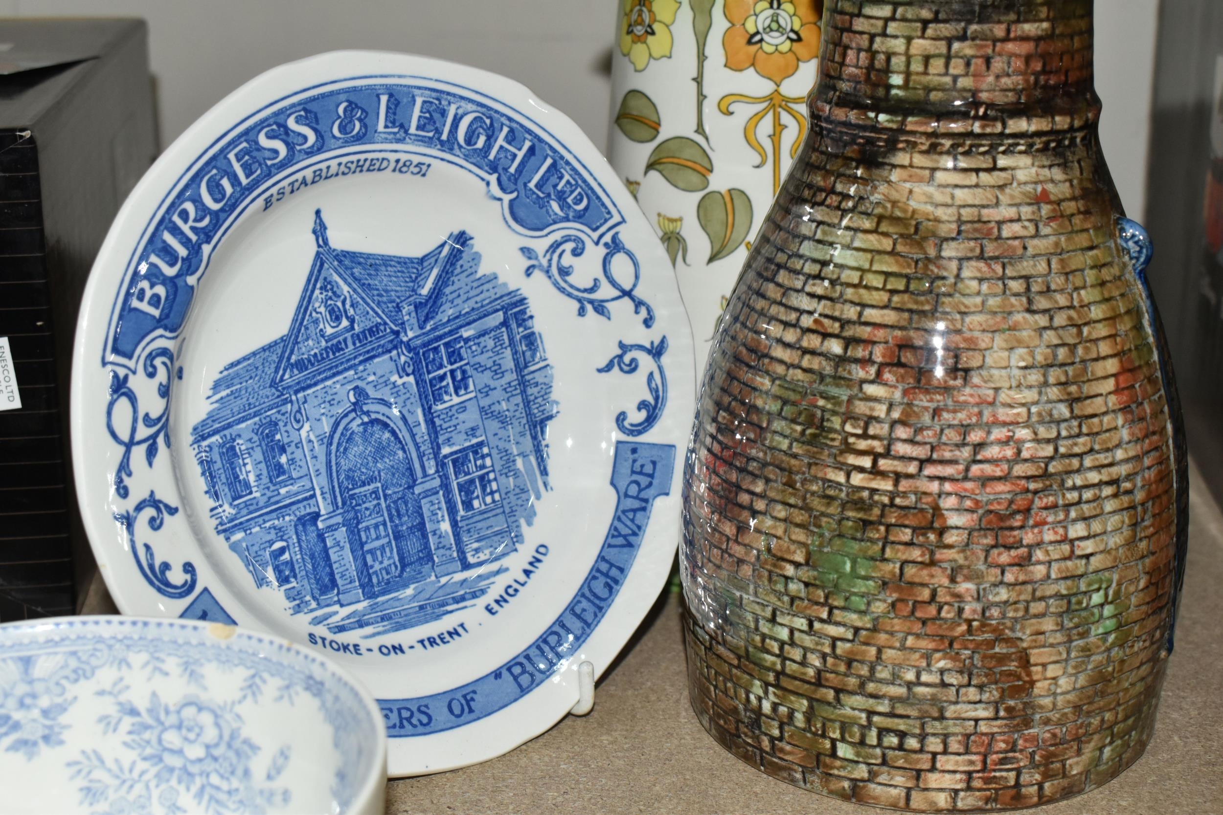 A GROUP OF BURGESS & LEIGH BURLEIGH WARE, comprising a vase in the form of a bottle kiln, 'The Sherry Girl' figure (repaired across wrists and plate), a blue and white 'Burgess & Leigh Ltd' advertising bowl, a Burgess & Leigh 1851-1951 Centenary mug, a Tudor pattern water jug (missing lid) and an Asiatic Pheasant sugar bowl (with several chips) (6) (Condition Report: generally ok, obvious specific damage as stated in description)