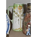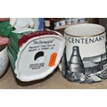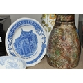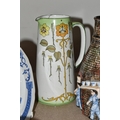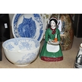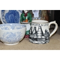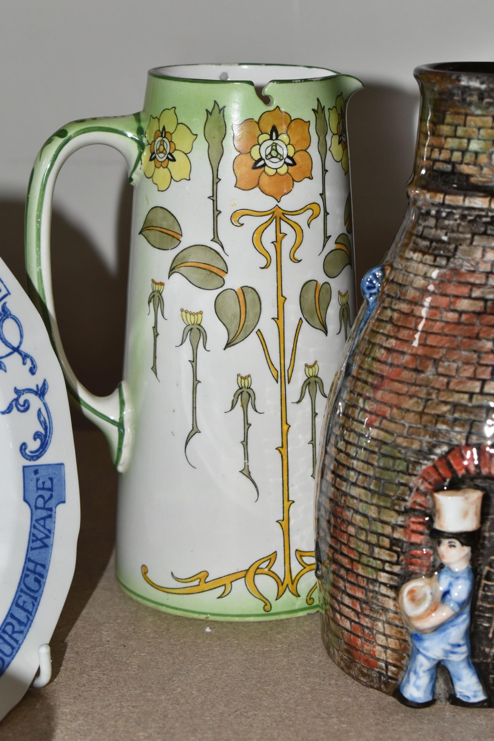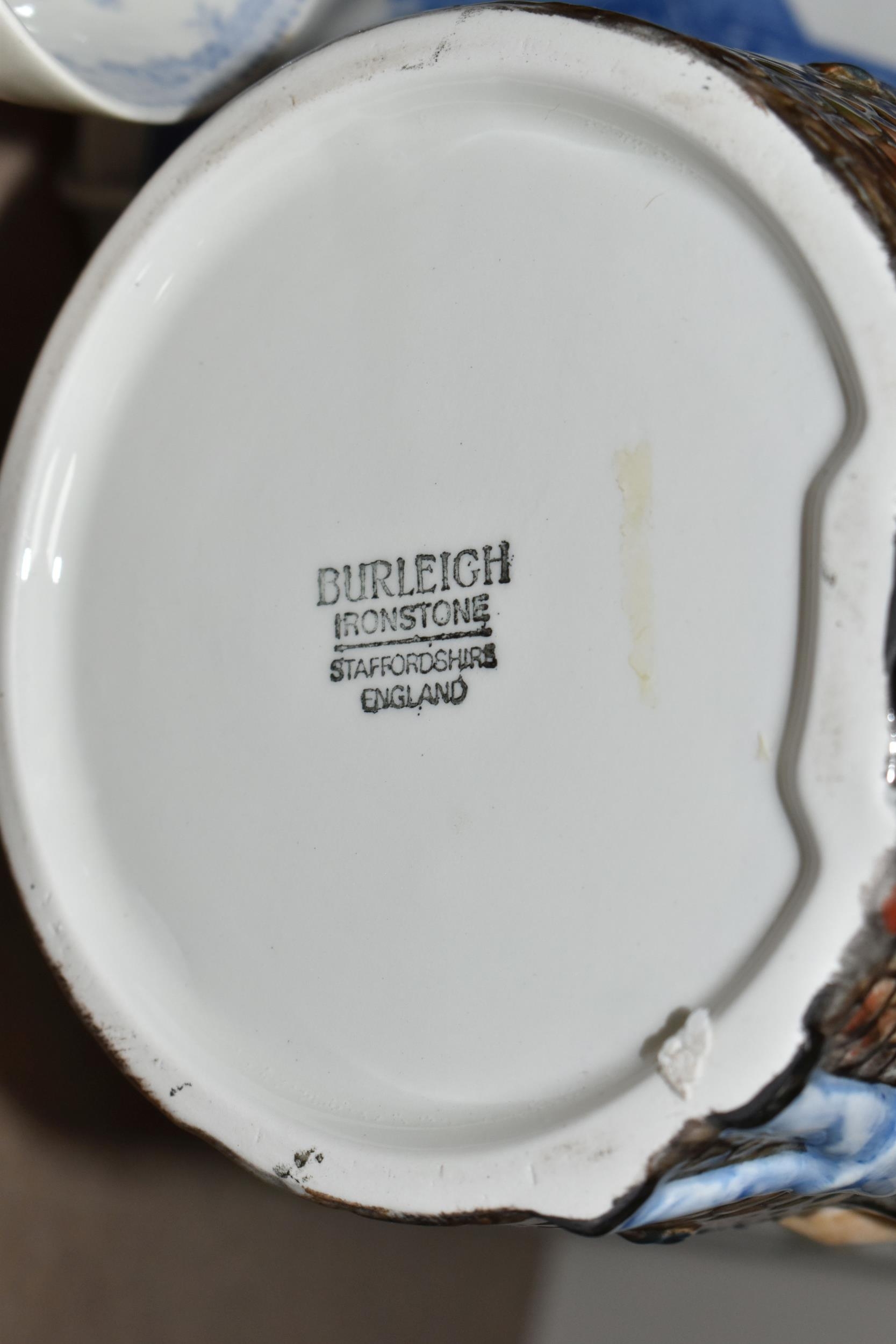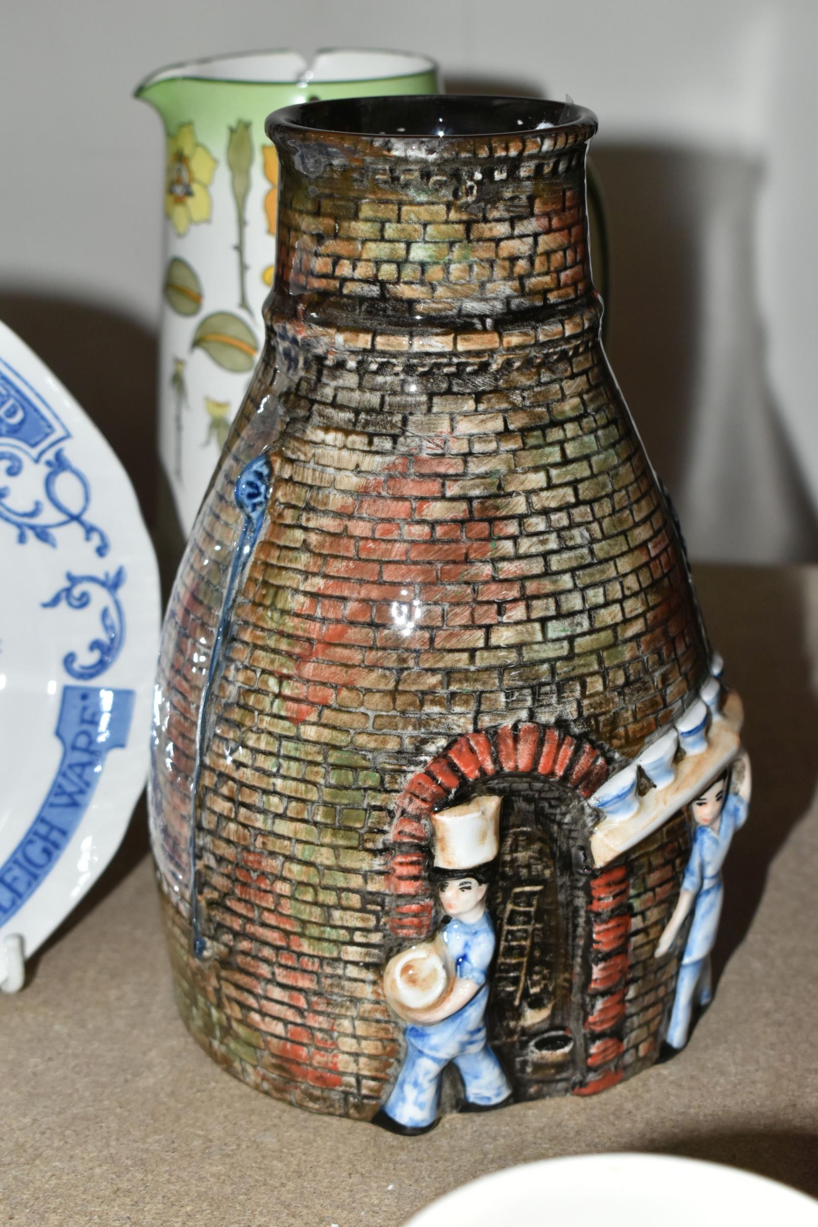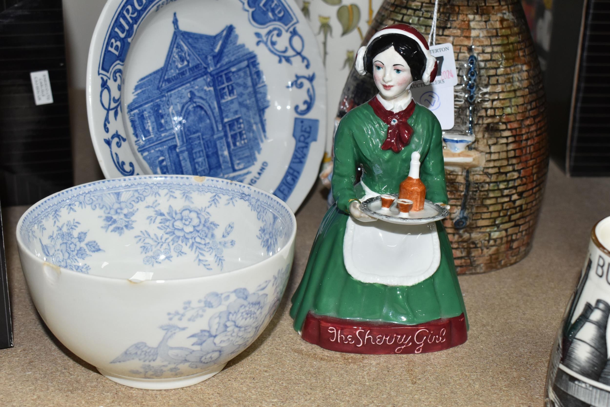 A GROUP OF BURGESS & LEIGH BURLEIGH WARE, comprising a vase in the form of a bottle kiln, 'The Sherry Girl' figure (repaired across wrists and plate), a blue and white 'Burgess & Leigh Ltd' advertising bowl, a Burgess & Leigh 1851-1951 Centenary mug, a Tudor pattern water jug (missing lid) and an Asiatic Pheasant sugar bowl (with several chips) (6) (Condition Report: generally ok, obvious specific damage as stated in description)