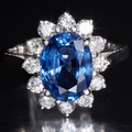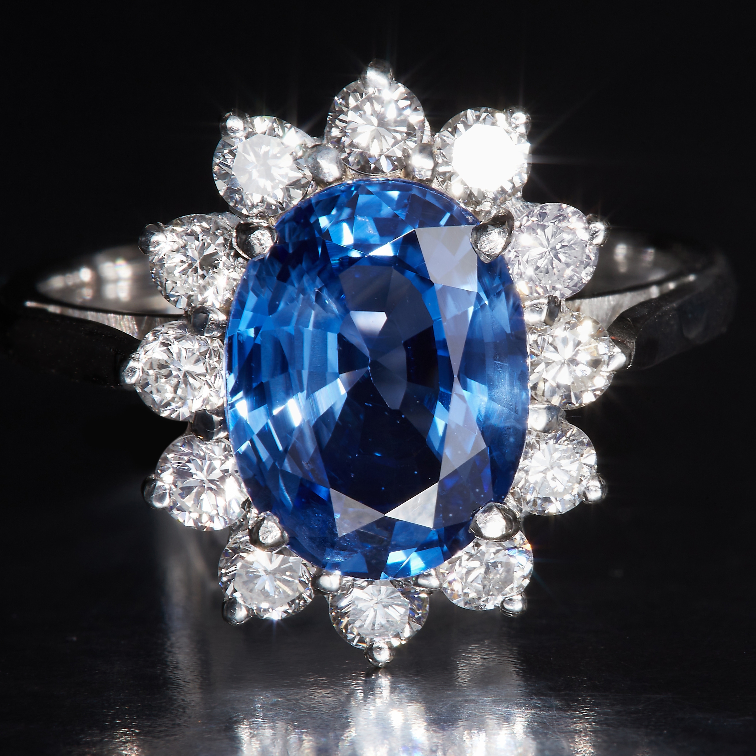 SAPPHIRE AND DIAMOND CLUSTER RING, Set with a central oval blue sapphire of approx. 3.31 ct. Surrounded with diamonds totalling approx. 0.72 ct. Size M 1/2. 4.8 grams.