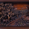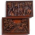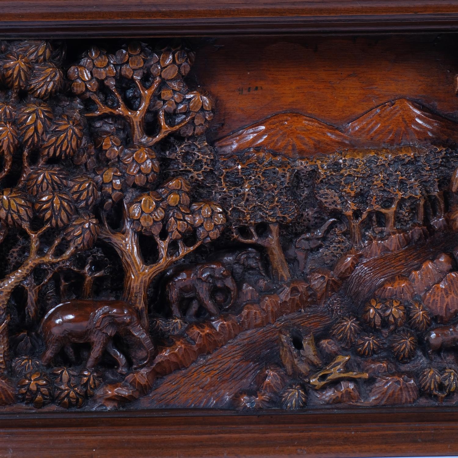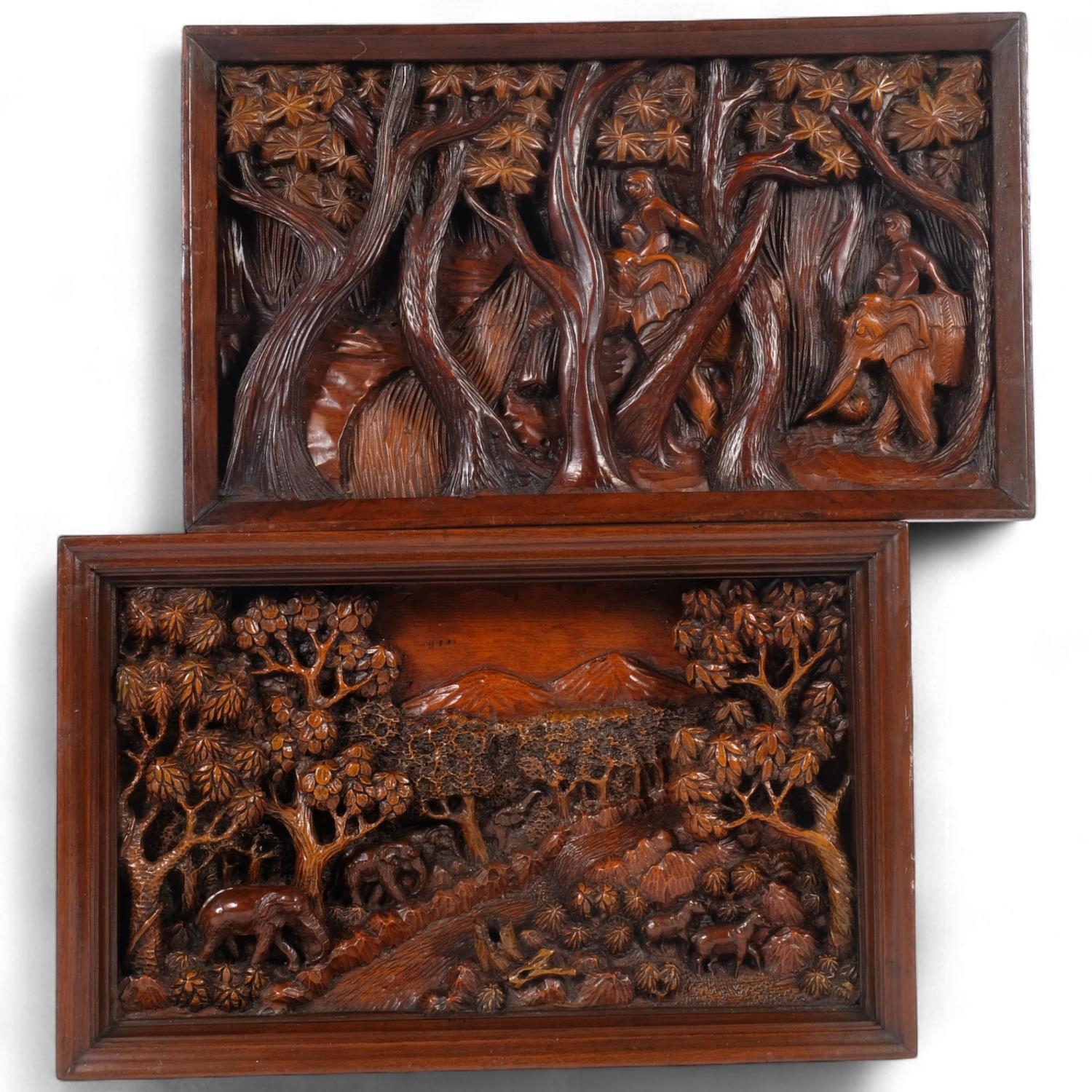 A pair of deeply carved wood wall-hanging diorama panels, depicting elephants and animals in landscapes, 53cm x 32cm