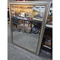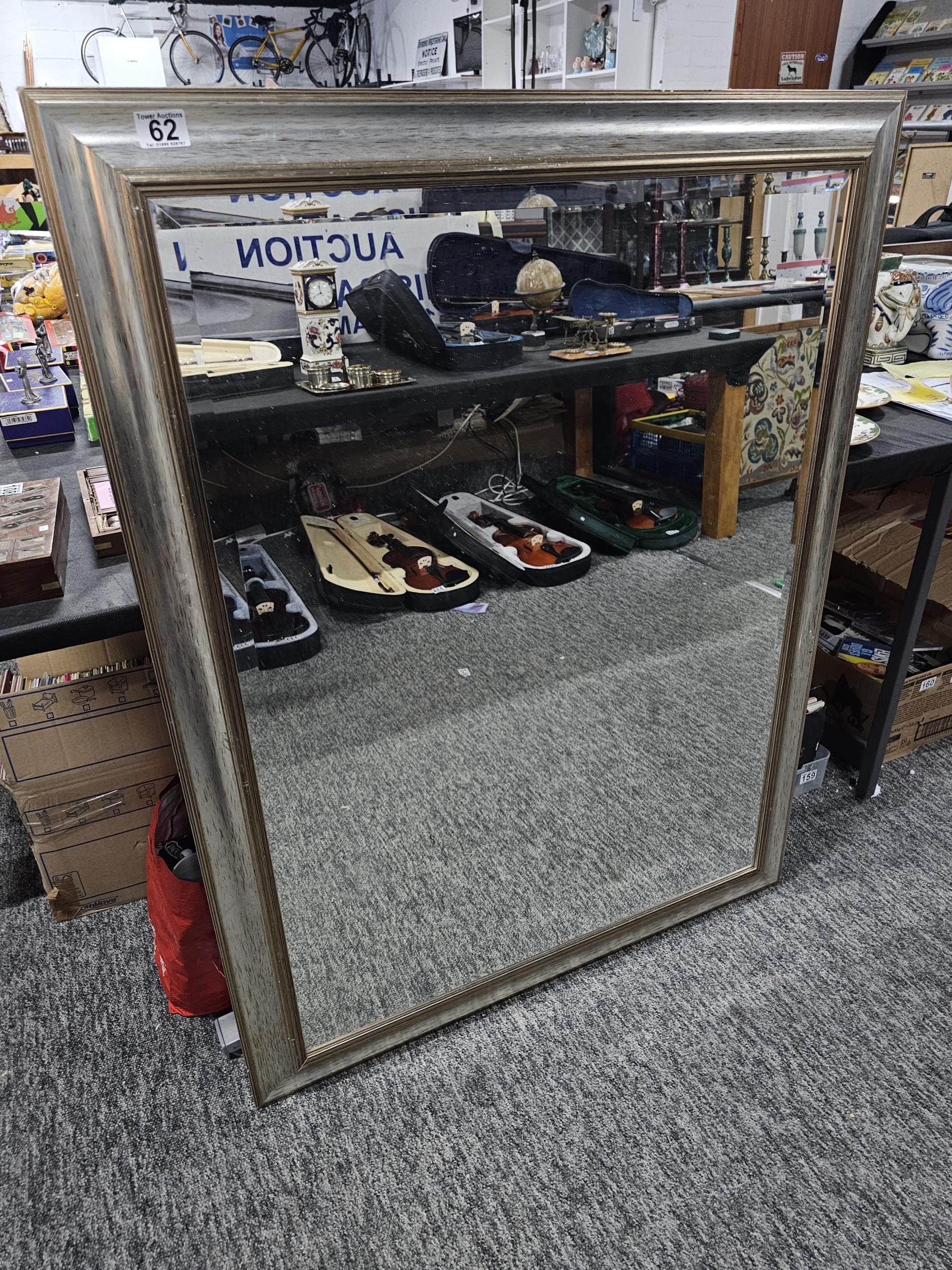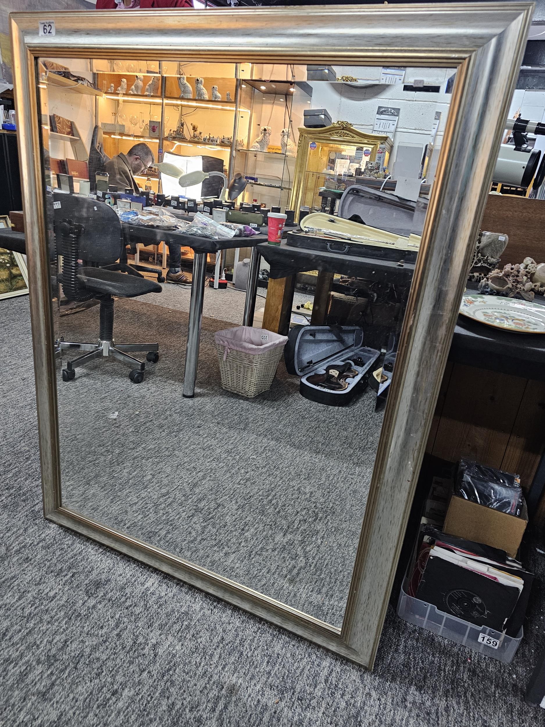 Good quality silver coloured framed bevel edged mirror in good order or large proportions in good order measures 115cm high 90cm wide