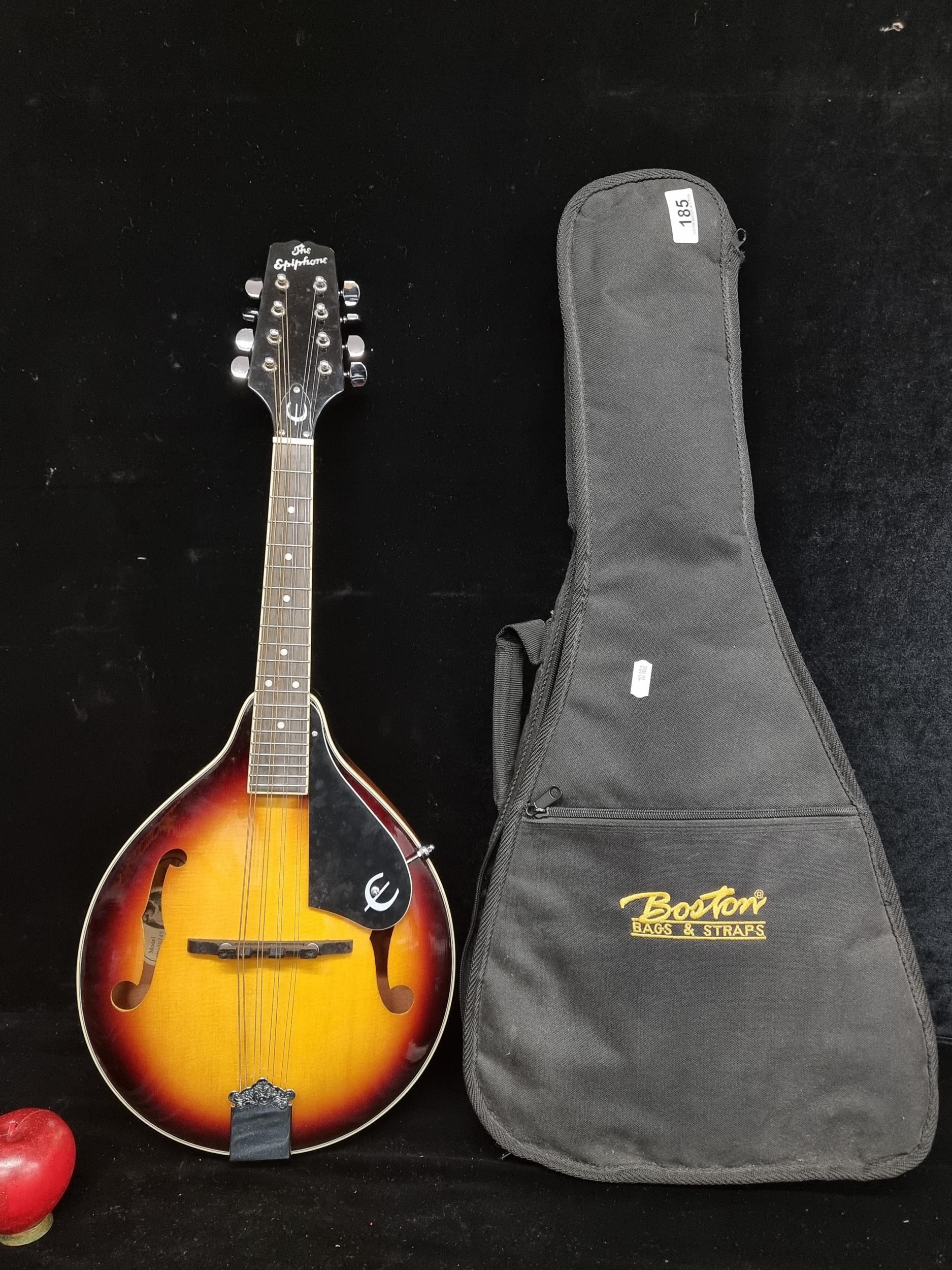 A high quality Epiphone MM-20 A-Style mandolin with chrome hardware, mahogany body and wonderful 'antique sunburst' finish. Contained in a smart Boston Bags & Straps travel case. In very good condition. This model retails for €125 on gear4music.ie.
