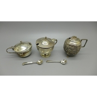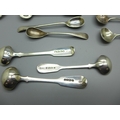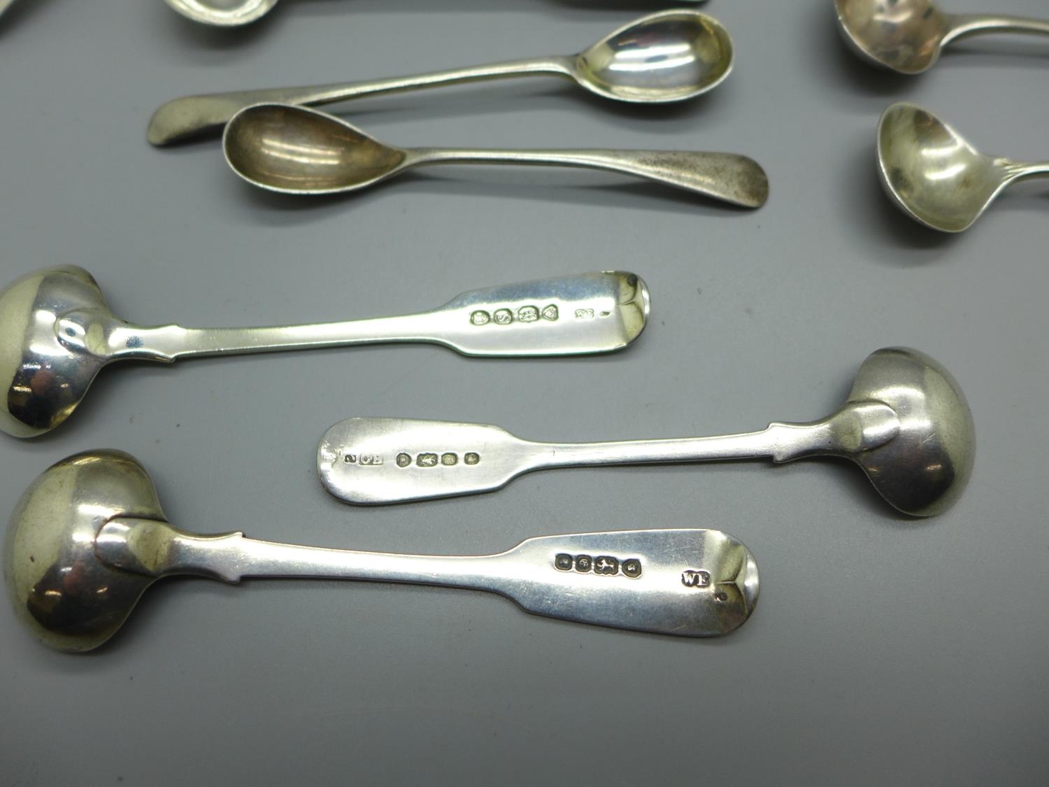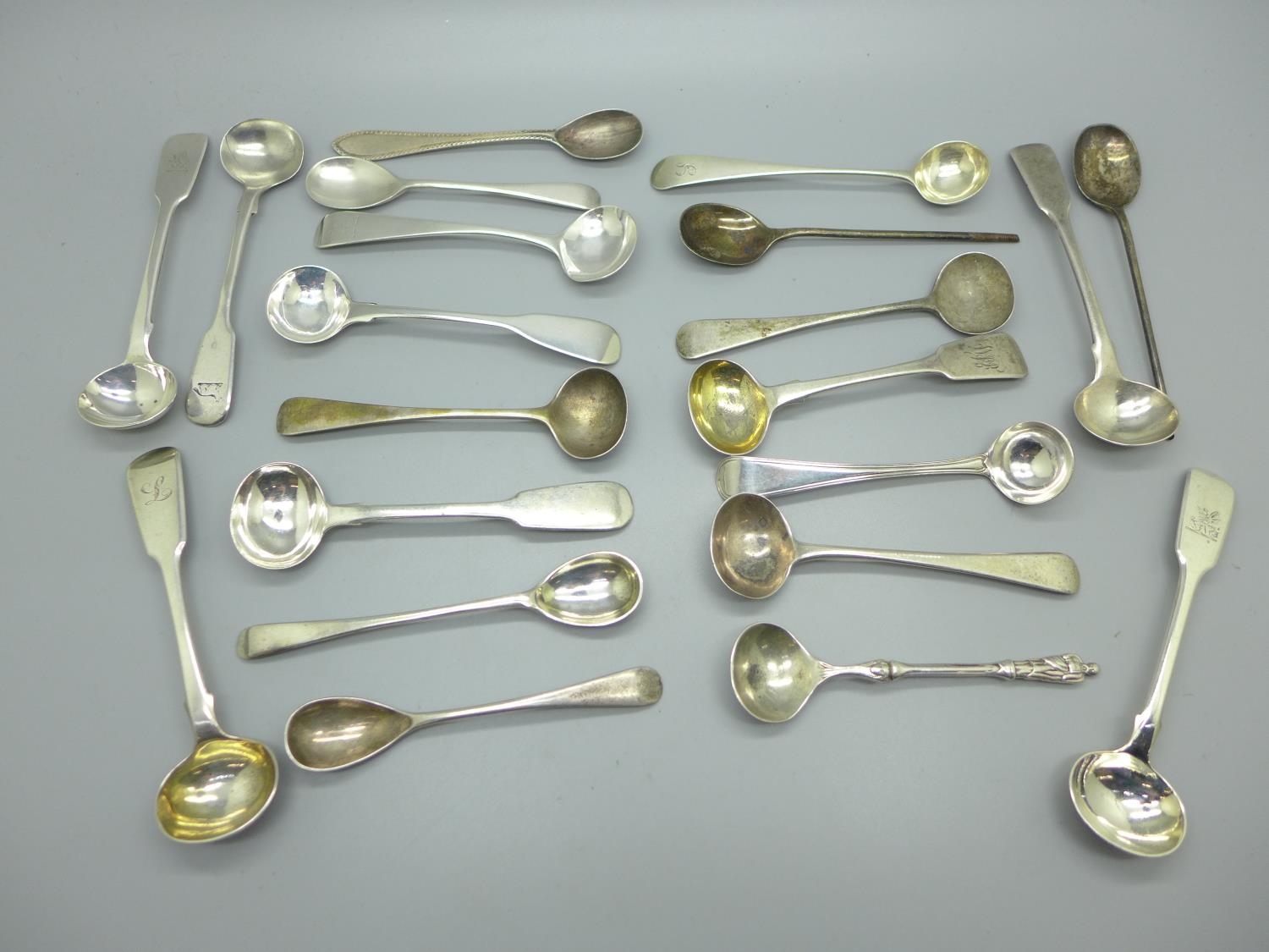 A collection of nineteen silver mustard spoons including 19th Century and two other silver spoons, 230g