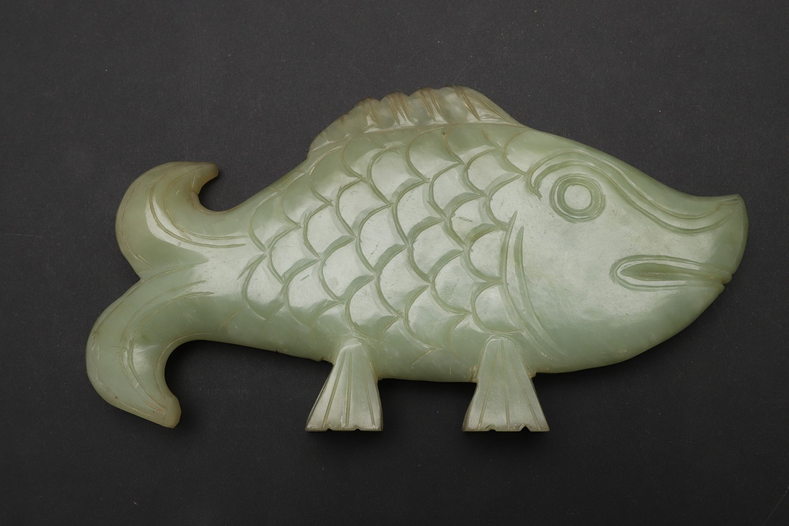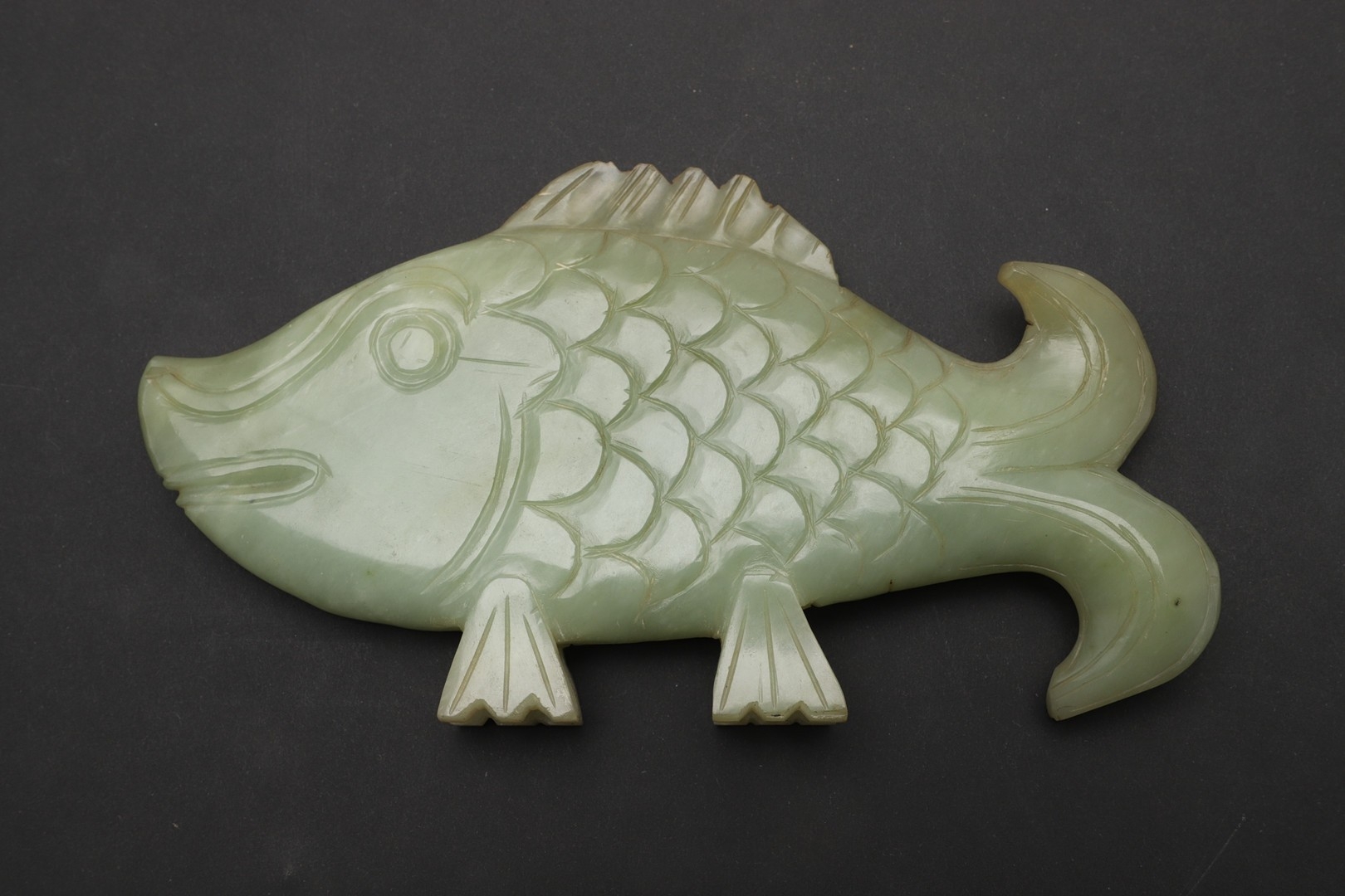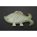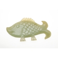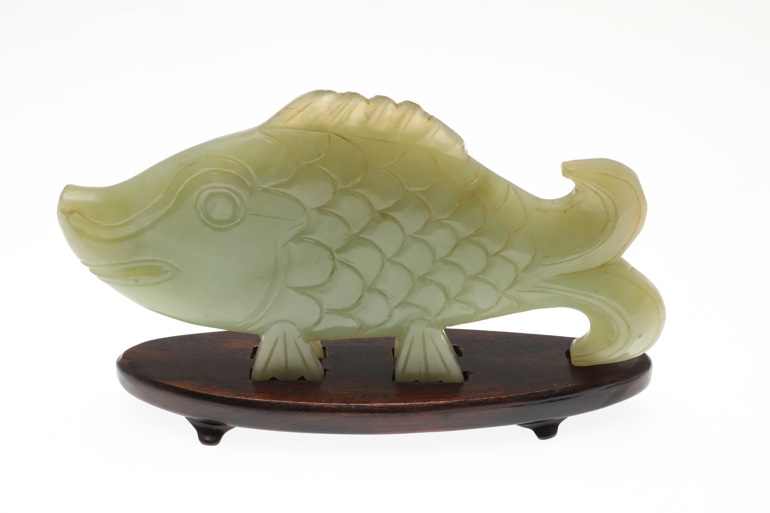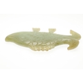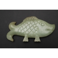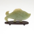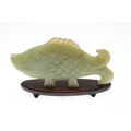 CHINESE JADE FISH. Late Qing, the celadon jade fish of narrow form and with carved detailing. With a hardwood stand, 10cms high, 18.5cms long.
