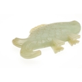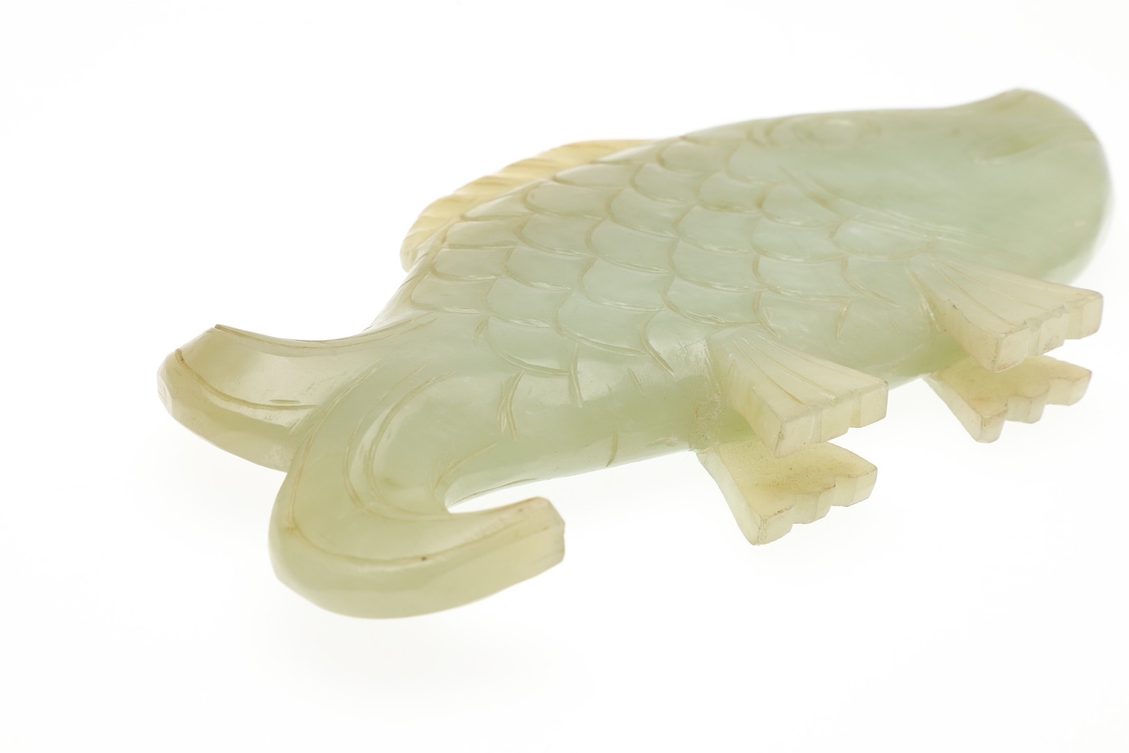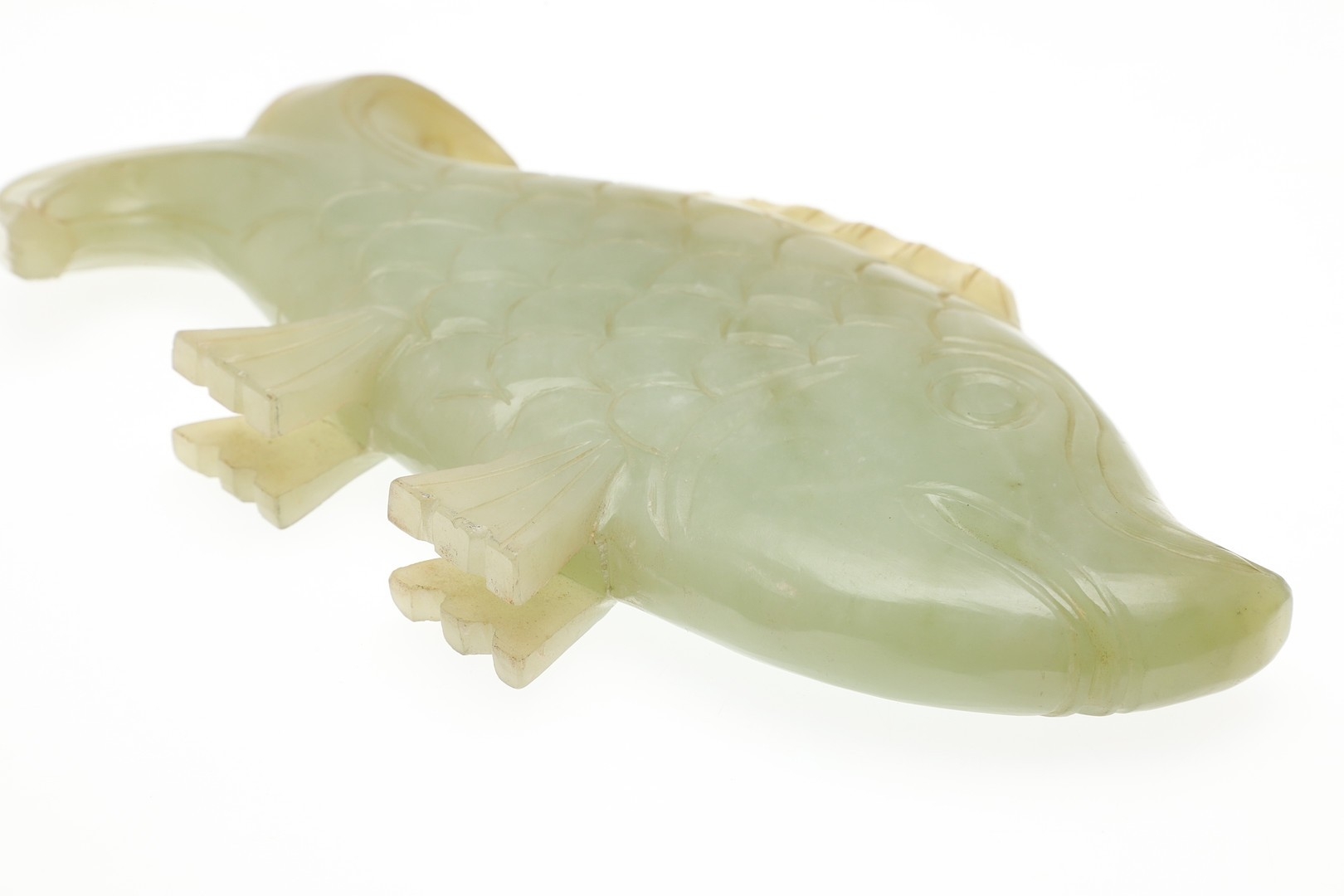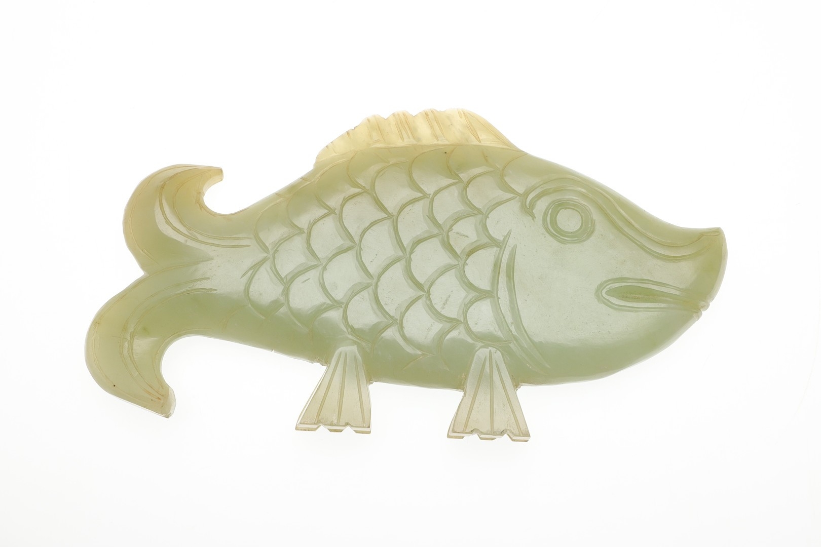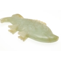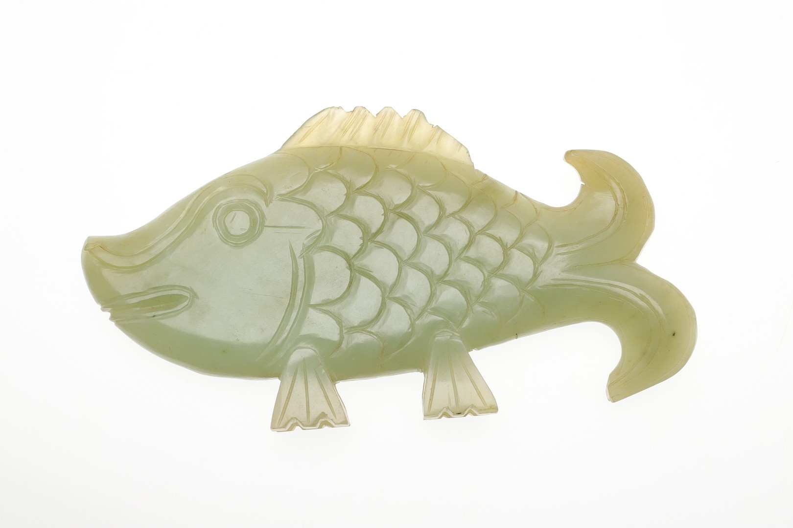 CHINESE JADE FISH. Late Qing, the celadon jade fish of narrow form and with carved detailing. With a hardwood stand, 10cms high, 18.5cms long.