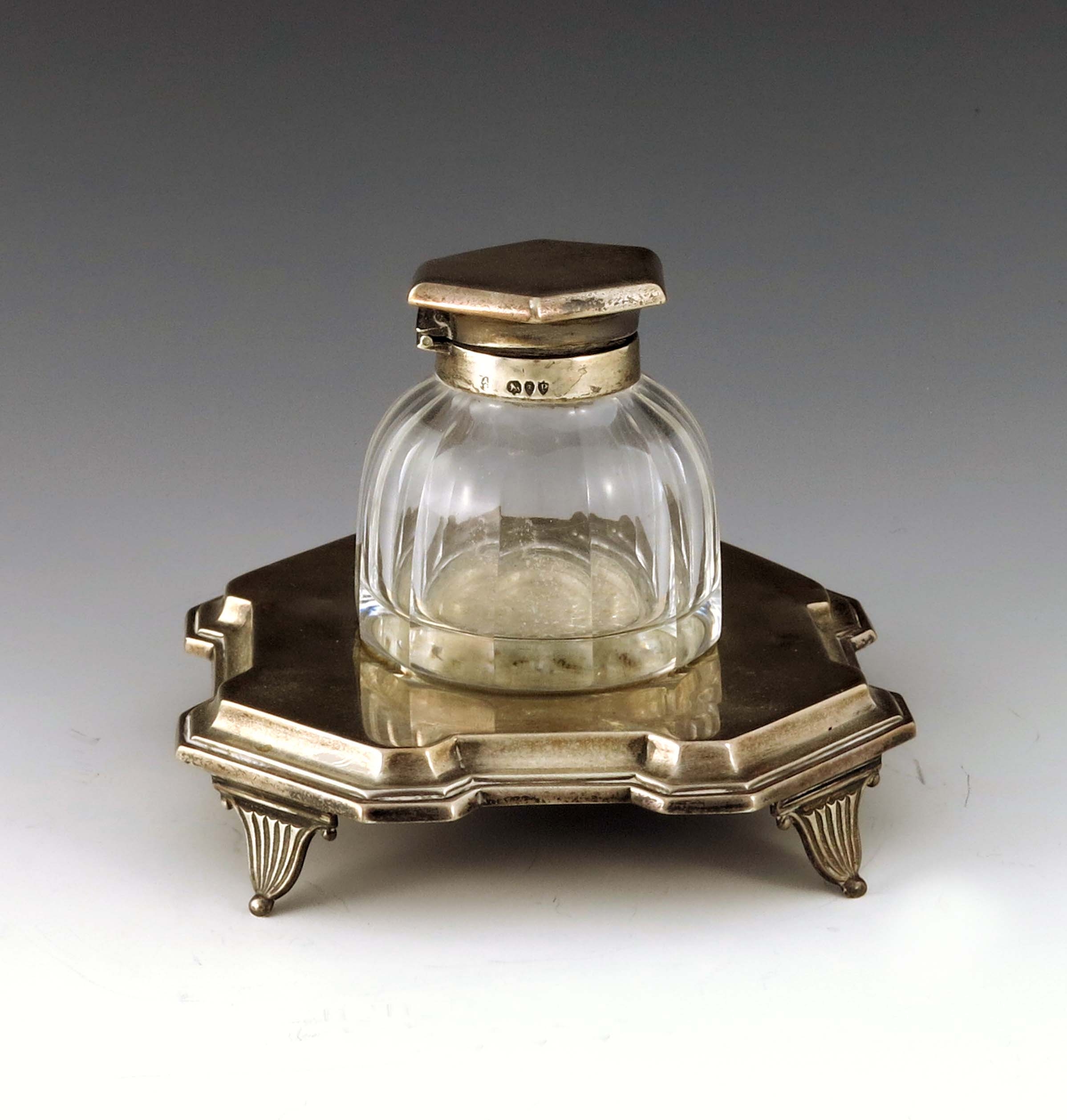 A Victorian silver and glass inkwell on stand, John Aldwinckle and Thomas Slater, London 1890, the domed slice cut bottle with hinged hexagonal section lid, on an ogee moulded octagonal stand with vase bracket feet, 17.5cm diameter