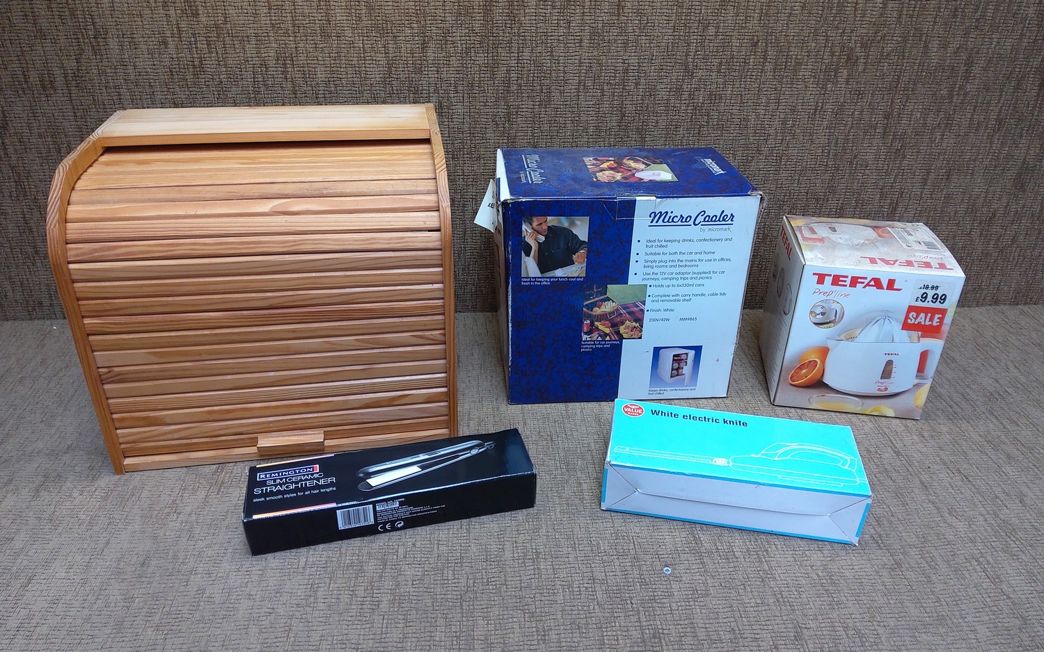 Electricals boxed including micro cooler, juicer and wooden bread bin.