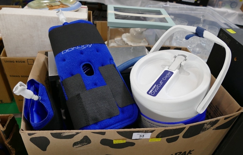 Aircast Cryo Cuff cooler with accessories and wall mounted medicine cabinet