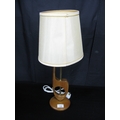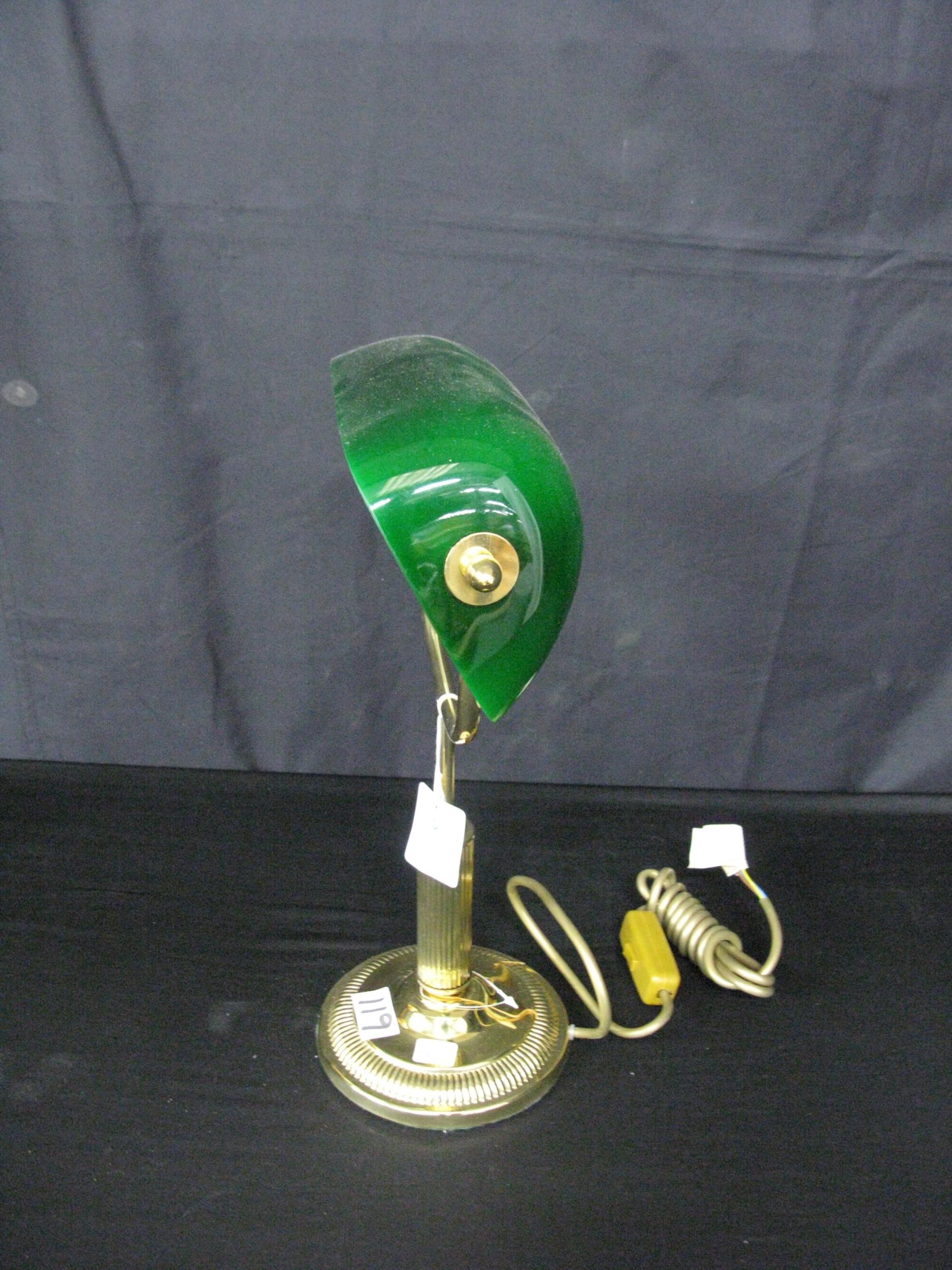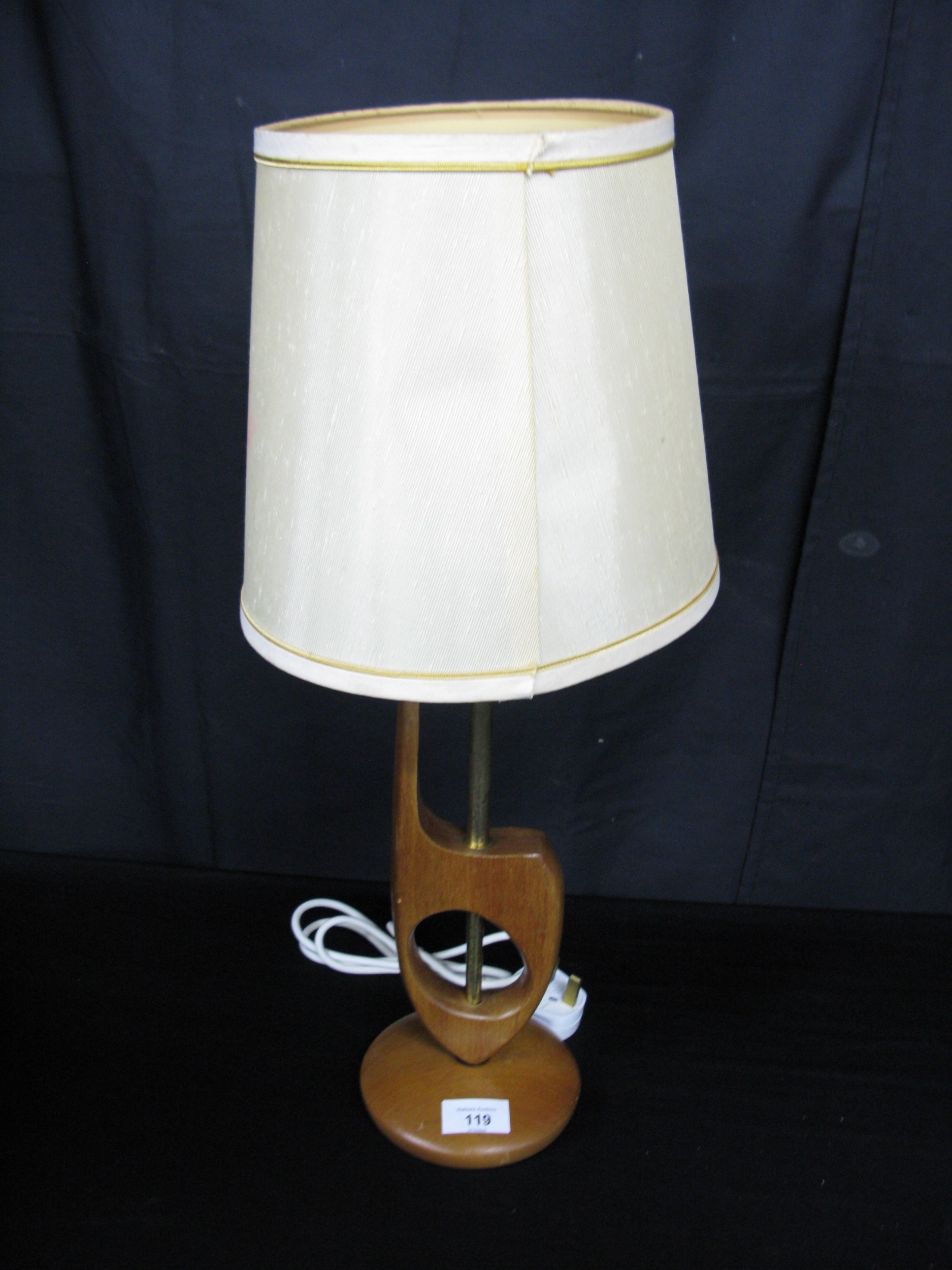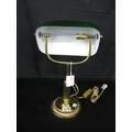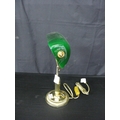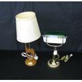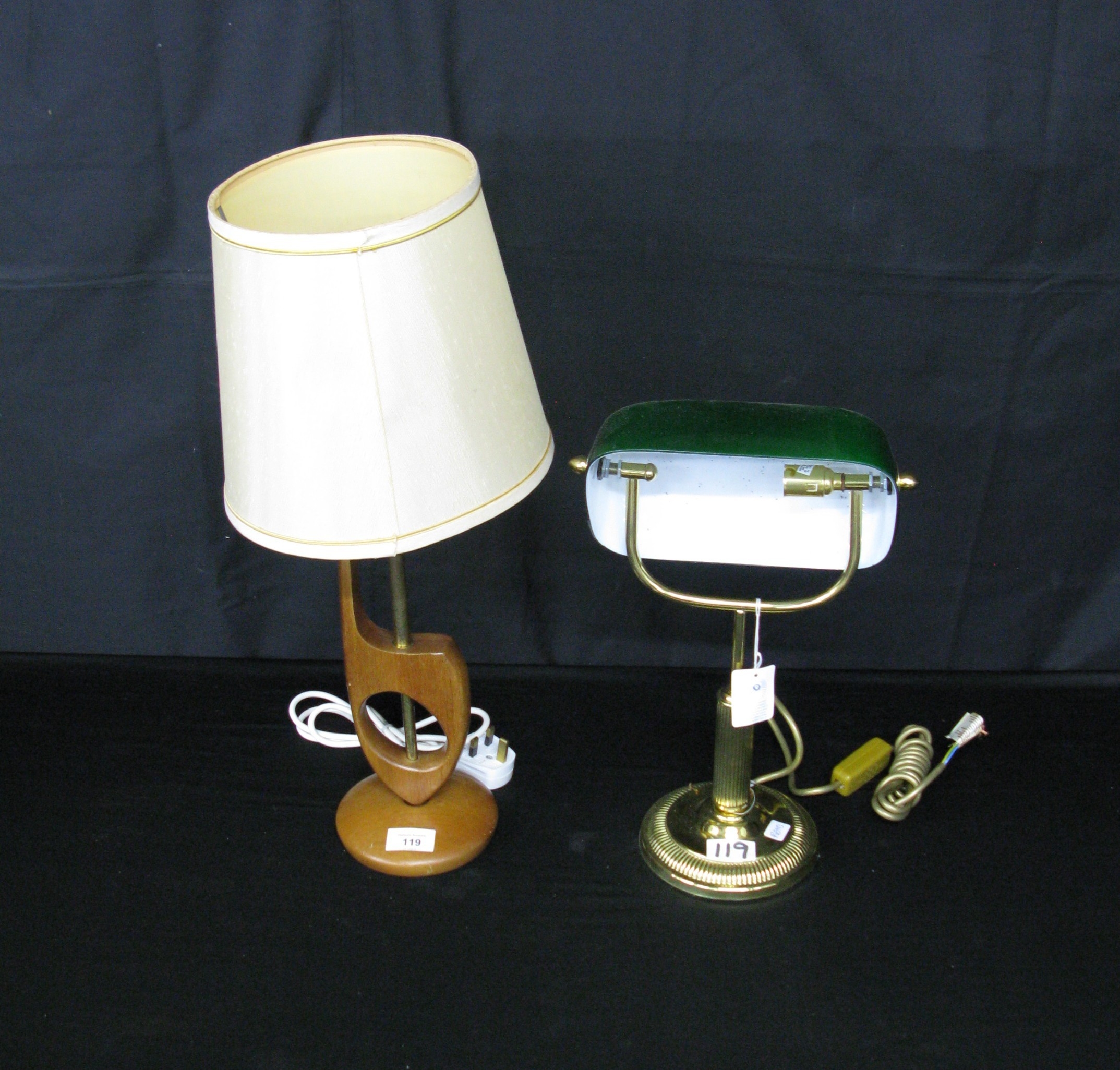 Mid 20th century teak and brass table lamp together with a brass and green glass shade desk lamp