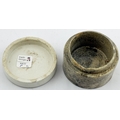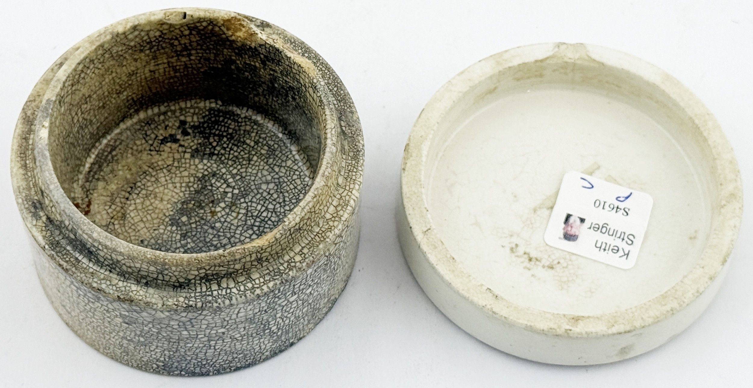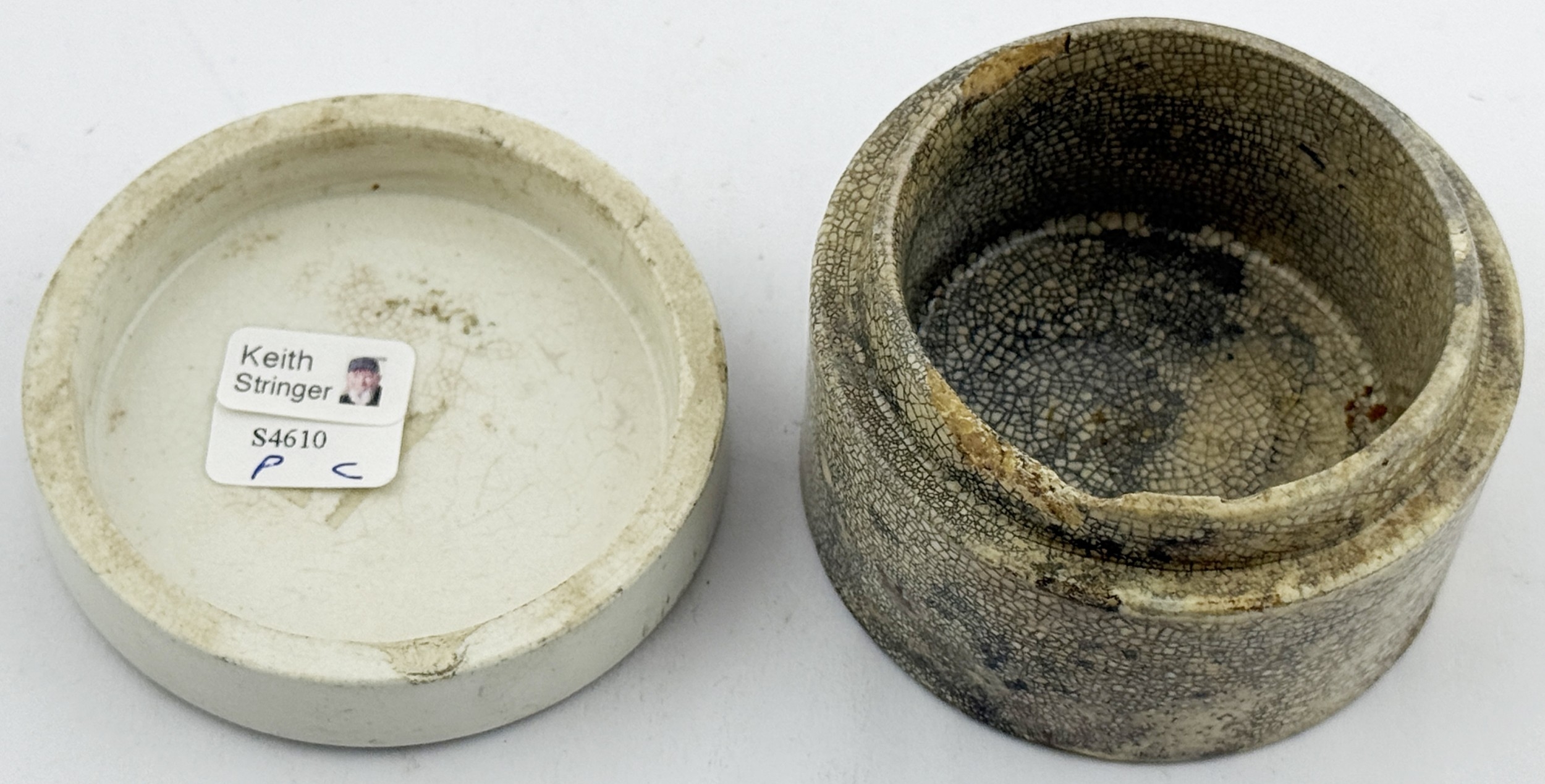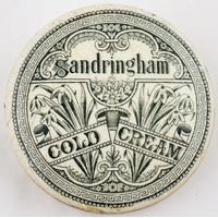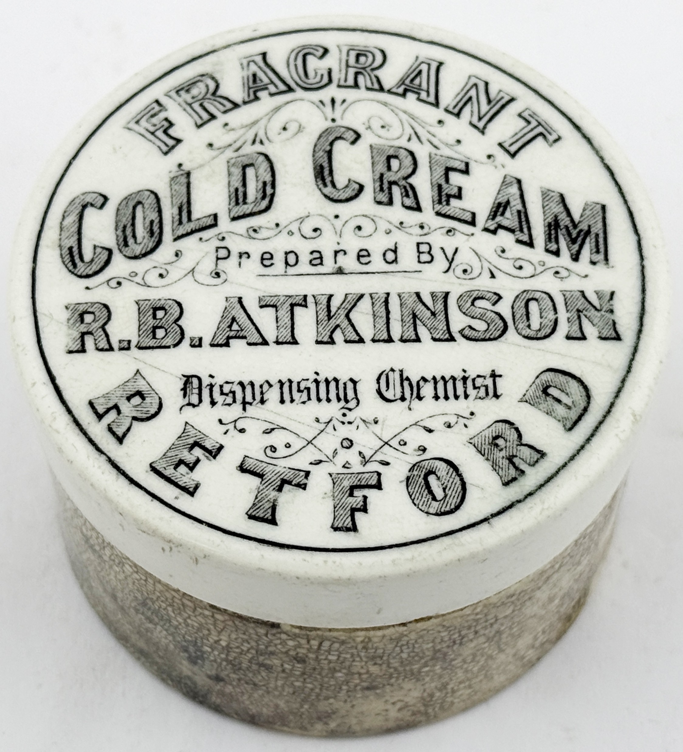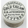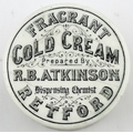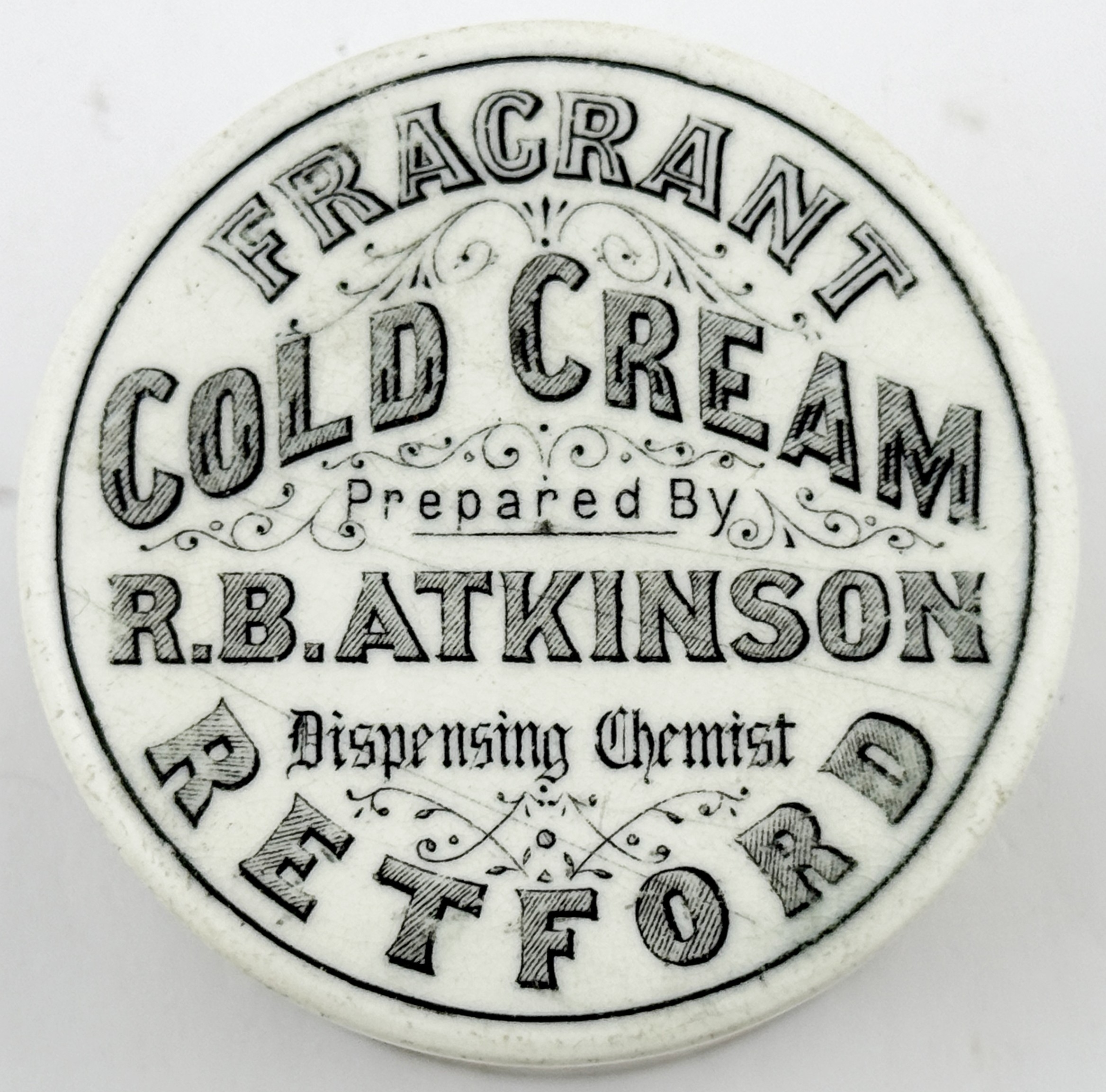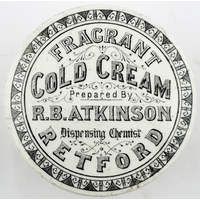 RETFORD COLD CREAM LID. APL p475, 55. 2.5ins diam. Another Retford cold cream lid, this the smaller version of the previous lot.Single line border around FRAGRANT/ COLD CREAM/ Prepared By/ R.B. ATKINSON/ Dispensing Chemist/ RETFORD. minor flange foot flake, comes with a base that fits OK but is not the original. Keith Stringer collection.