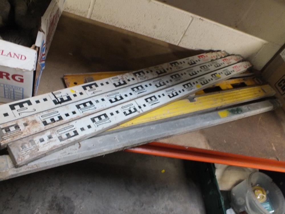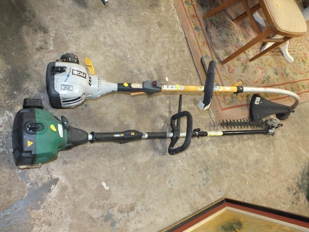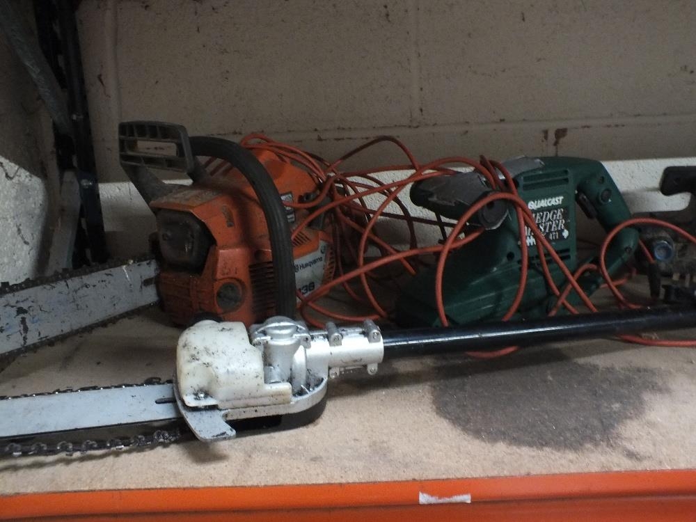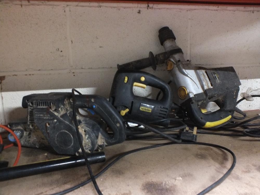 A SELECTION OF ELECTRICAL AND PETROL GARDEN AND HANDTOOLS TO INCLUDE A RYOBI STRIMMER, HUSQVARNA 136 CHAINSAW, McKELLER HAMMER DRILL, MEASURING TOOLS ETC - HOUSE CLEARANCE