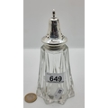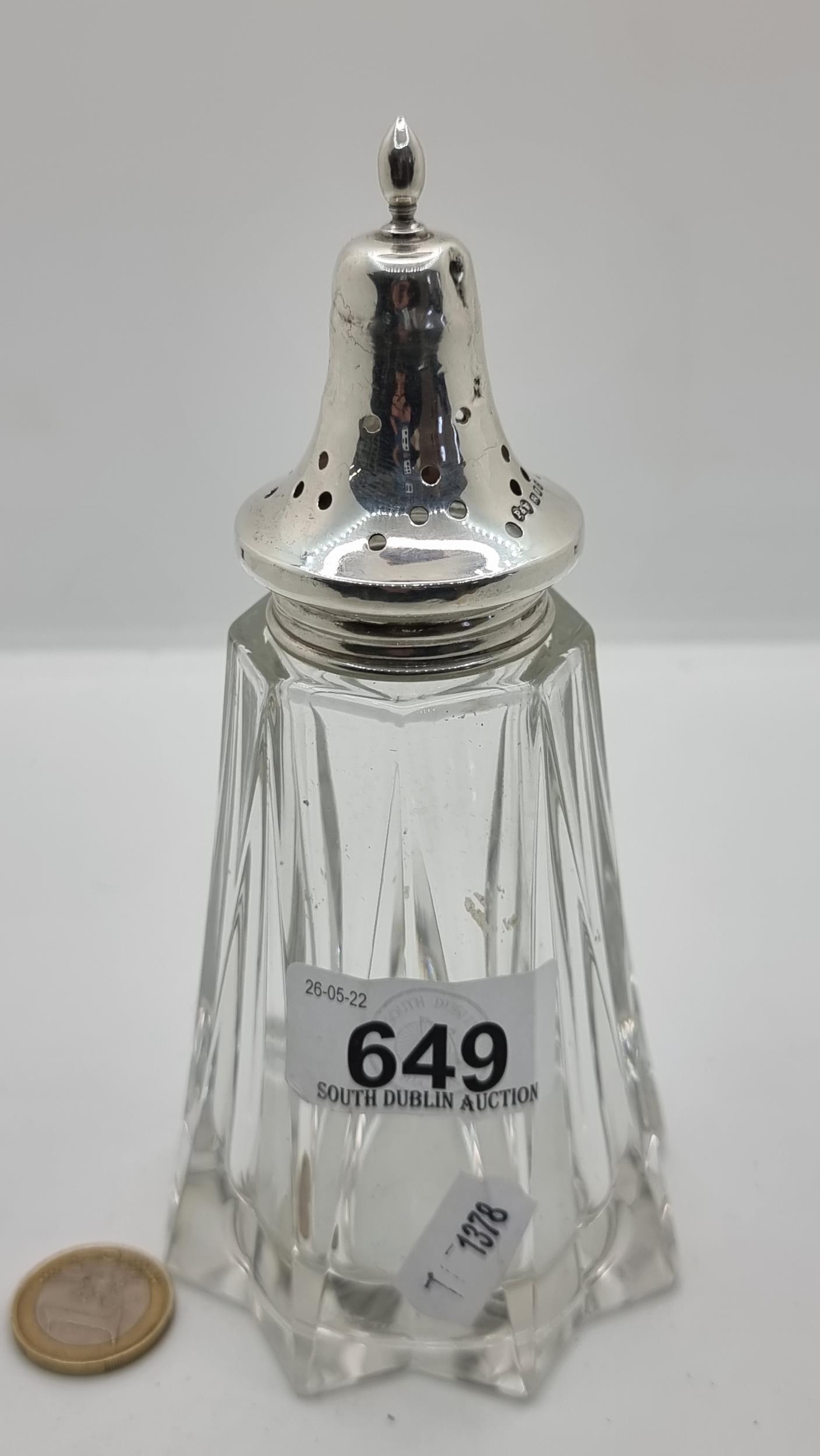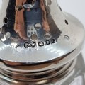 A nice example of a sterling silver topped cut glass sugar shaker. Hallmarked London, circa 1931 and makers mark states Preece & Willicombe. Weight of silver: 17.05 grams.