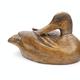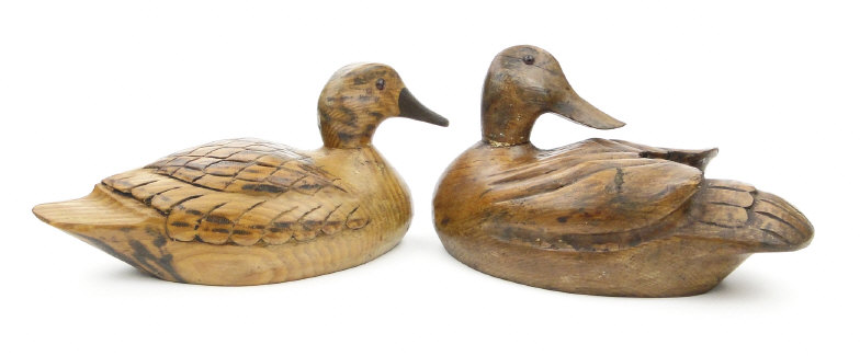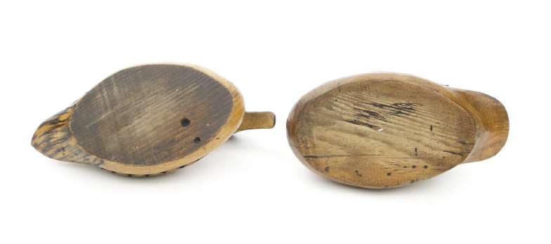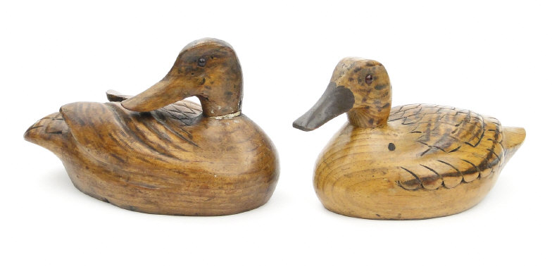Two antique carved wood duck decoys with beaded glass eyes, each approximately 22cm in length