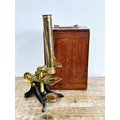 A boxed Victorian Watson & Sons High Holborn London brass microscope, drawer in case containing clear glass slides, Model No.1504 (no key)