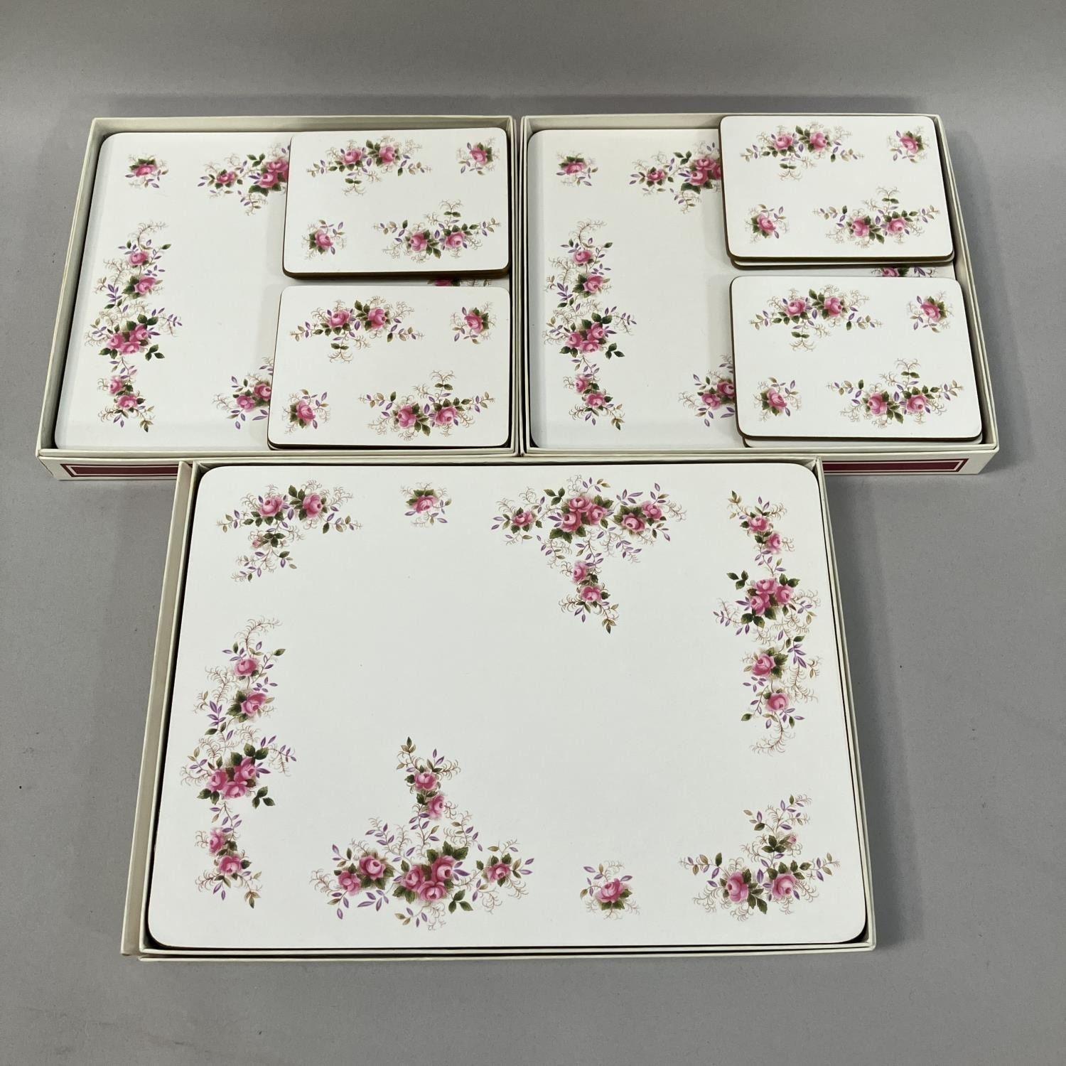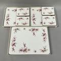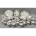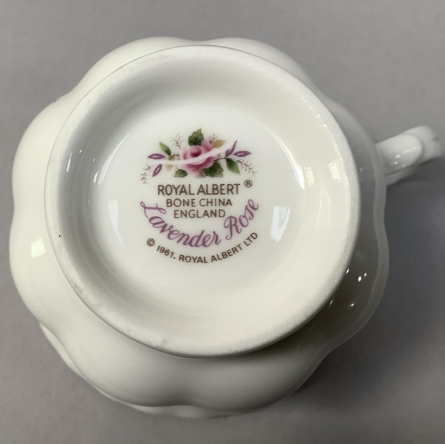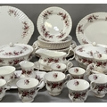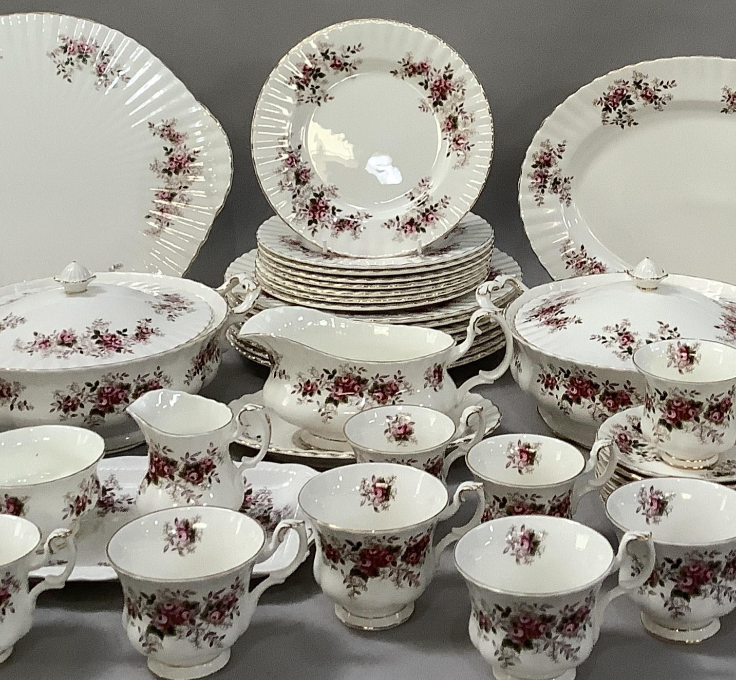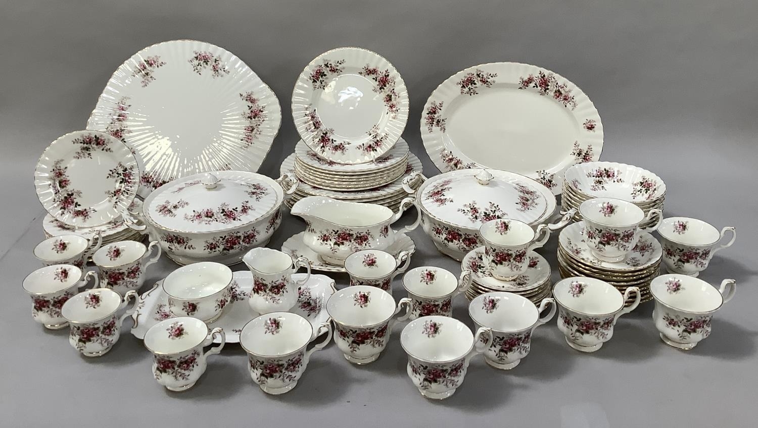 An extensive Royal Albert Lavender Rose dinner tea and coffee service comprising seven dinner plates, eight dessert plates, nine side plates, a pair of two-handled tureens with covers (one cracked to the base), sauce boat and saucer, meat dish, sandwich tray, cake platter 31cm diameter (marked for seconds), eight tea cups and nine saucers, eight coffee cups and saucers, sugar and cream