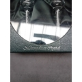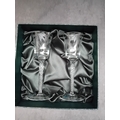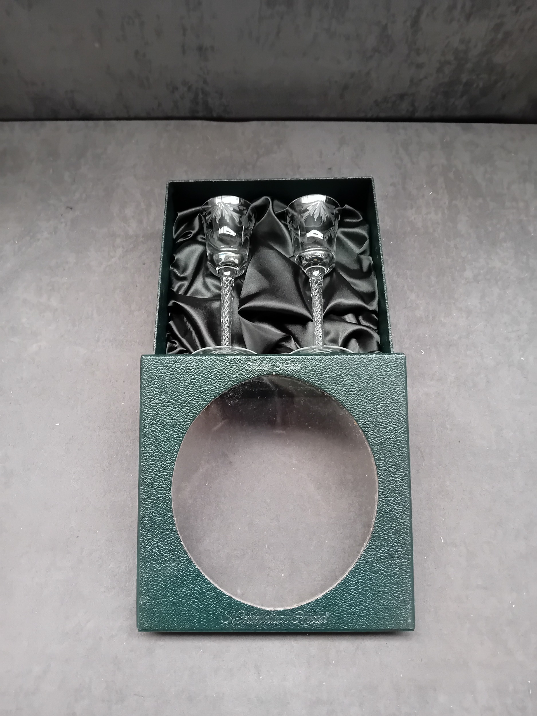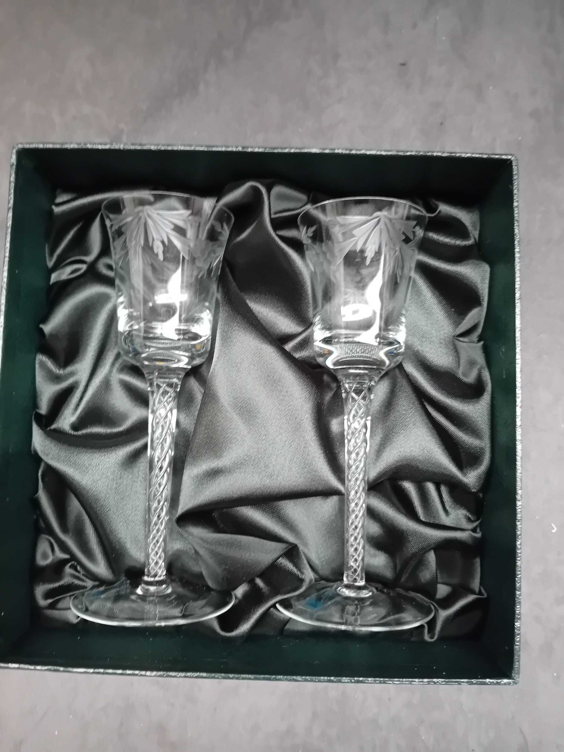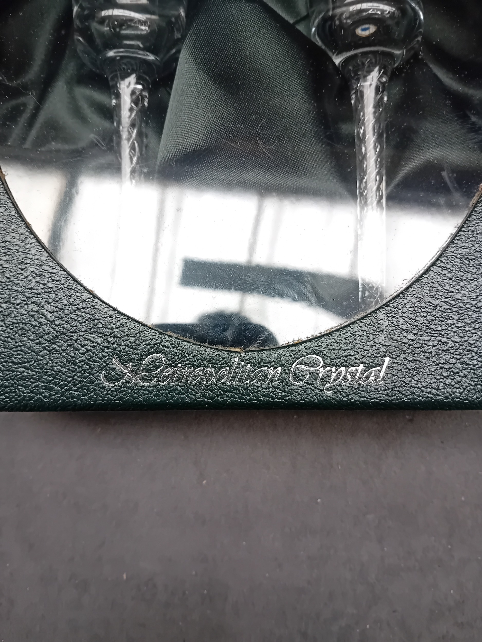 A pair of Bohemia Crystal-Crystalex Boc270 cordial glasses. Each clear crystal stemmed glass features an engraved floral or foliate pattern around the bowl and a distinctively twisted stem, often referred to as 'Air Twist' or 'Diamond Stem'. The set is presented in its original dark green, textured cardboard box with a black satin interior and a clear display window. The box is marked 'Hand Made' and 'Metropolitan Crystal'.
