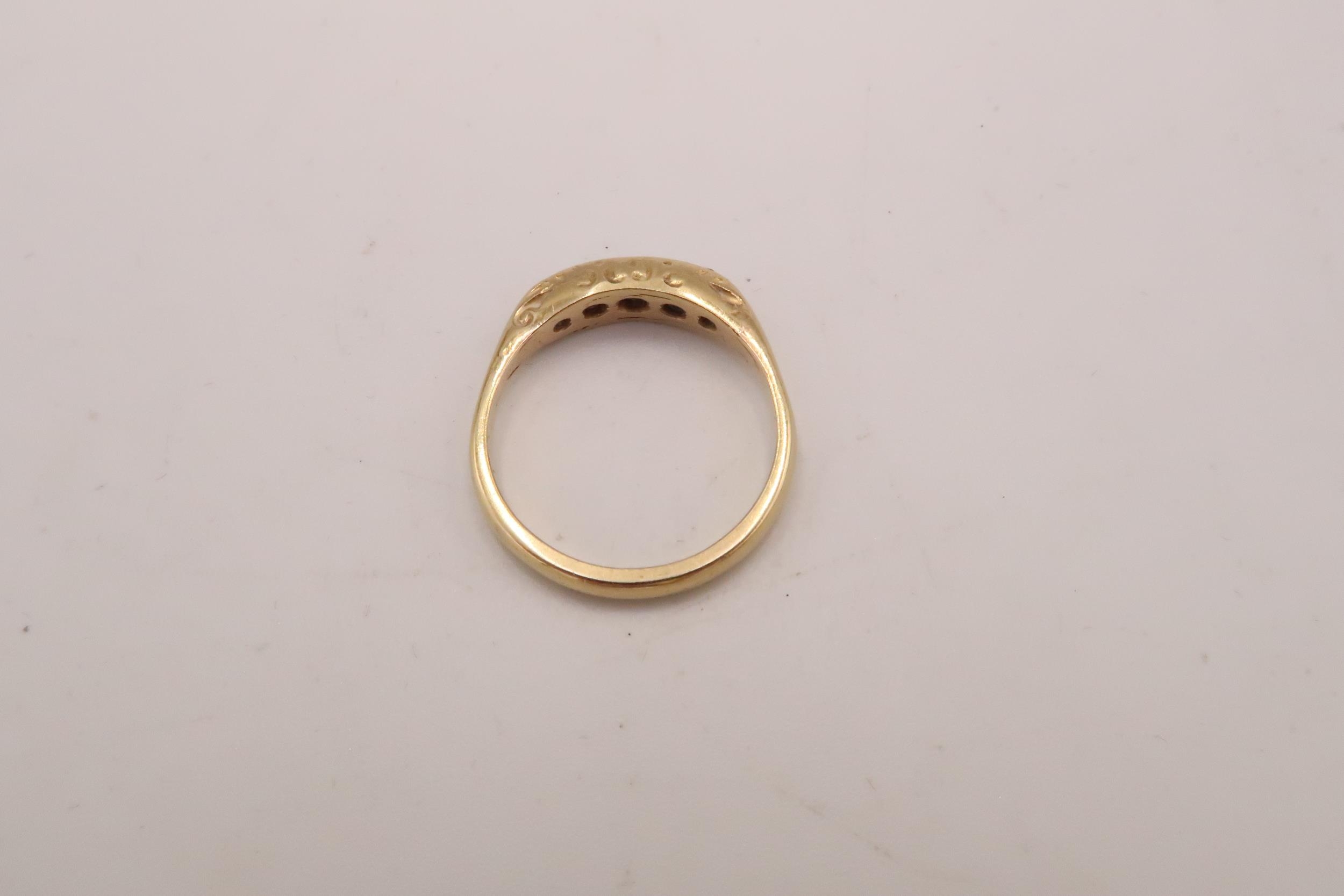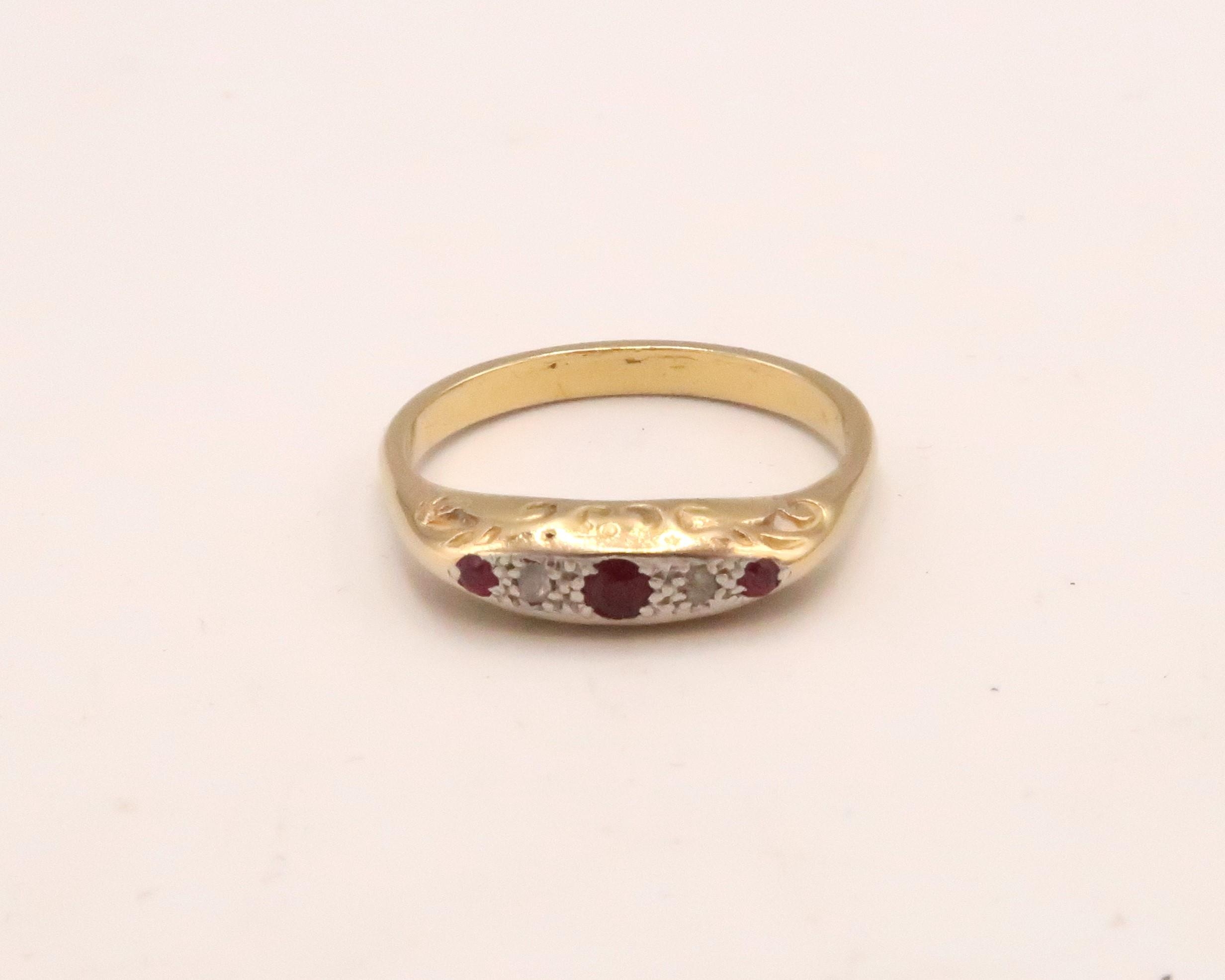 A ruby and diamond boat shape ring. Tests gold 18ct. Size Q. Weight 3.03 grams