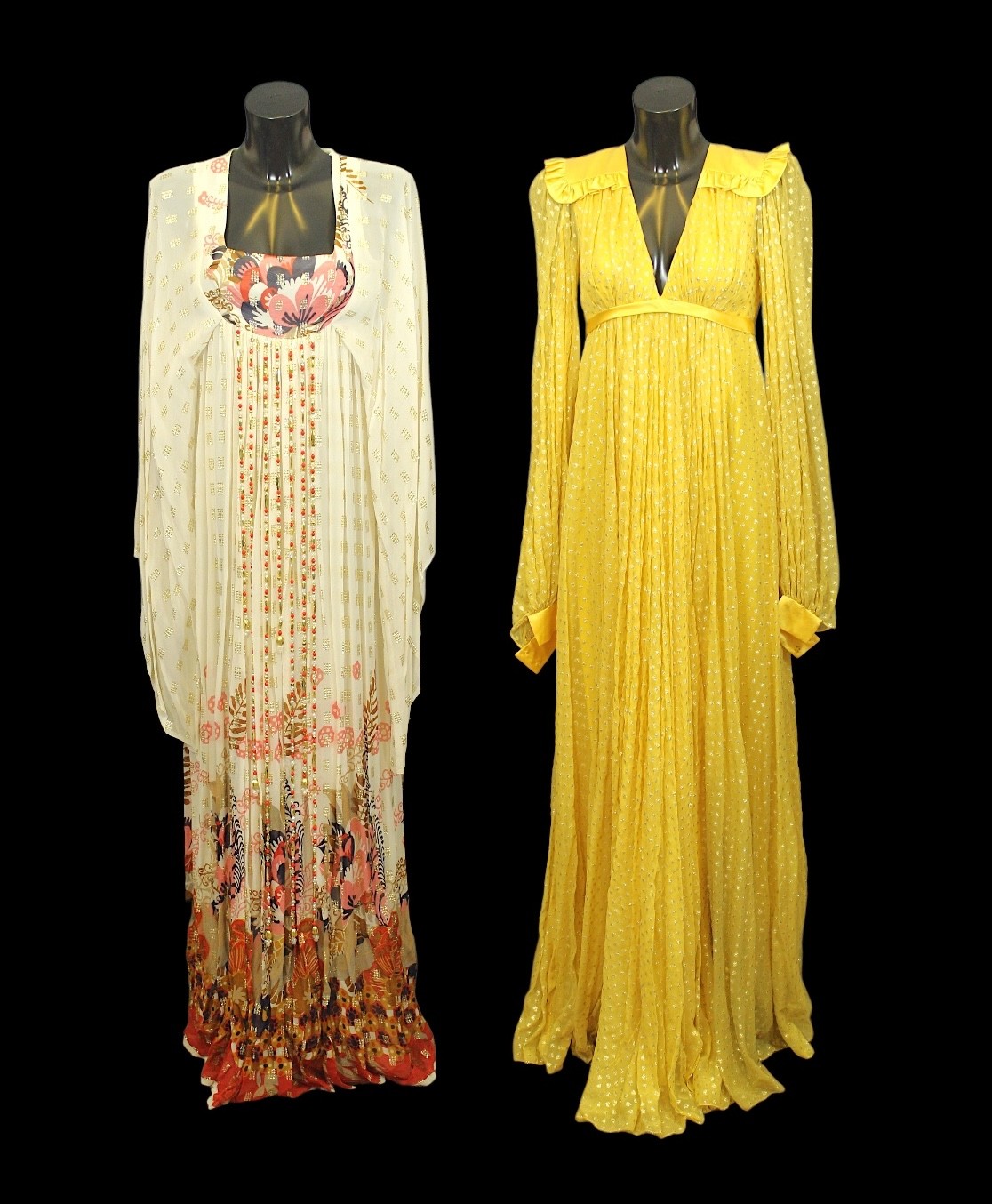 including; an ivory chiffon effect maxi dress, wide sleeves, with printed batik inspired pattern, embellished with gold thread and beaded tassels to front, waist flat approximately 36cm; and a canary yellow chiffon effect maxi dress, with satin effect collar, belt detail and trim, embellished with silver thread, waist flat approximately 37cm (2)