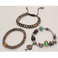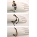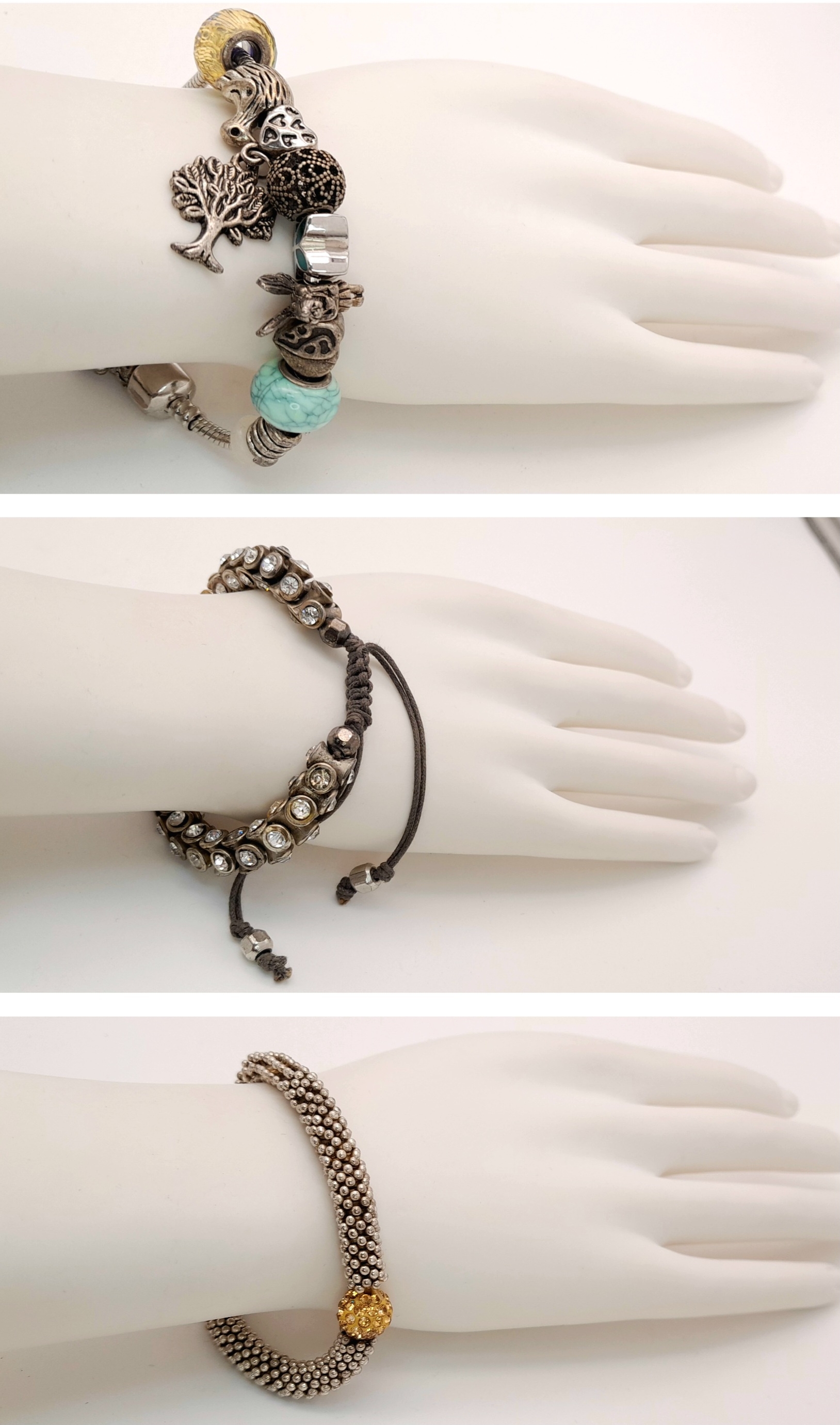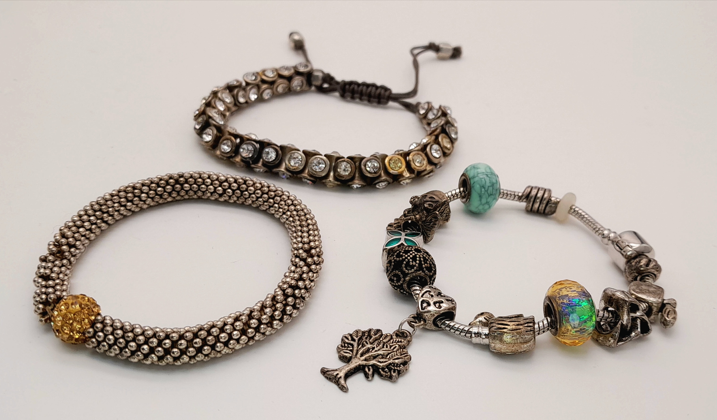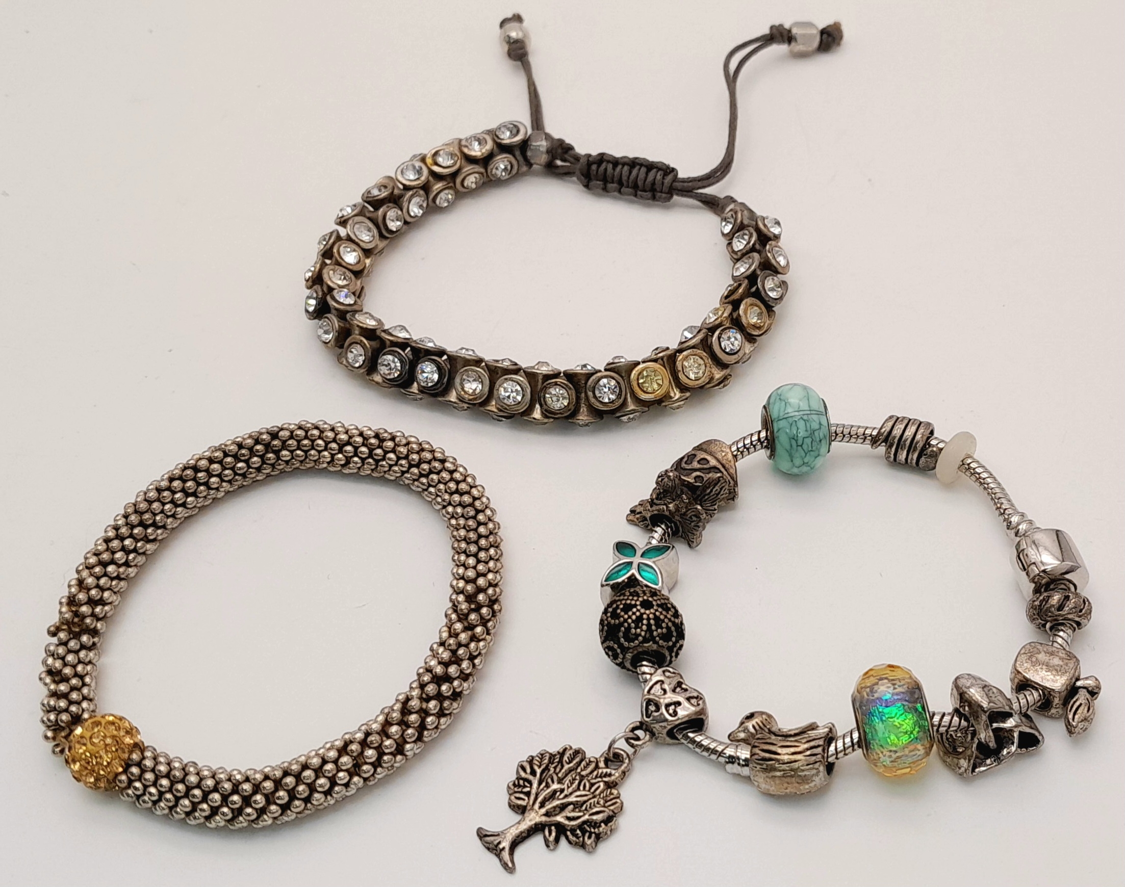 3X vintage fashion bracelets. Includes a crystal-set adjustable cord bracelet, a woven metallic bracelet with gold-tone bead, and a charm bracelet with mixed beads and a tree pendant.