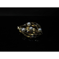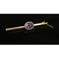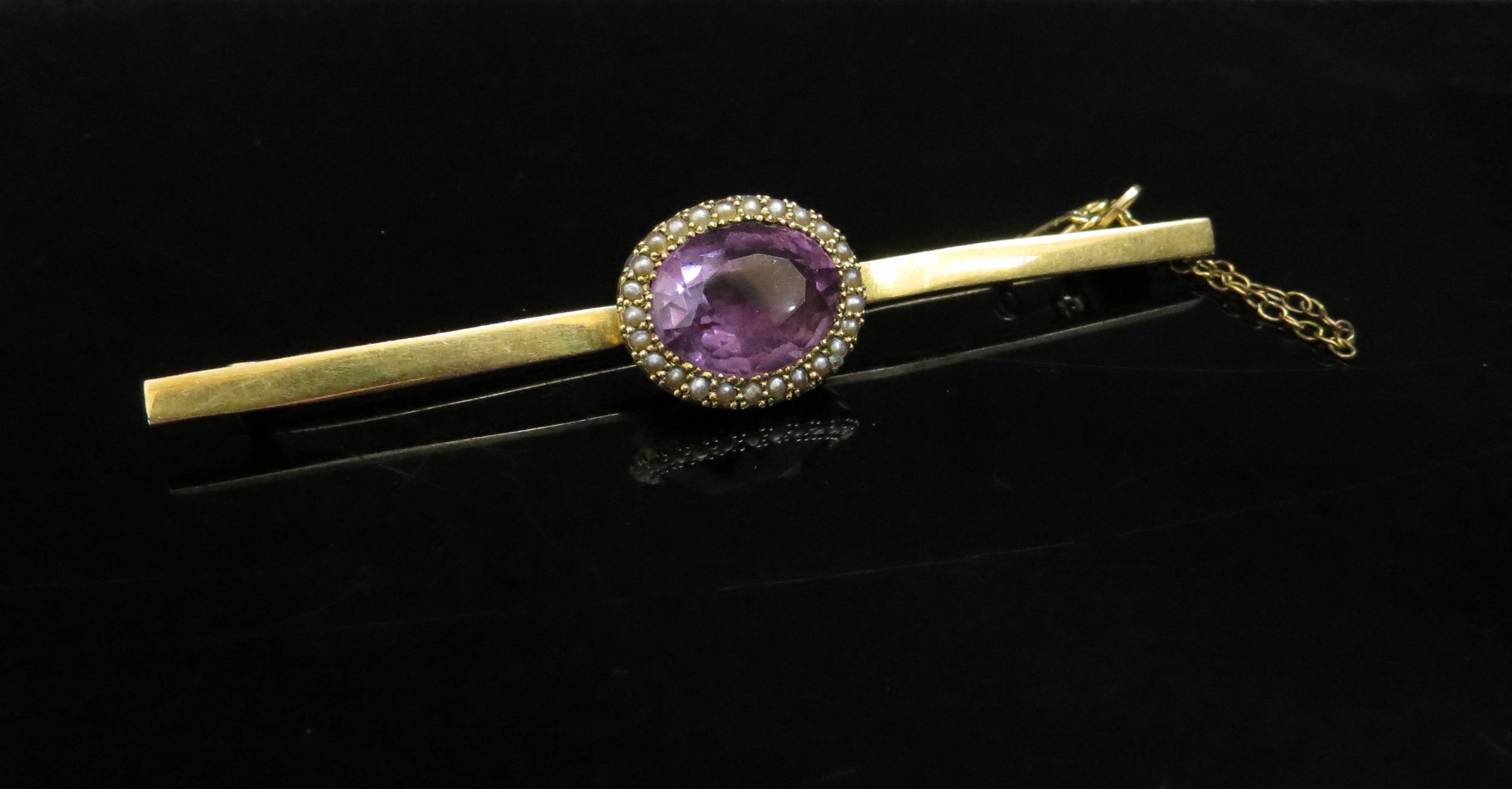 A gold bar brooch set with central Amethyst framed by grey seed pearls, stamped 9ct, 8cm long, 7.5g (R) £70