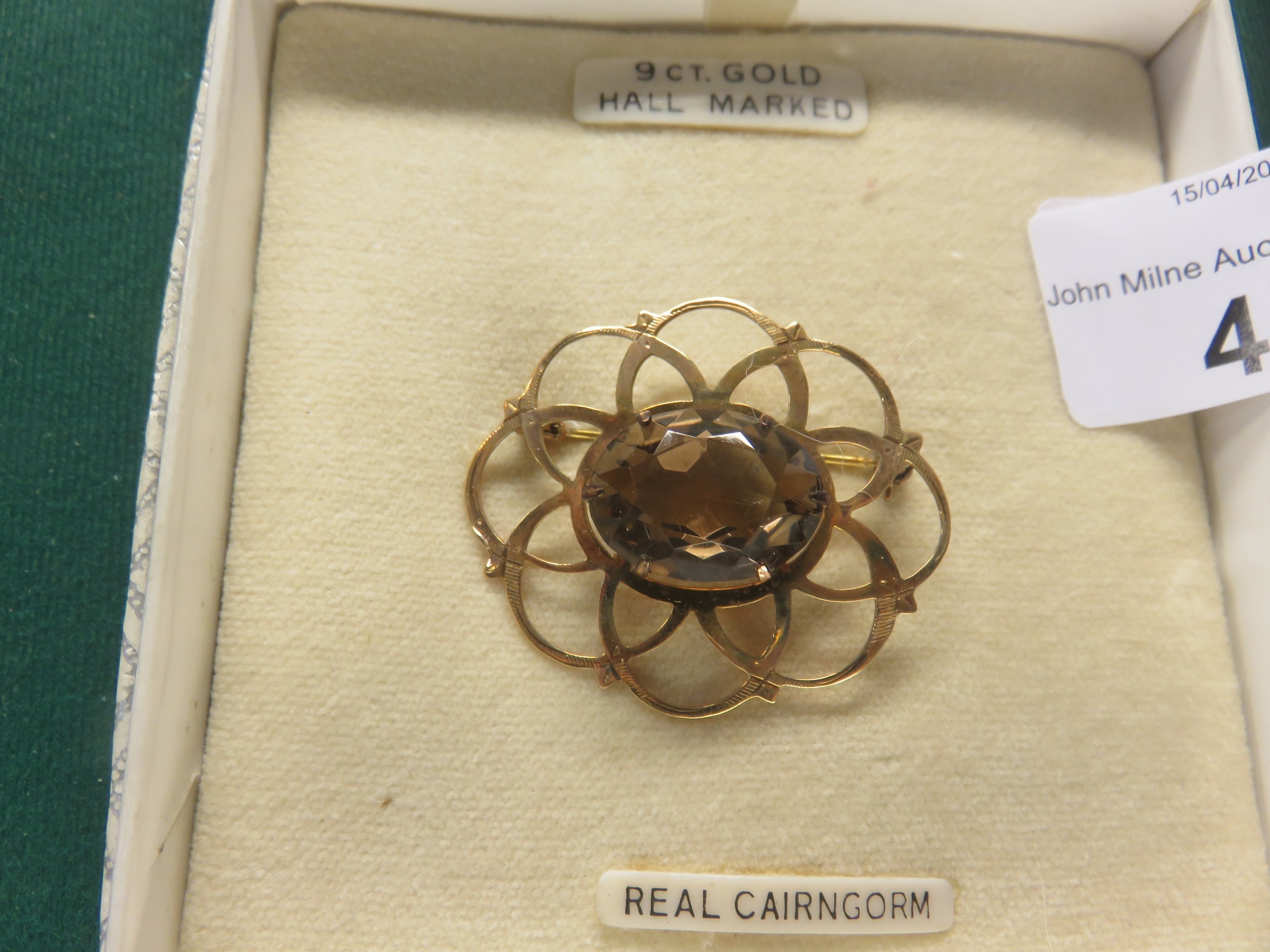 9ct Gold Openwork Brooch Set with Cairngorm Stone