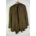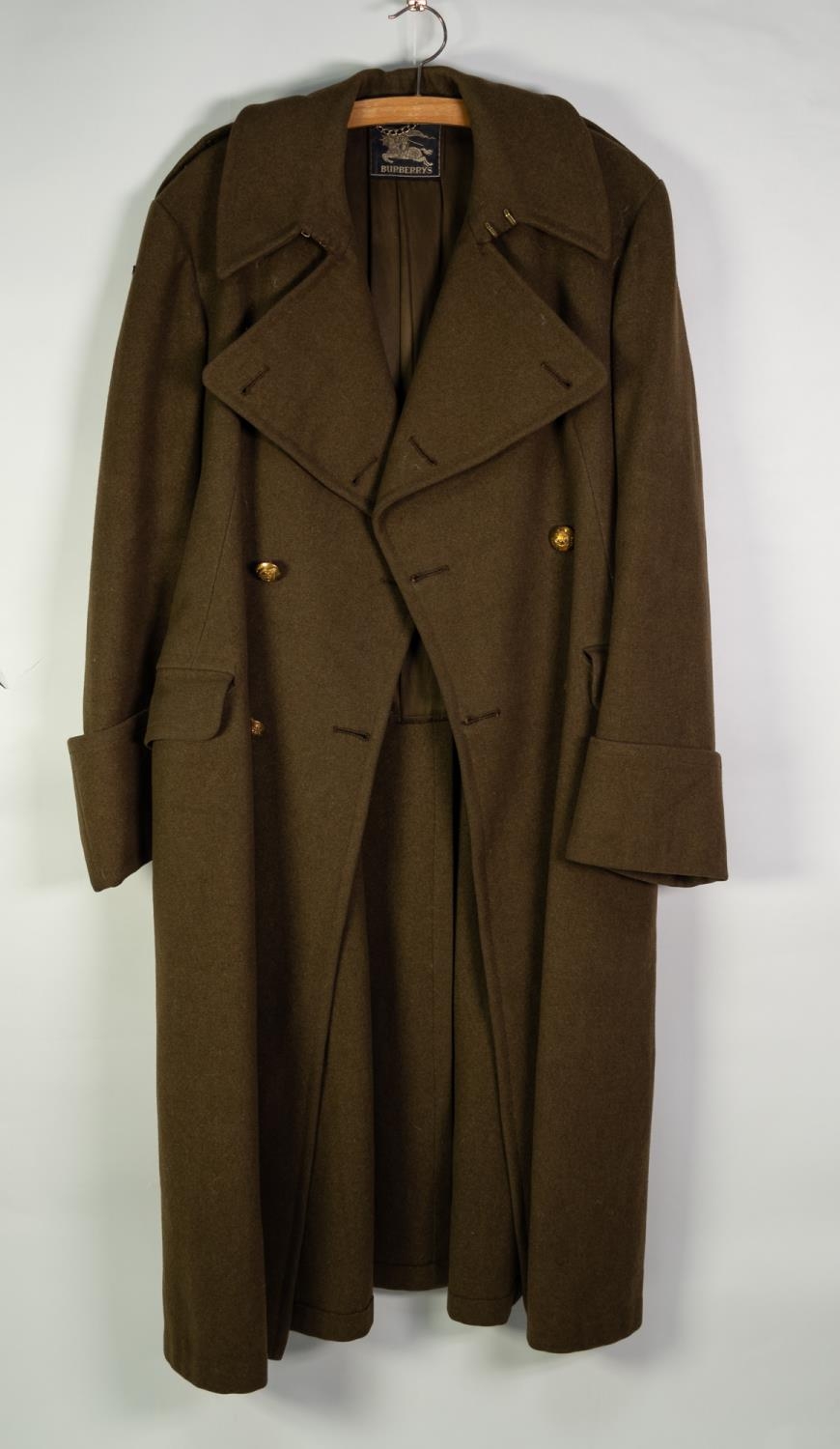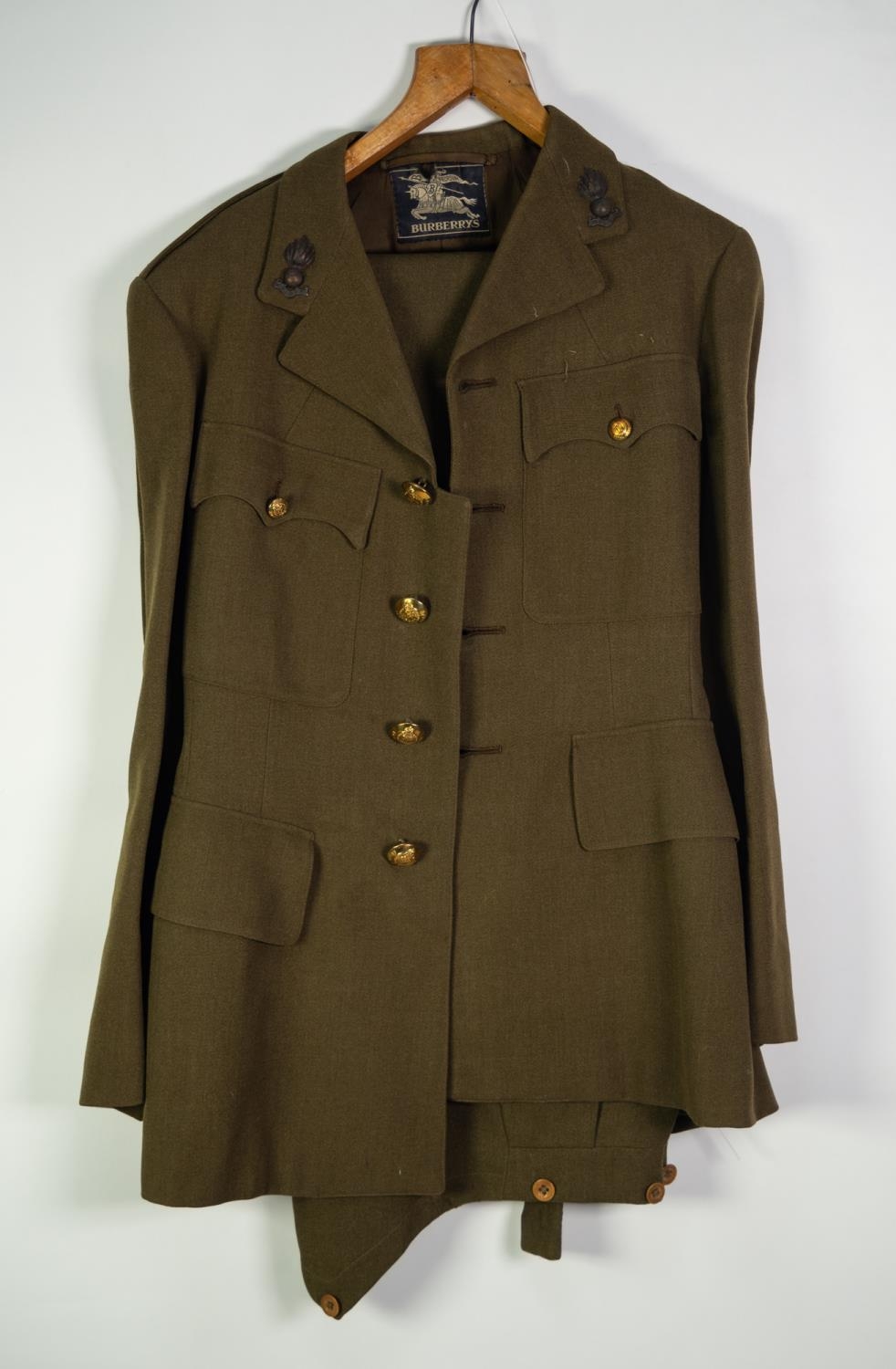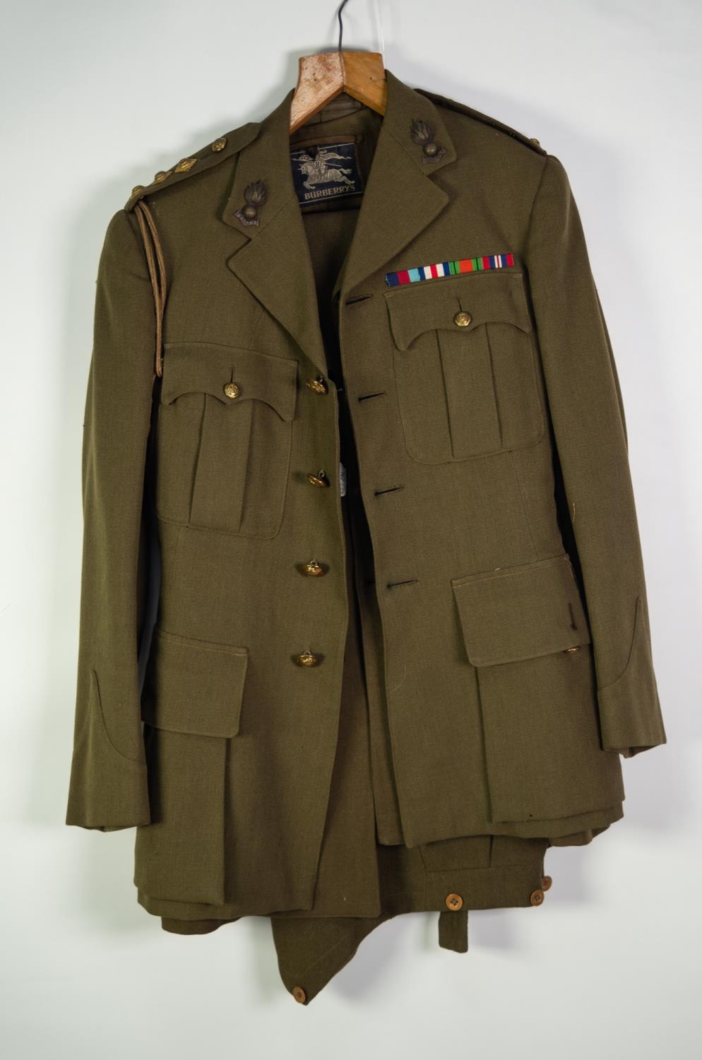 BURBERRY ARMY OFFICER'S KHAKI UNIFORM, viz jacket, waistcoat and trousers and the BURBERRY GREATCOAT with Royal Artillery 'Ubique' buttons and lapel badges and a BROOCH OF MEDAL RIBBONS