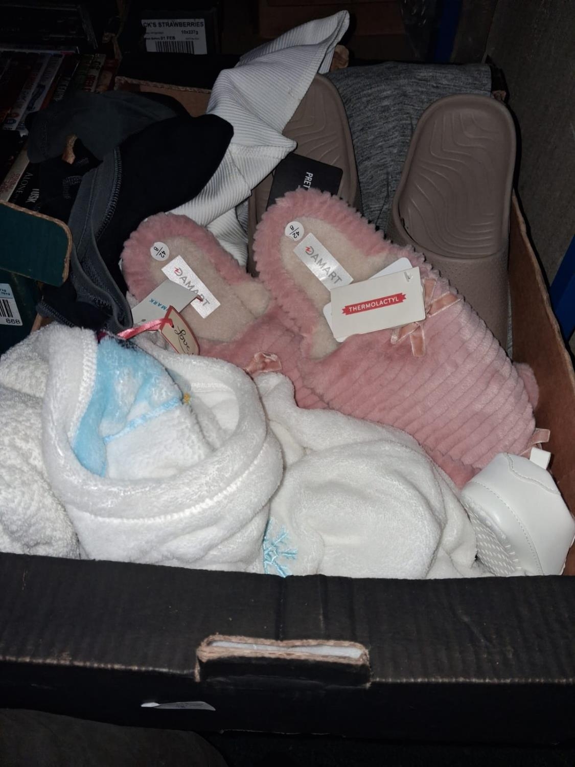 Box Of Clothes, Towels, Slippers Etc