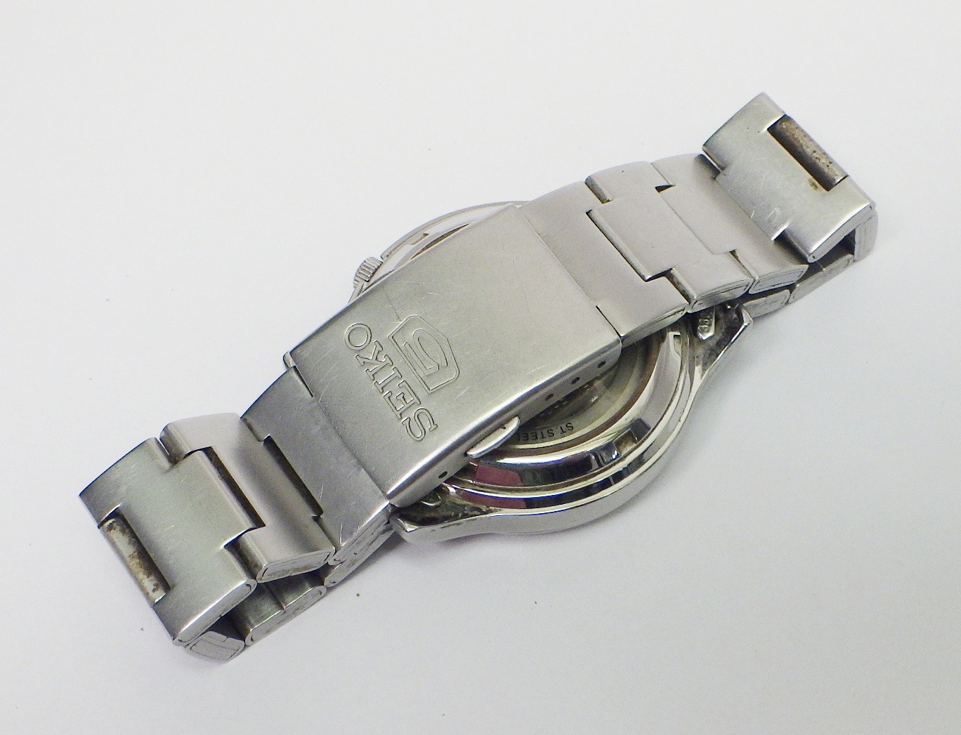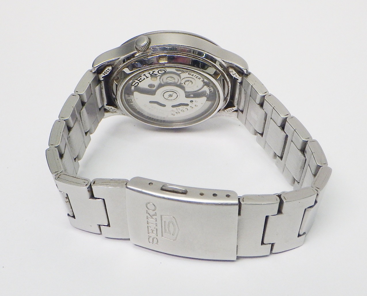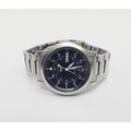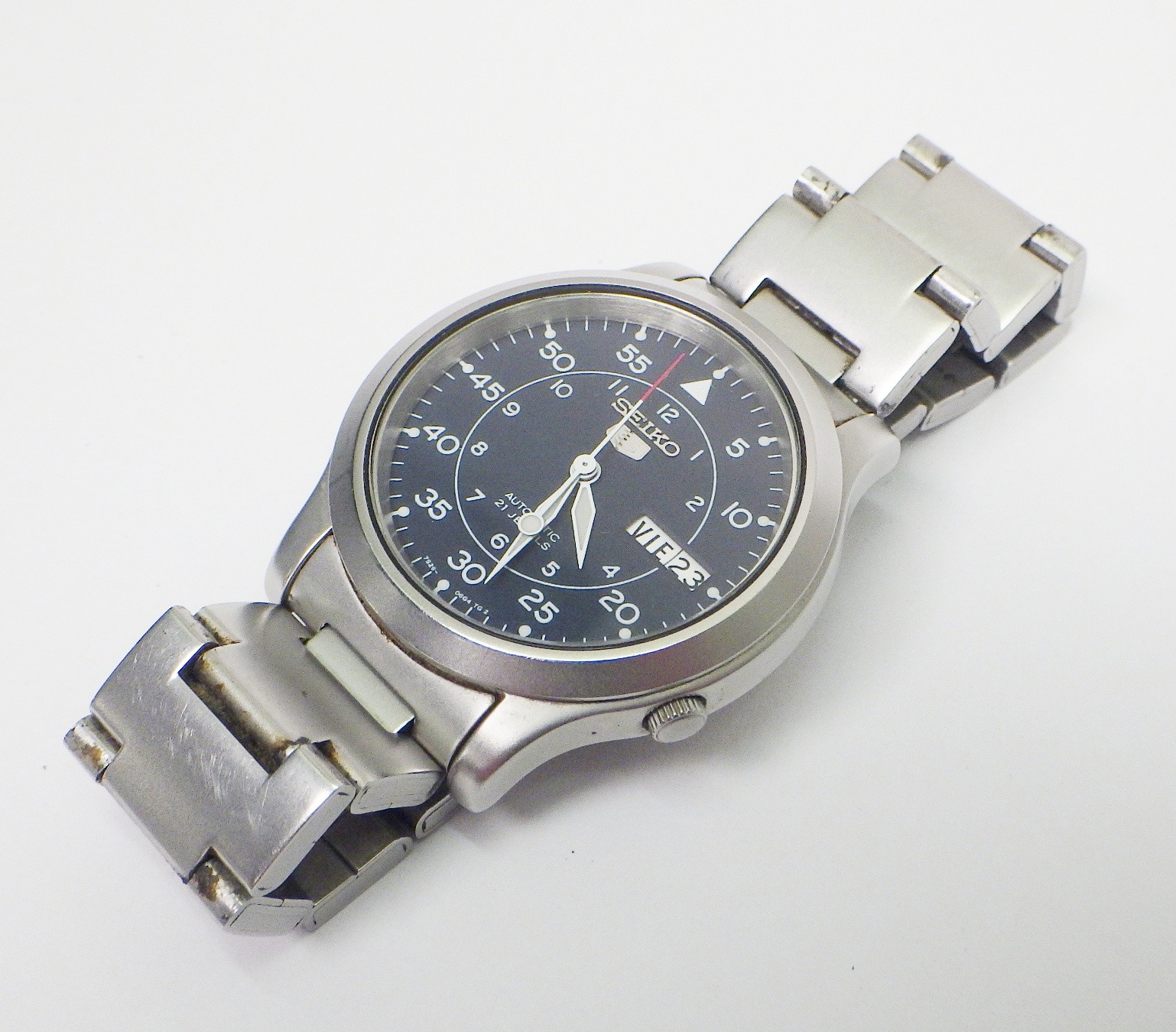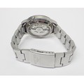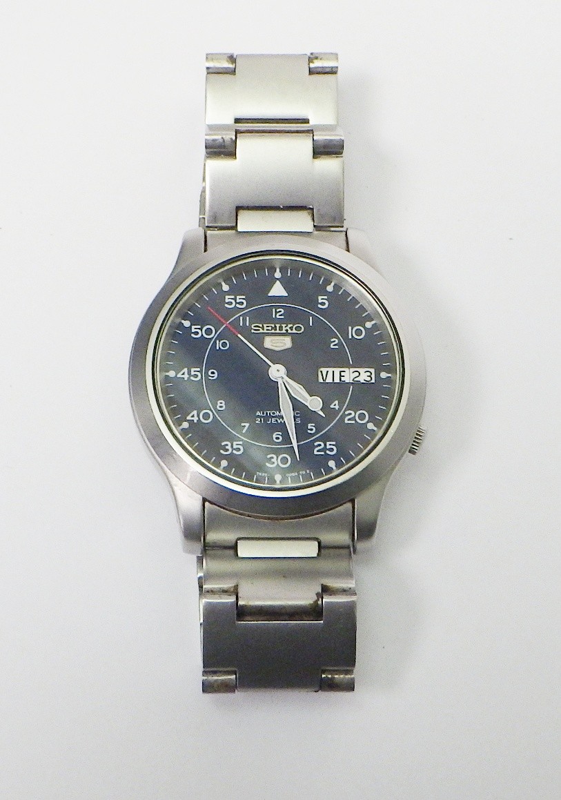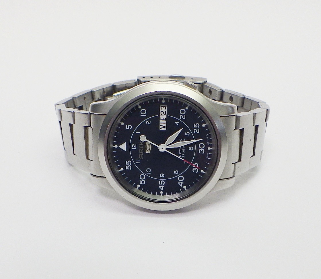 A Seiko 5 automatic 7S26 - 02J0 bracelet watch having a military / field style dial in blue. 37mm across the case / 42mm lug to lug