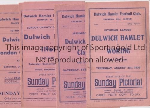 DULWICH HAMLET Four home programmes v Woking 31/8/1933, team changes, Clapton 10/2/1934, small hole, Ilford 26/9/1936, London Charity Cup and London Caledonians 24/10/1936