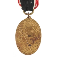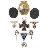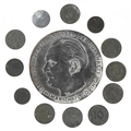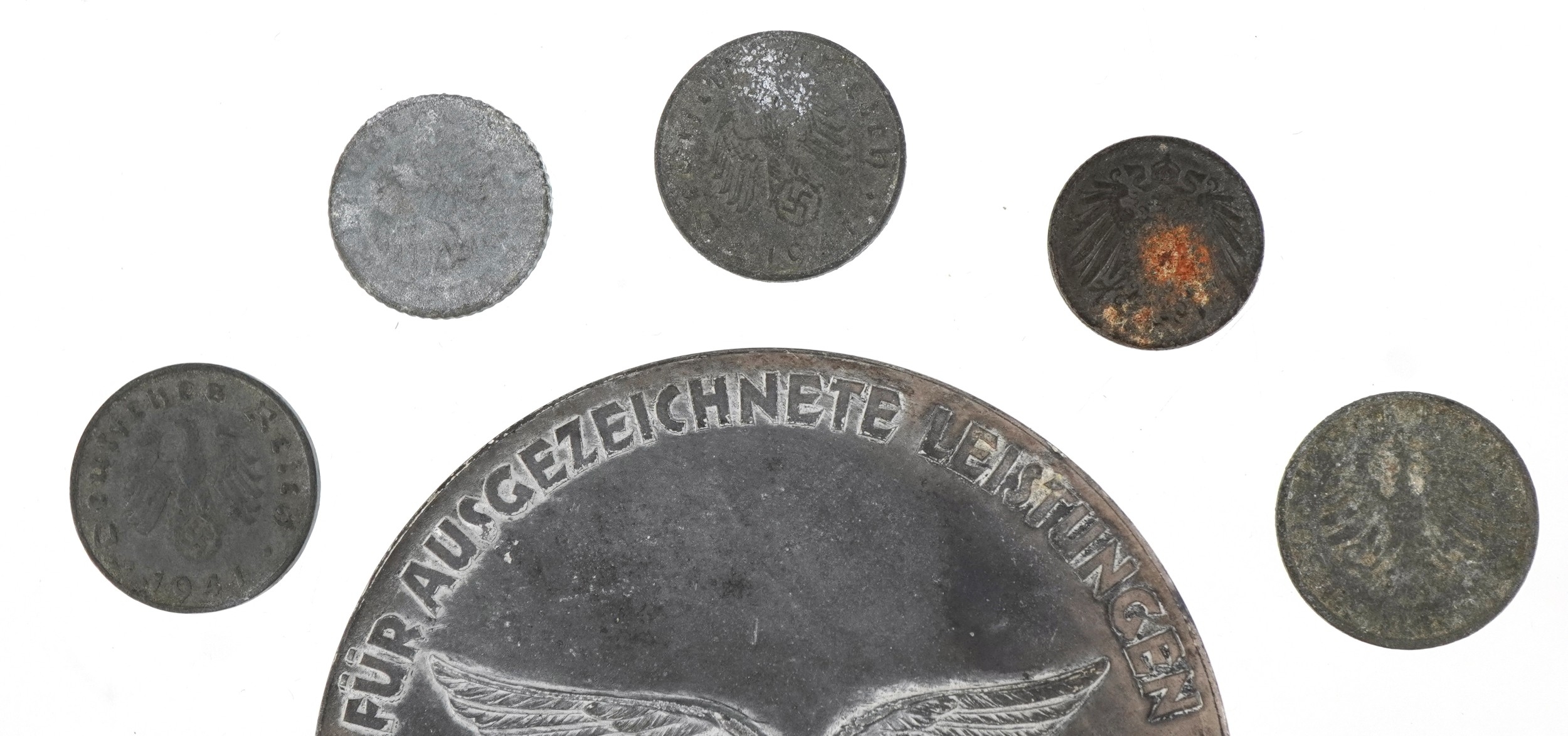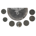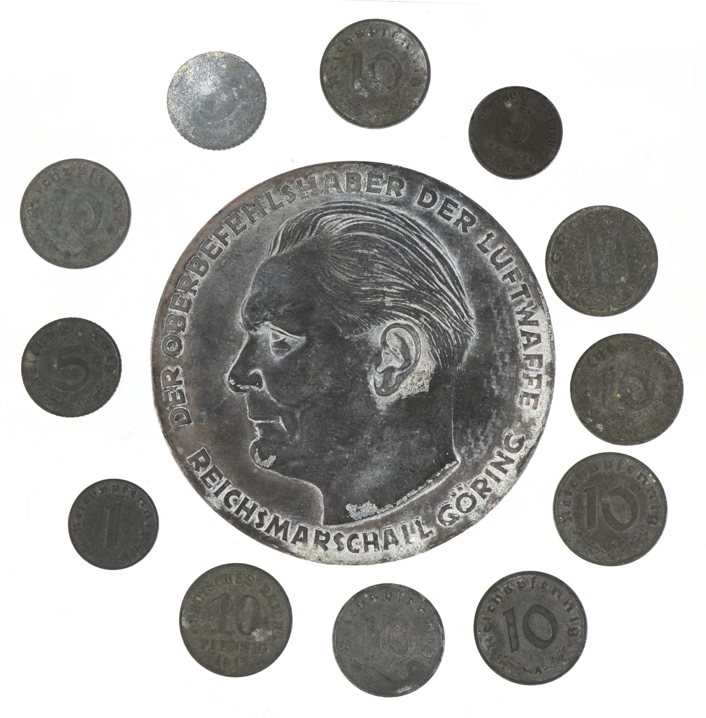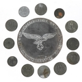 A German military interest World War II Hermann Göring medal with a selection of German coins, the medal 7.5cm in diameter.