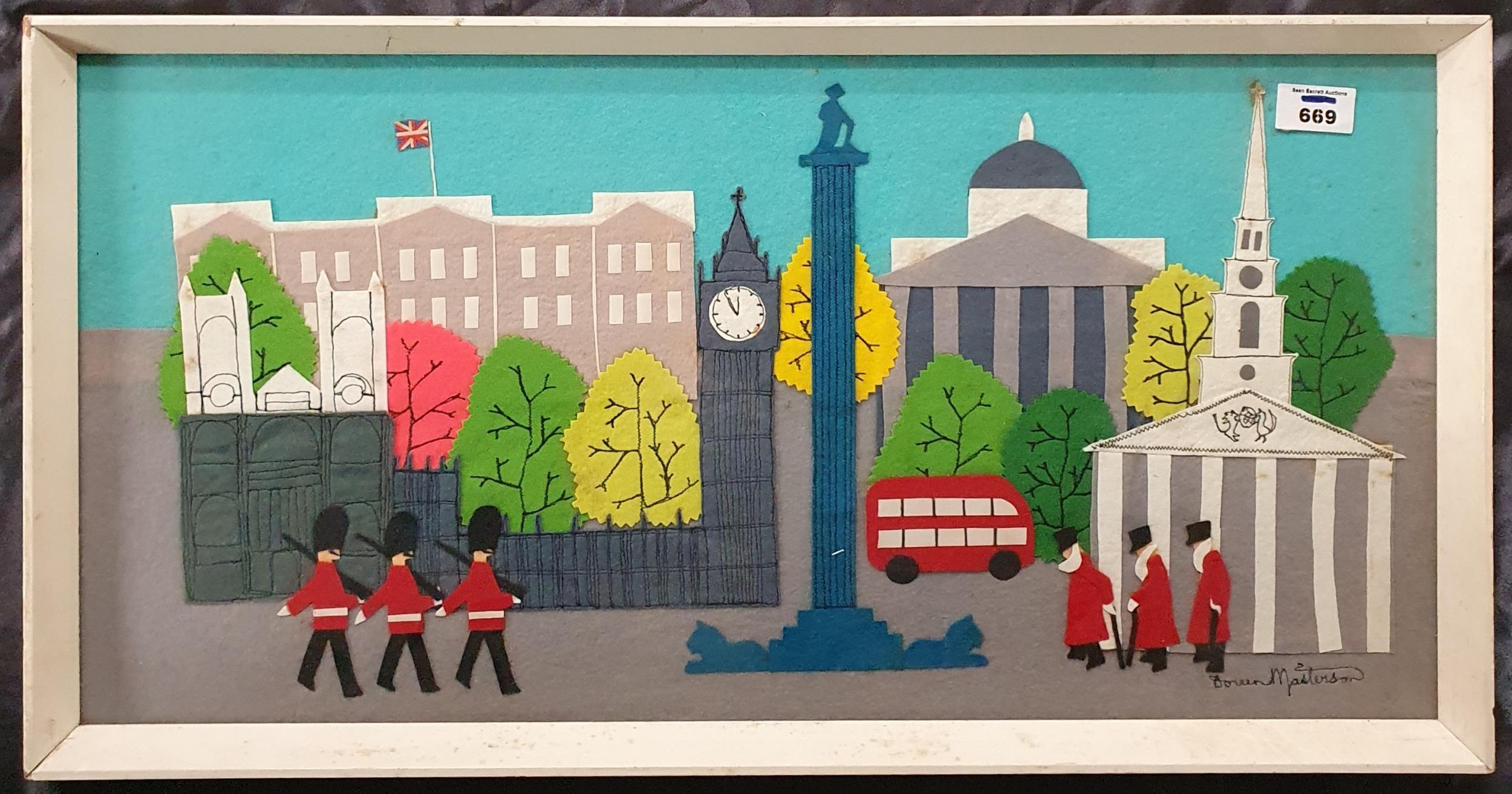 A mixed media Collage of London Landmarks by Doreen Masterson.