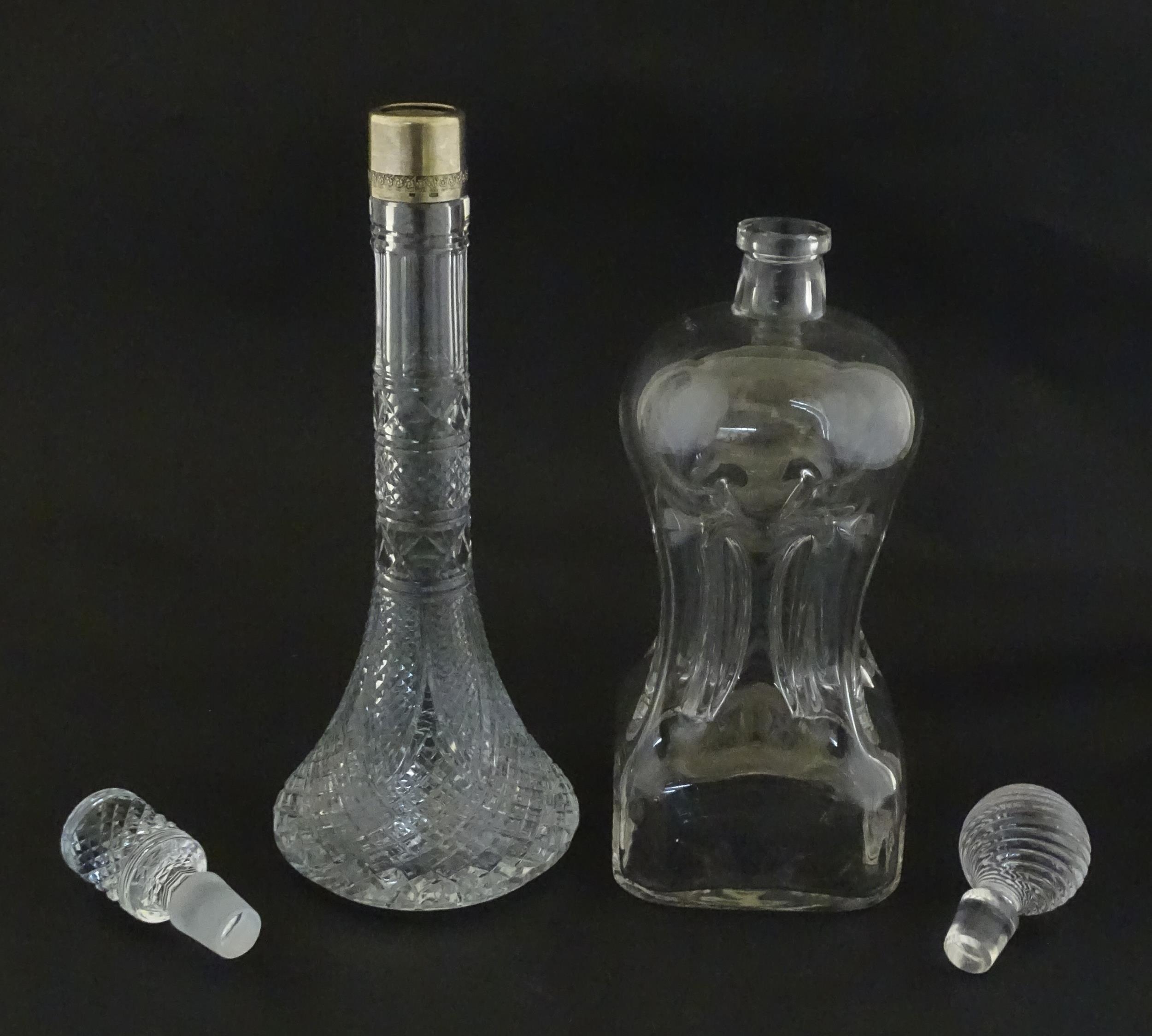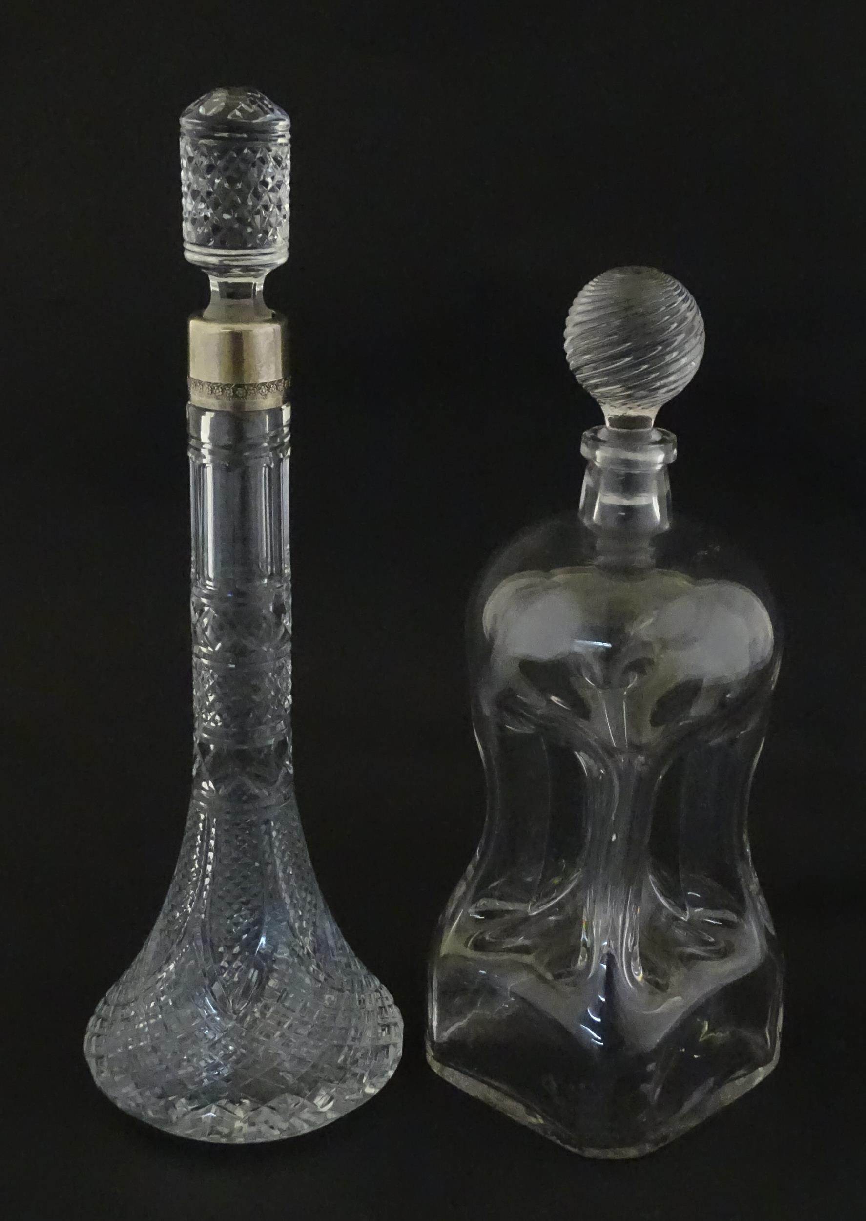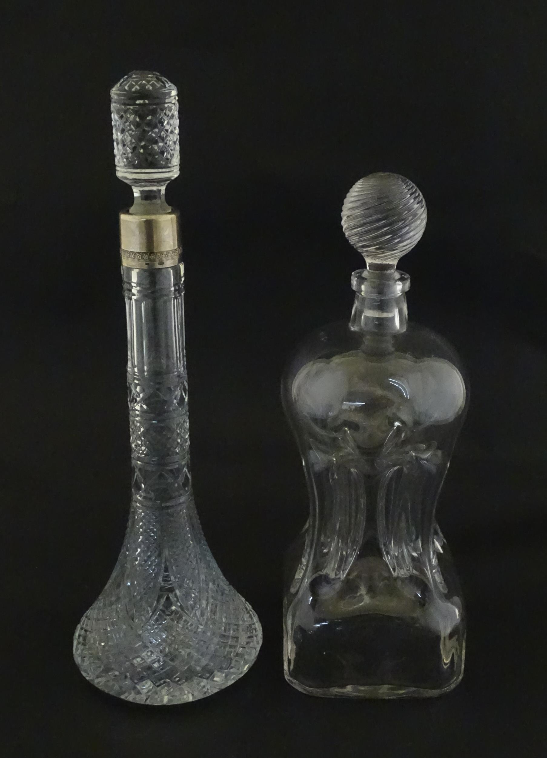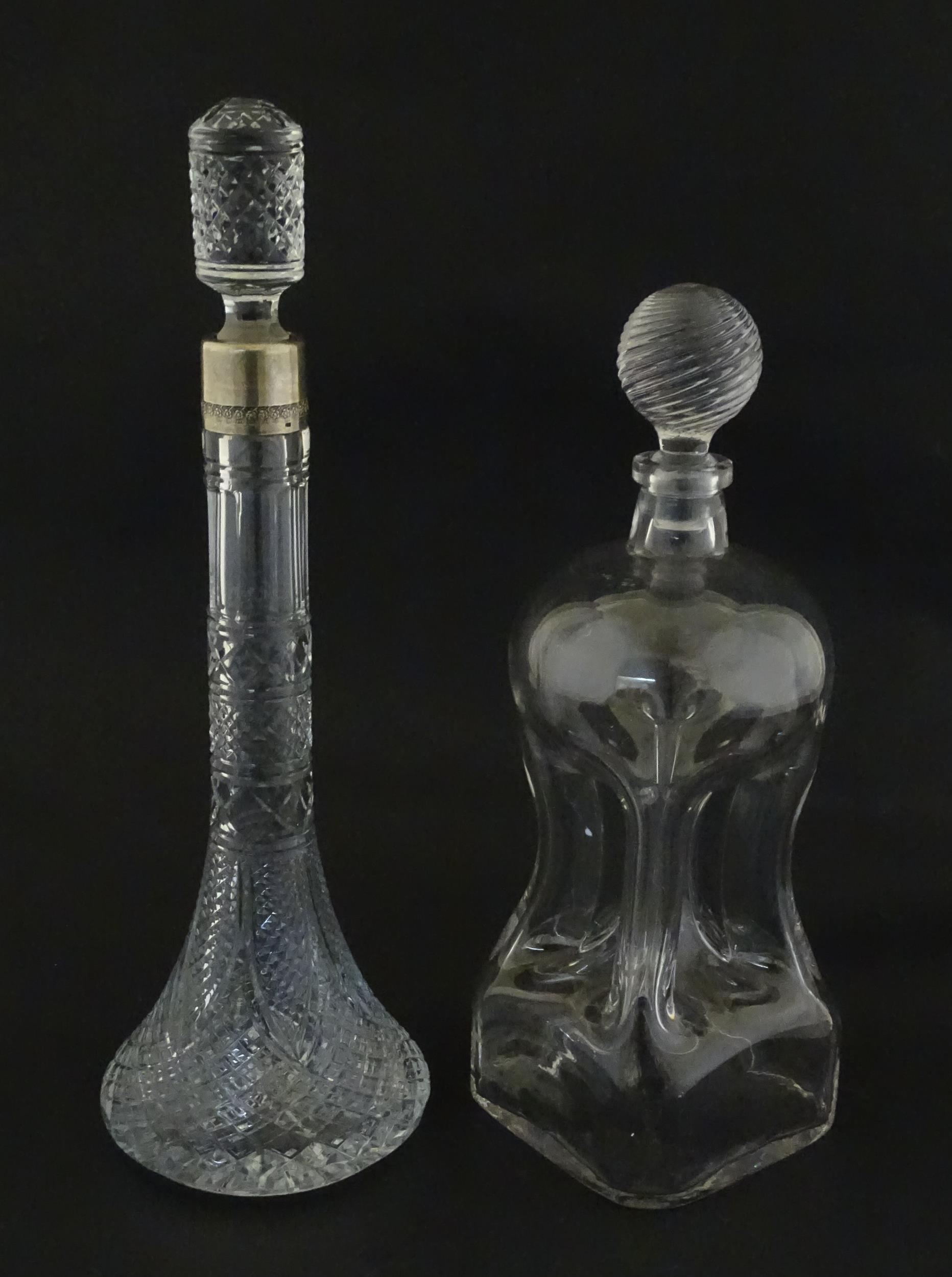 Two decanters, one with Russian silver collar, the other with pinch detail. The tallest approx 13" high