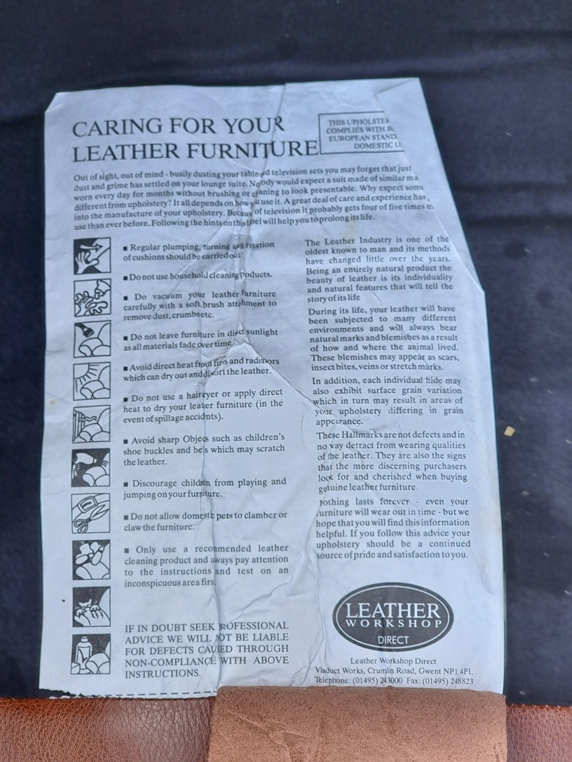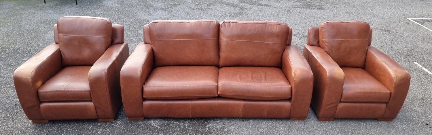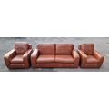 A tan leather three-piece suite, the sofa 190cm wide x 98cm deep. (3)