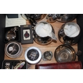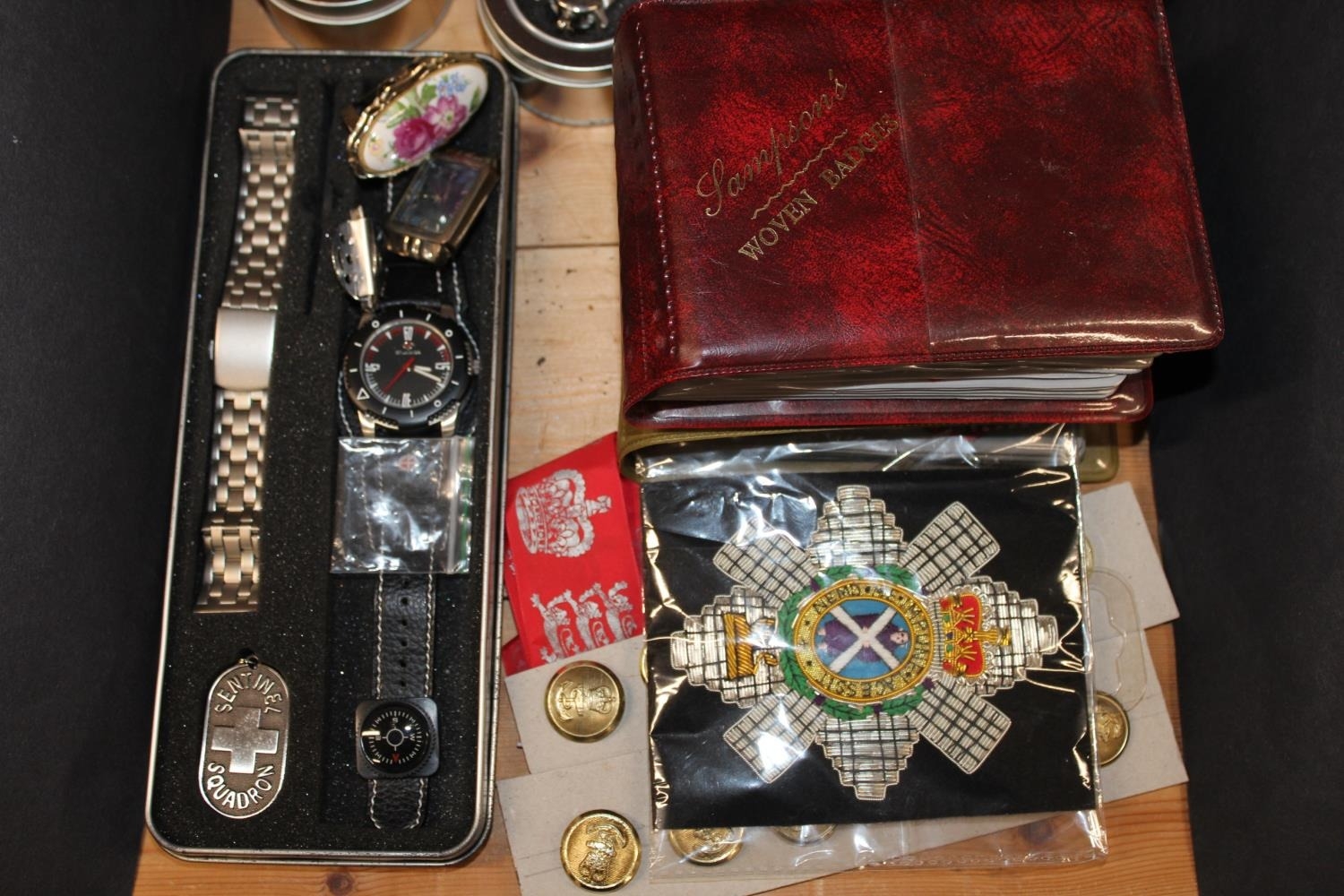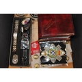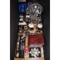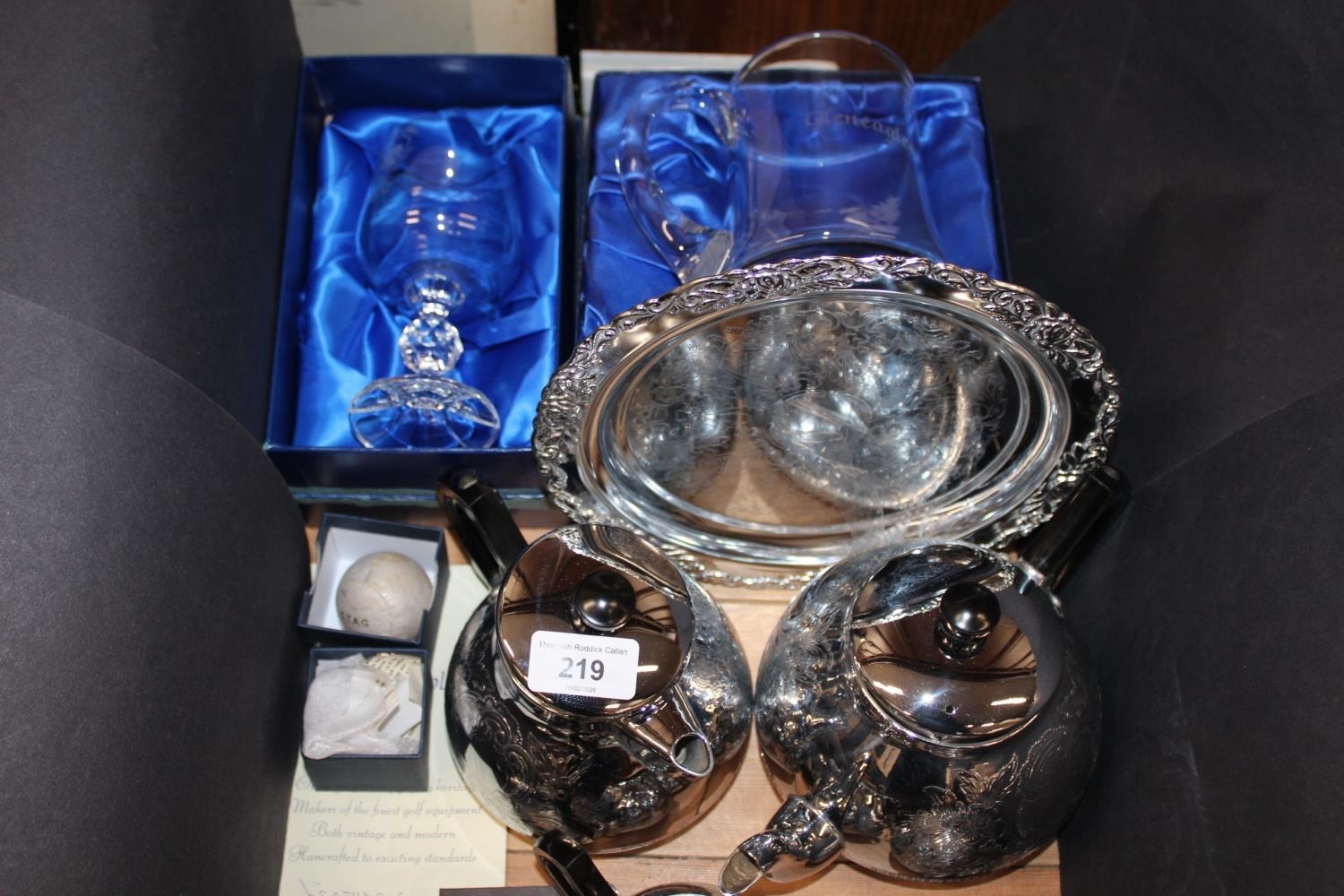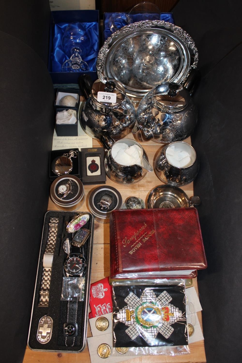 Gleneagles golfing tankard, an Old Course Golf Country Club & Hotel commemorative goblet, boxed, a St Andrews Golf Company replica feathery golf ball, a four piece silver-plated teaset, naval buttons, cloth badges, a wristwatch, etc.