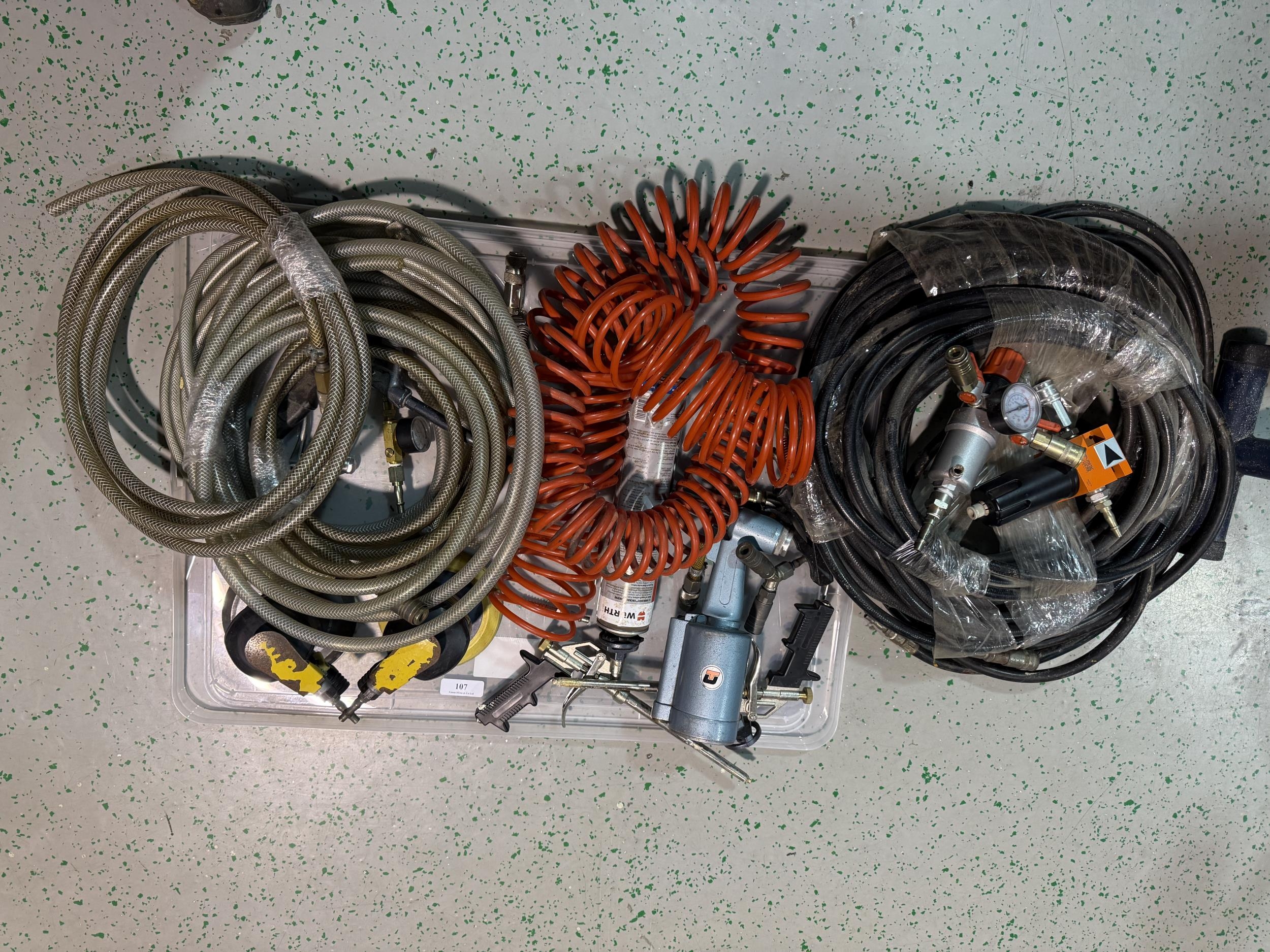 Assorted pneumatic power tools, airline, regulators, fittings etc.