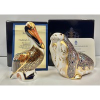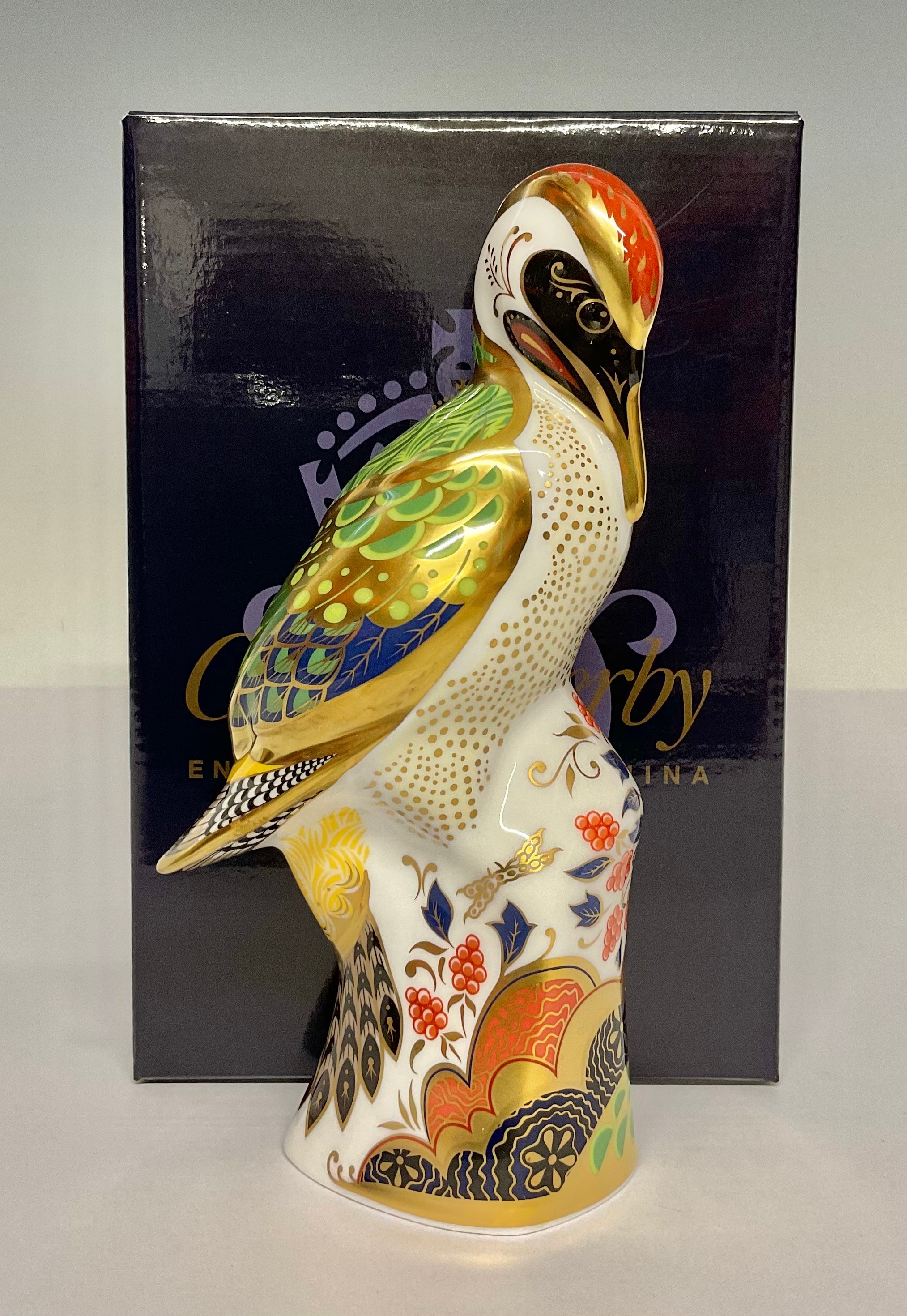 A Royal Crown Derby paperweight, Green Woodpecker, gold stopper, 17.5cm, printed mark in red, boxed