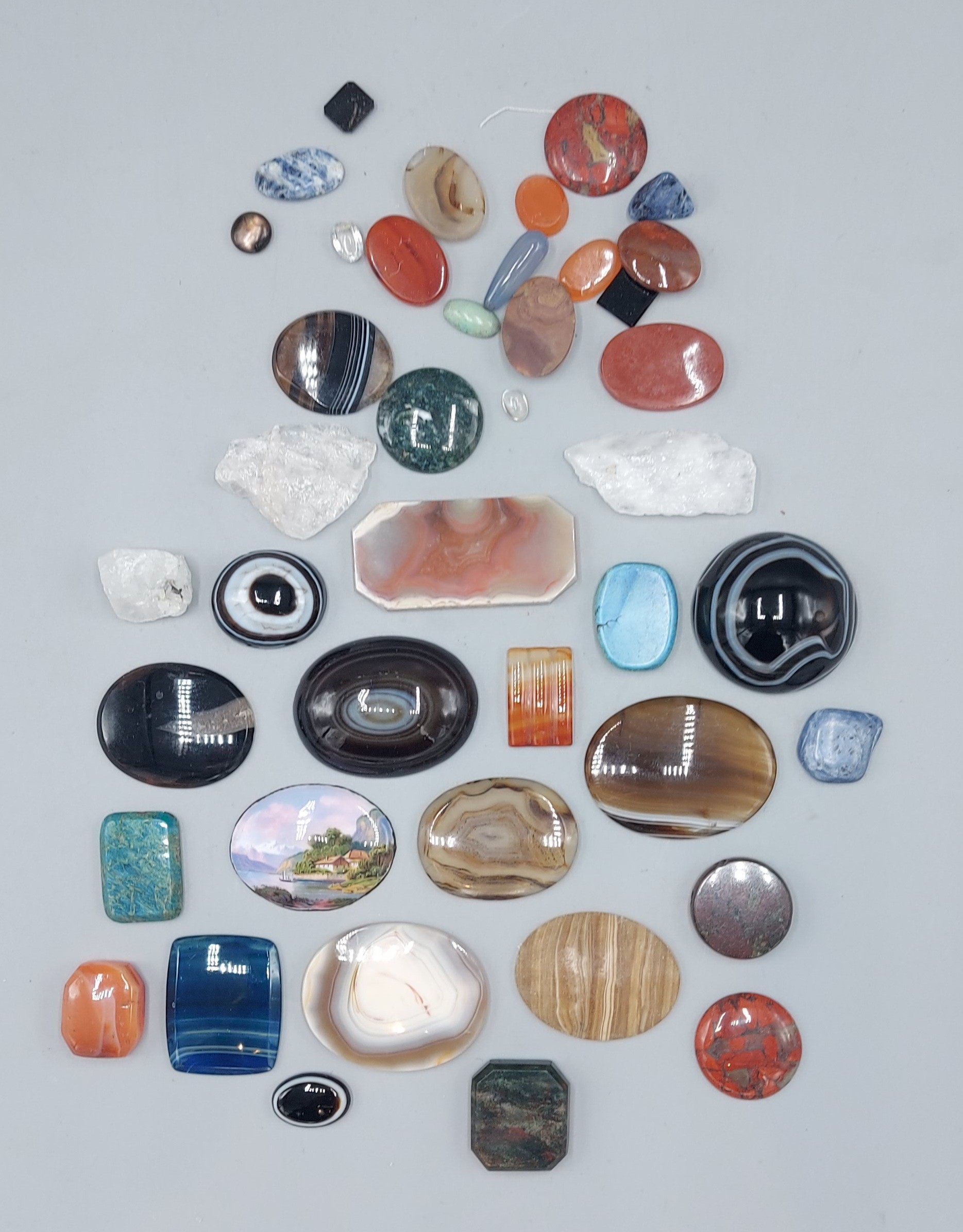 A small oval enamel plaque, lake scene together with a collection of polished stones